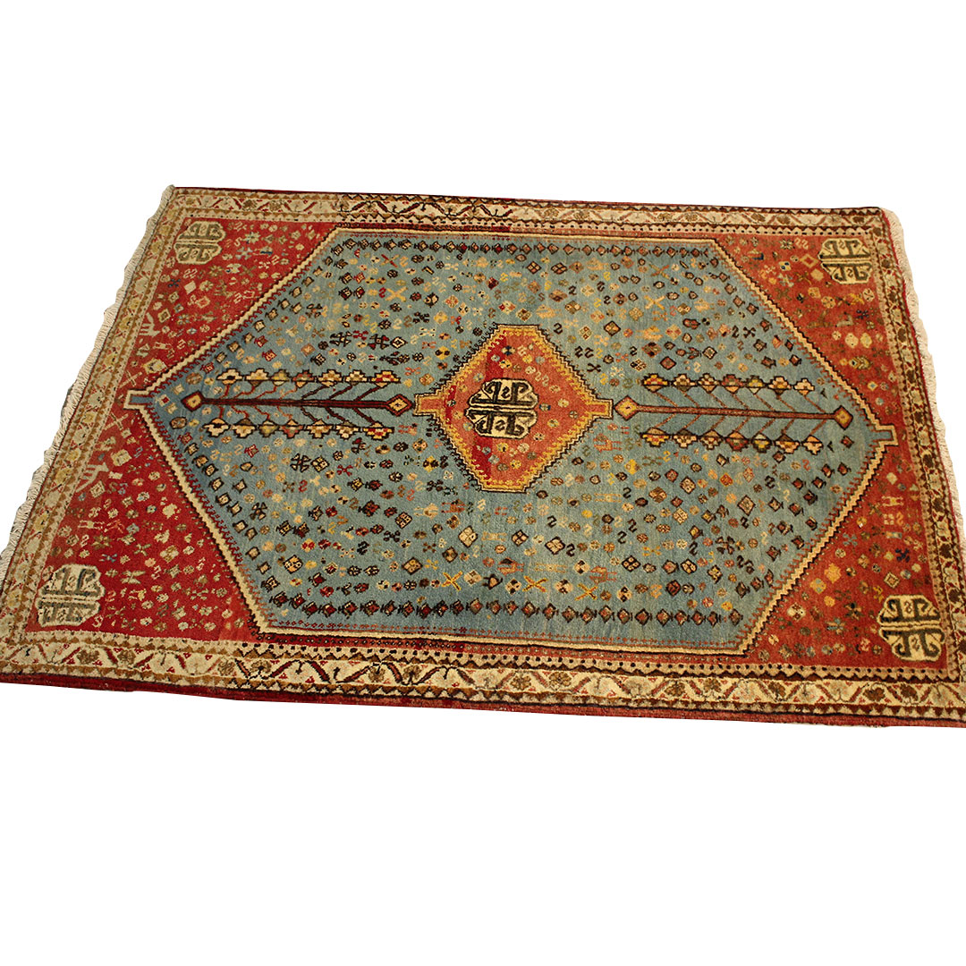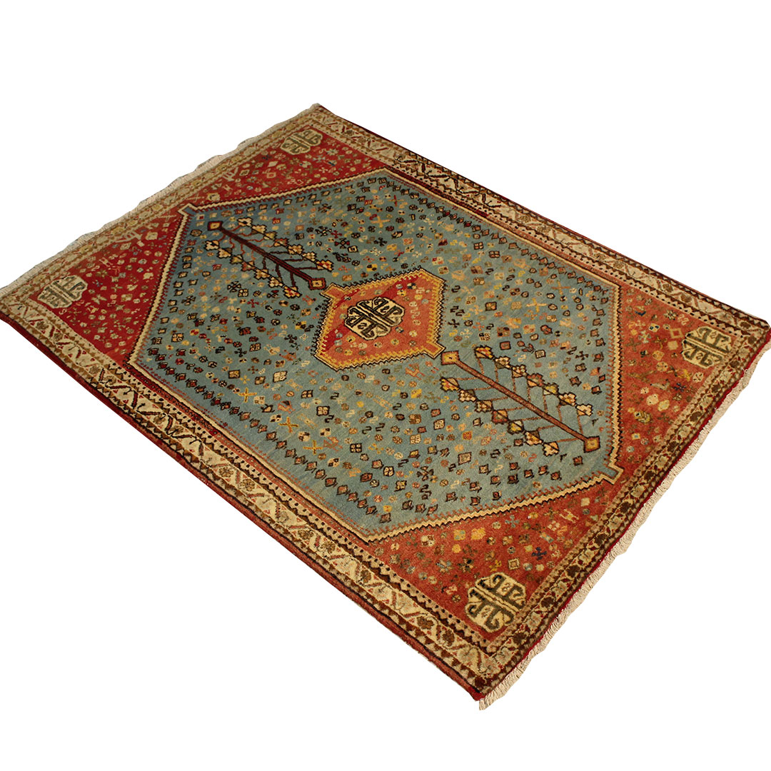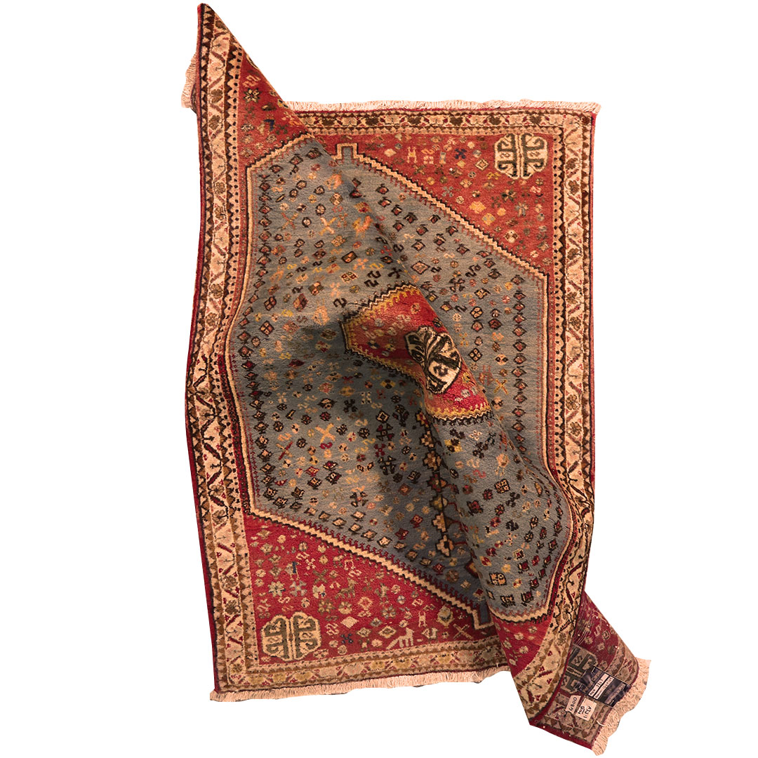 فرش دستبافت قشقایی به شکل مستطیل ودر ابعاد: 140 سانتیمترمربع و عرض: 105 سانتیمترمربع بافته شده است،