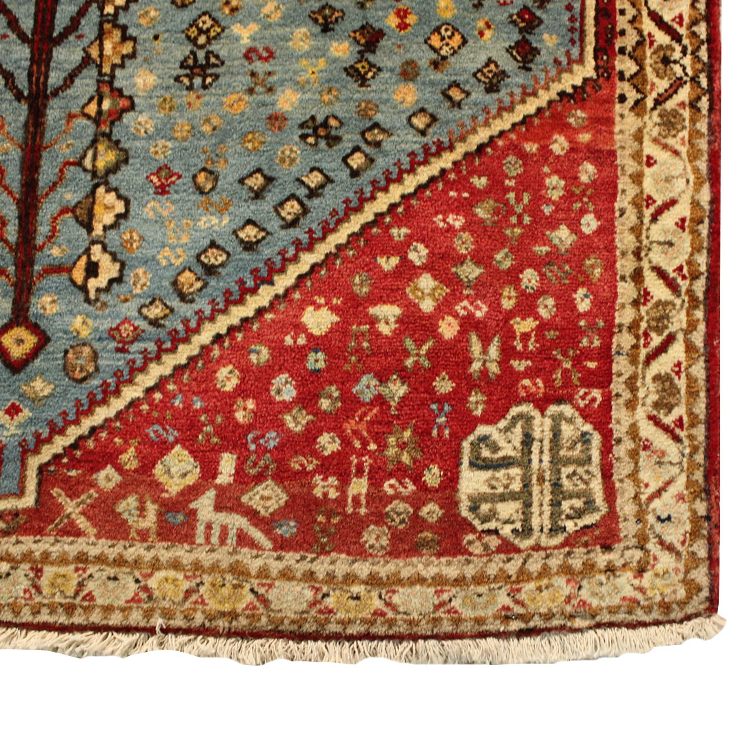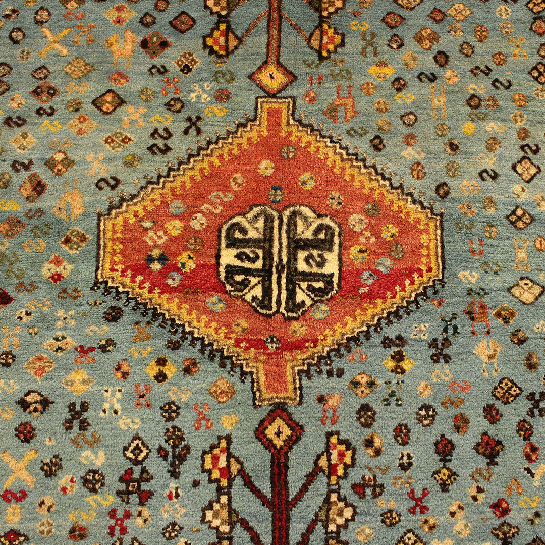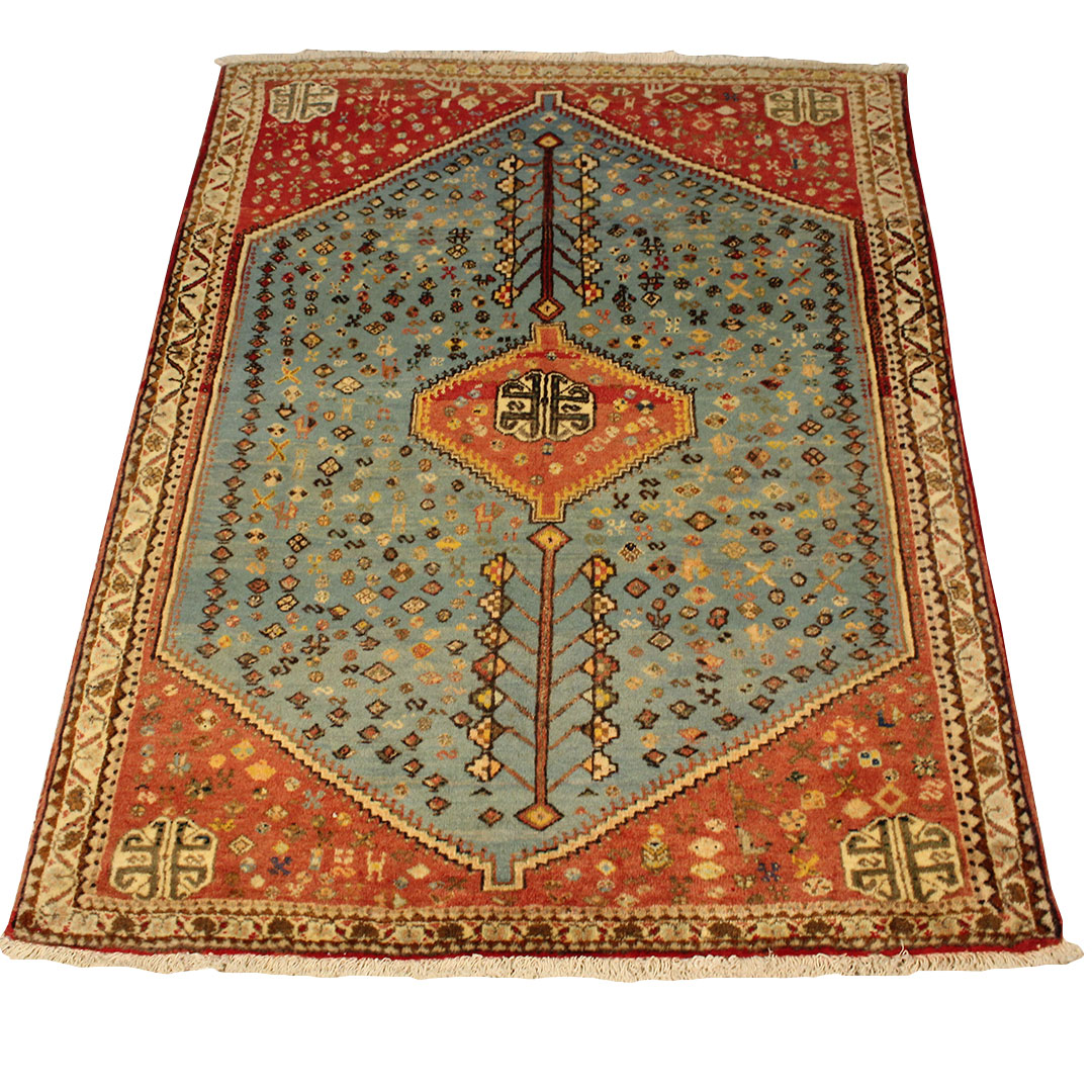 فرش دستبافت قشقایی به شکل مستطیل ودر ابعاد: 140 سانتیمترمربع و عرض: 105 سانتیمترمربع بافته شده است،