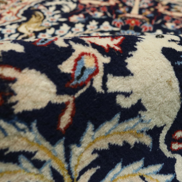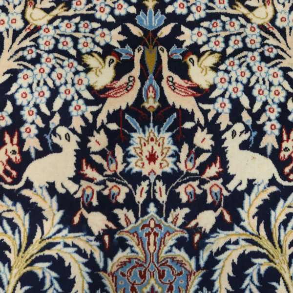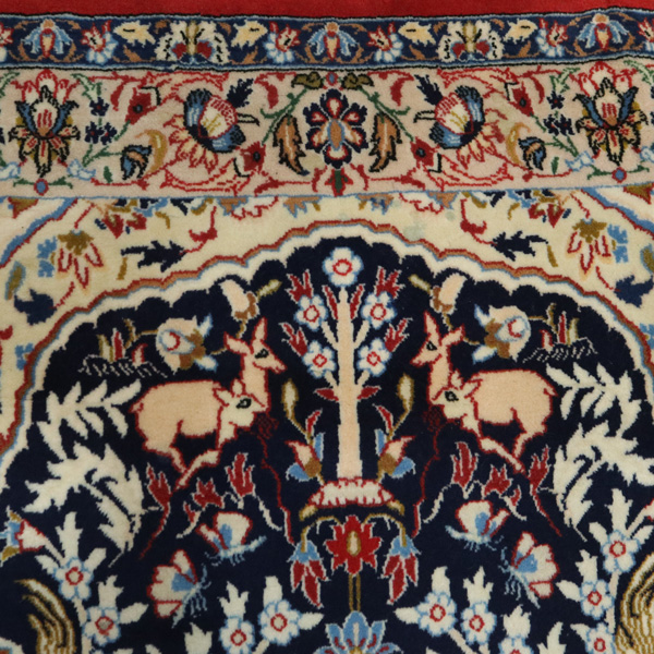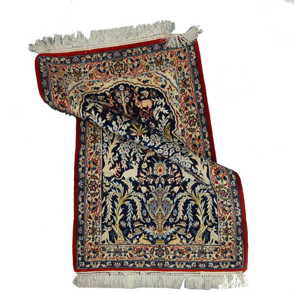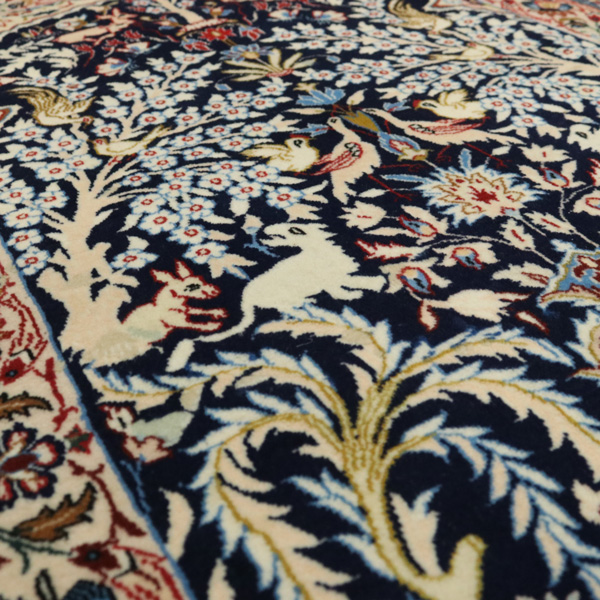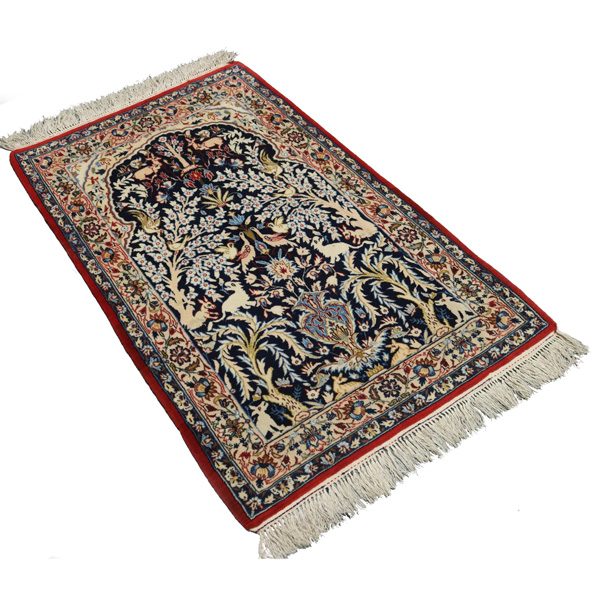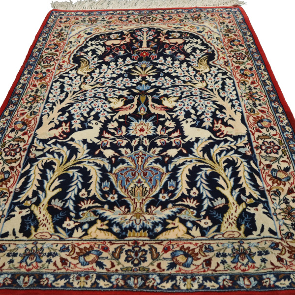 ضخامت این قالیچه فرش دستبافت اصفهان (68×106) و ضخامت 0.3 میلیمتر از جنس کرک و ابریشم و طرح درختی است.