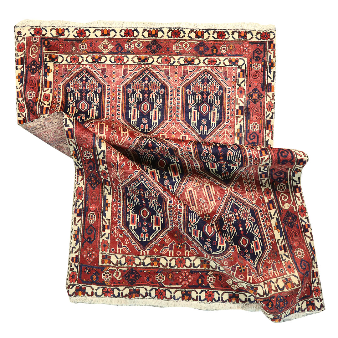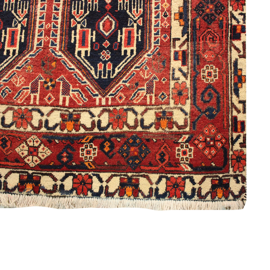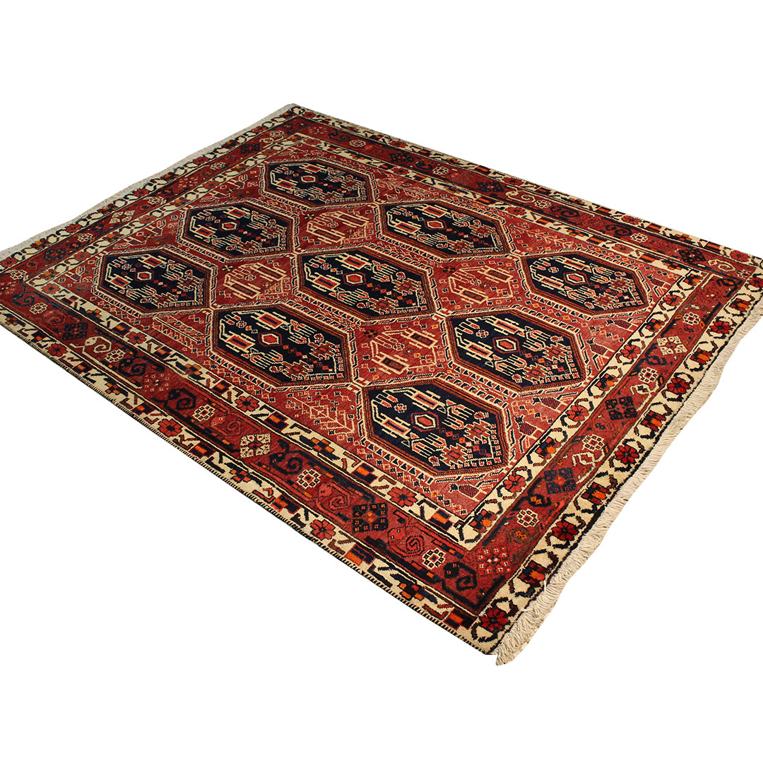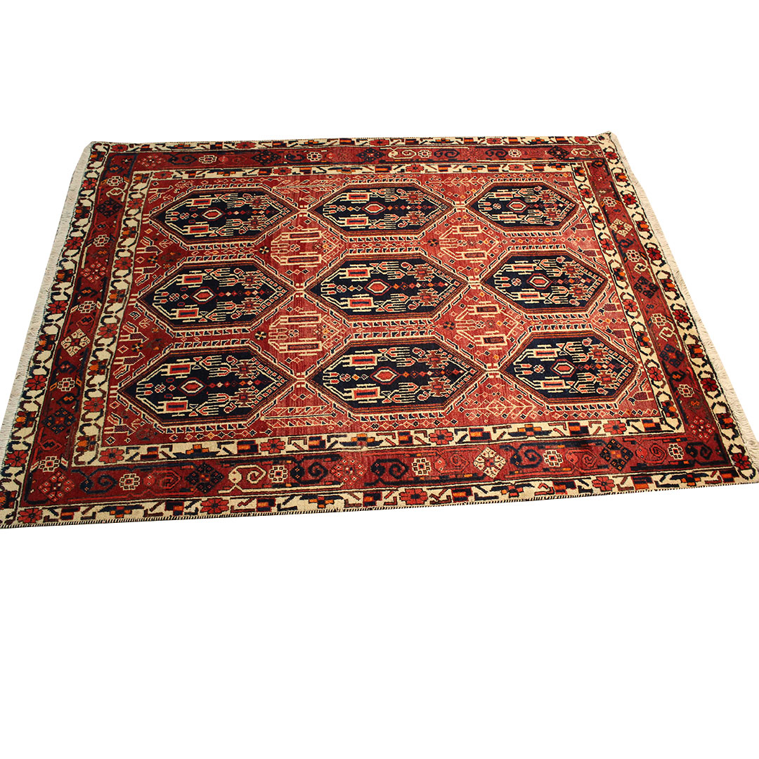 کد فرش:1062 -فرش دستبافت افشار به شکل مستطیل ودر ابعاد: 232سانتیمترمربع و عرض:157 سانتیمترمربع در شهرستان بابک بافته شده است،جنس چله فرش از نخ و جنس پودها از پشم میباشد ،رنگ زمینه فرش لاکی و رنگ حاشیه سورمه ای است ،رنگها گیاهی و ثابت است در اثر شستشو دچار تغییر رنگ و پس دادن و پخش شدن رنگ در فرش نمیشود،مساحت که فرش در منزل شما اشغال میکند 3.6متر مربع میباشد،ضخامت و قطر آن در حدود ۱2میلی متر ودارای وزن 8کیلوگرم است،در بافت فرش از نقوشهندسی و سراسر استفاده شده و طرح خاص و بی نظیر میباشد .نحوه ی رنگرزی سنتی با استفاده از رنگهای گیاهی طبیعی و ارگانیک میباشد،و همین امر فرش را خوش رنگ و باکیفیت کرده است.