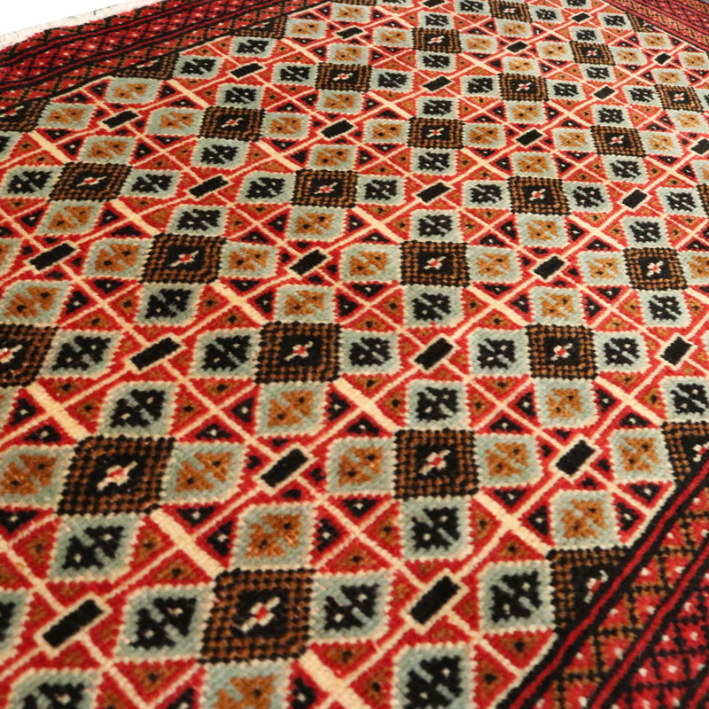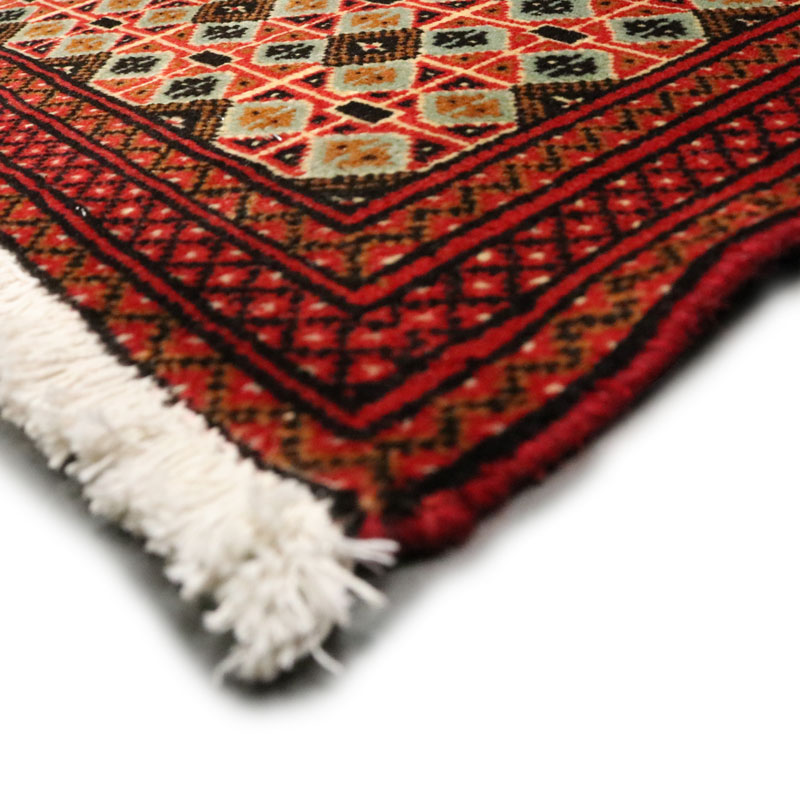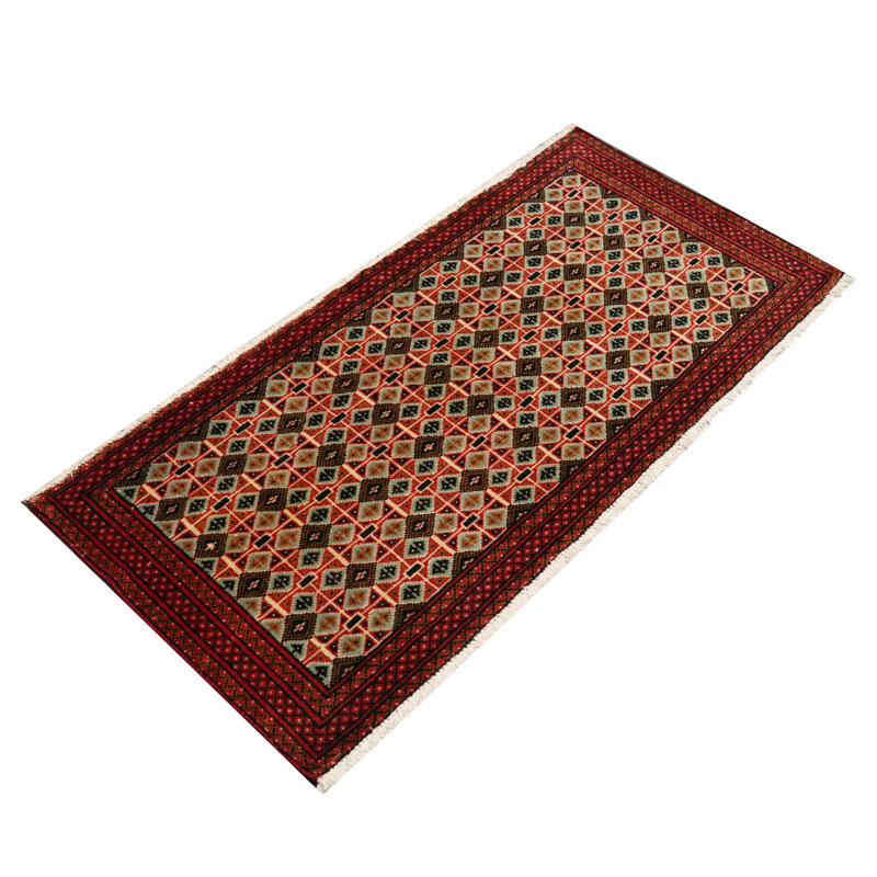 رنگ حاشیه فرش دستبافت ترکمن (64×132) سانتیمتر لاکی و حاشیه کرم با طرح سراسر هندسی از جنس پشم و کتان مرغوب است.
