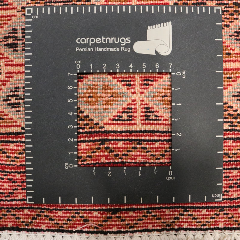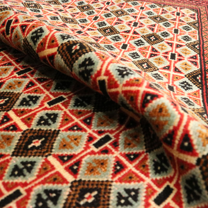 فرش دسبافت ترکمن با مساحت 0.84 متر مربع و وزن 2.95 کیلوگرم و ضخامت 1 میلیمتر با رنگ متن کرم میباشد .