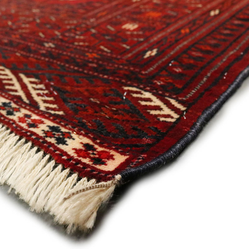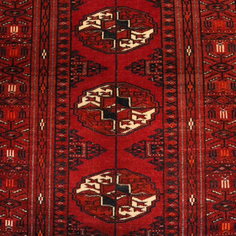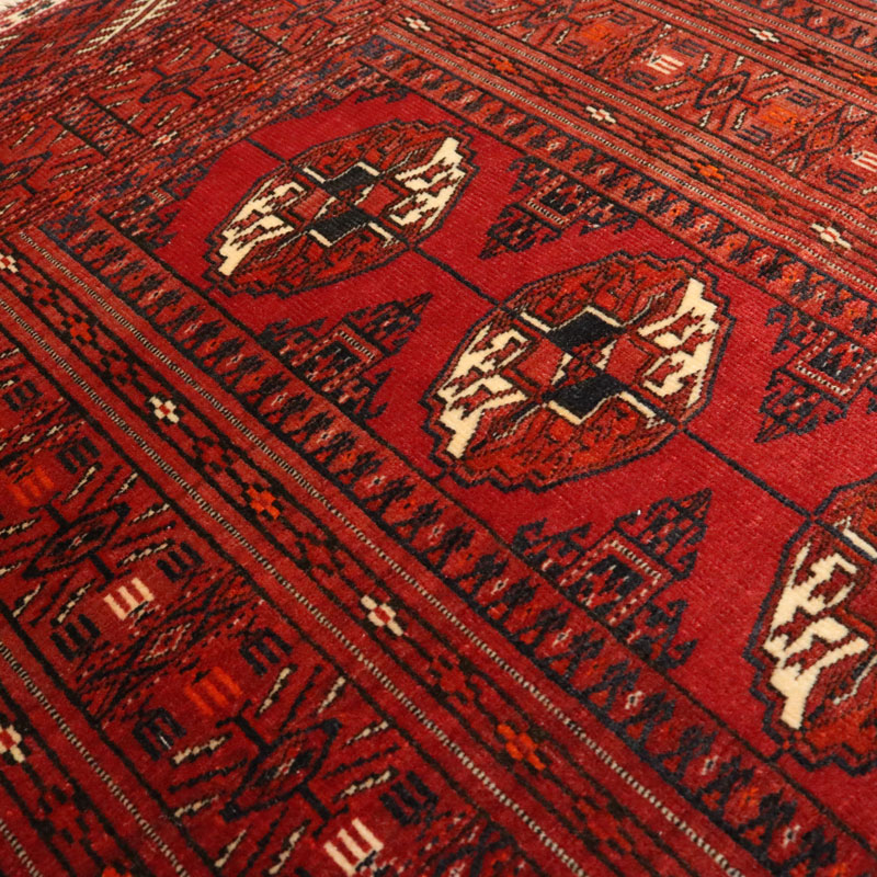 فرش دسبافت ترکمن با مساحت 0.9 متر مربع و وزن 3.16 کیلوگرم و ضخامت 2 میلیمتر با رنگ زمینه و حاشیه لاکی است.