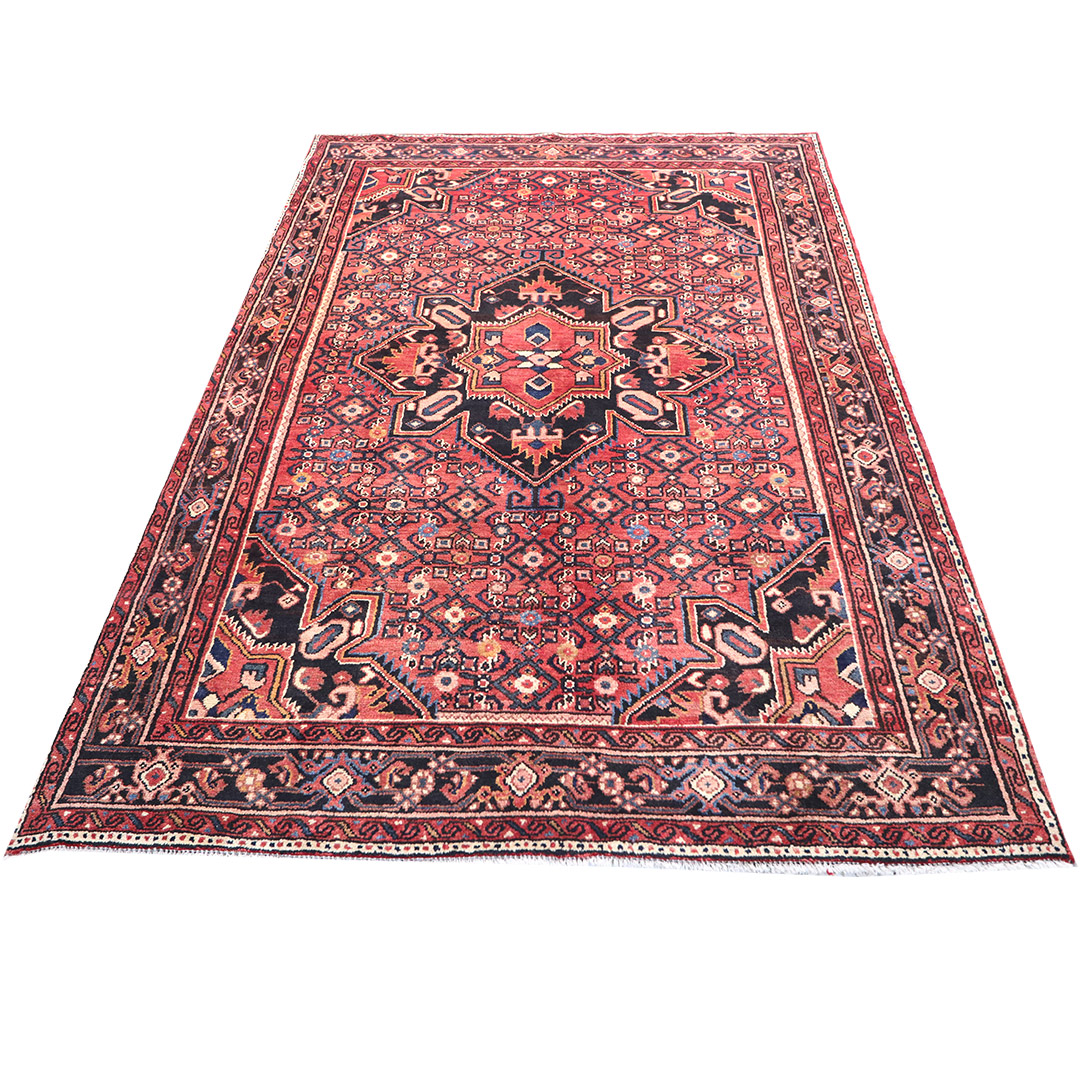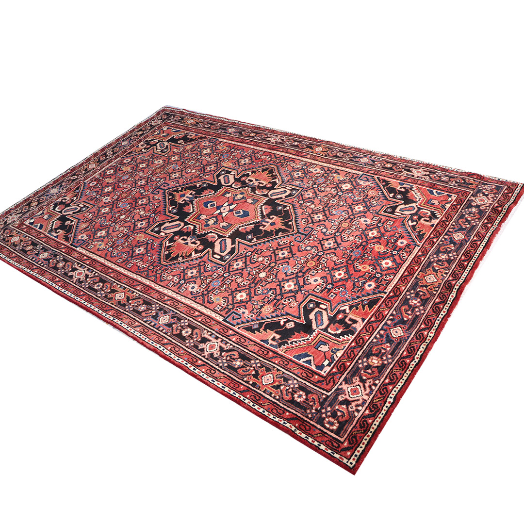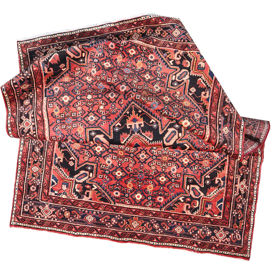 کد فرش:1796 -فرش دستبافت حسین آباد به شکل مستطیل ودر ابعاد: 233سانتیمترمربع و عرض:160 سانتیمترمربع در شهرستانحسین آباد بافته شده است،جنس چله فرش از نخ و جنس پودها از پشم میباشد ،رنگ زمینه فرش سورمه ای و رنگ حاشیه سورمه ای است ،رنگها گیاهی و ثابت است در اثر شستشو دچار تغییر رنگ و پس دادن و پخش شدن رنگ در فرش نمیشود،مساحت که فرش در منزل شما اشغال میکند 3.72متر مربع میباشد،ضخامت و قطر آن در حدود ۱۵میلی متر ودارای وزن ۱۰کیلوگرم است،در بافت فرش از نقوش طبیعت و گل و بوته استفاده شده و طرح خاص و بی نظیر میباشد .نحوه ی رنگرزی سنتی با استفاده از رنگهای گیاهی طبیعی و ارگانیک میباشد،و همین امر فرش را خوش رنگ و باکیفیت کرده است.