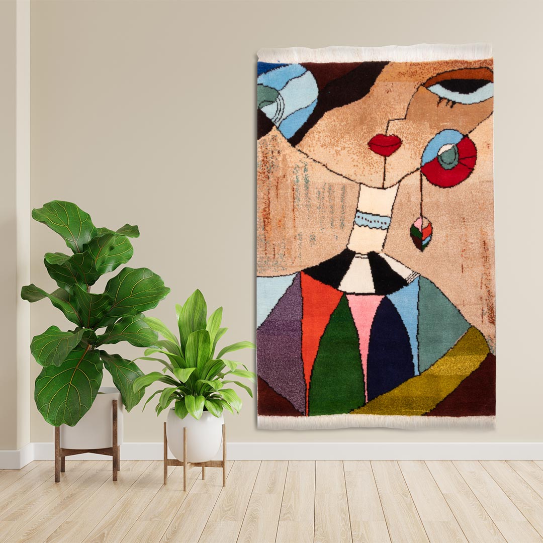 فرش دستبافت درشت(110×160)سانتیمتر , یک فرش با نقشه ی تصویری به شکل دختر جوان روستایی می باشد به سبک کارتونی.