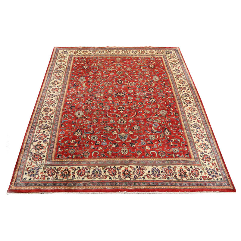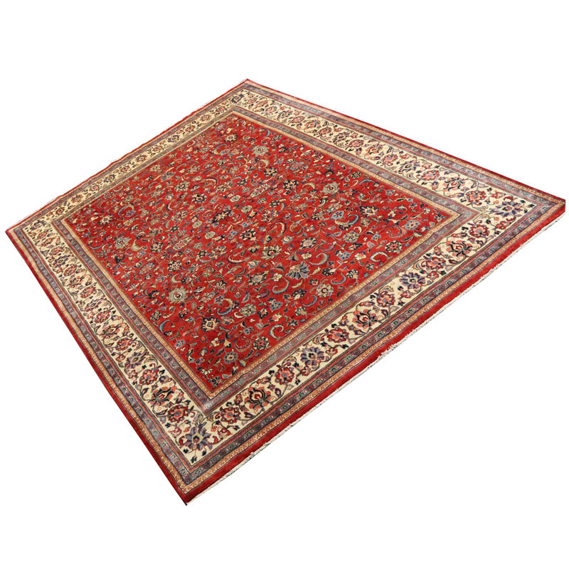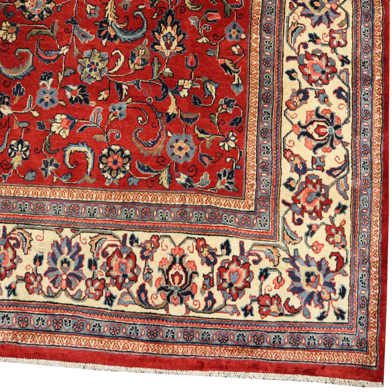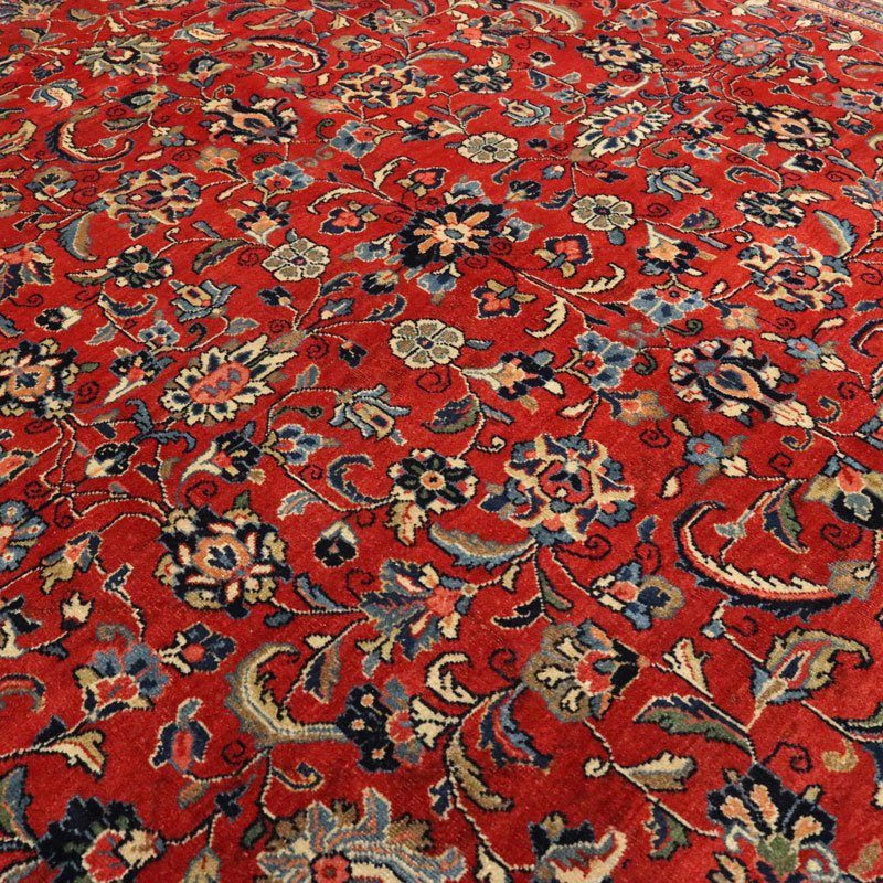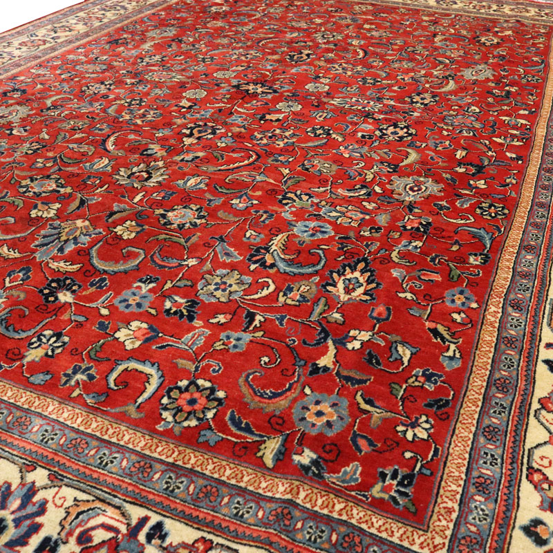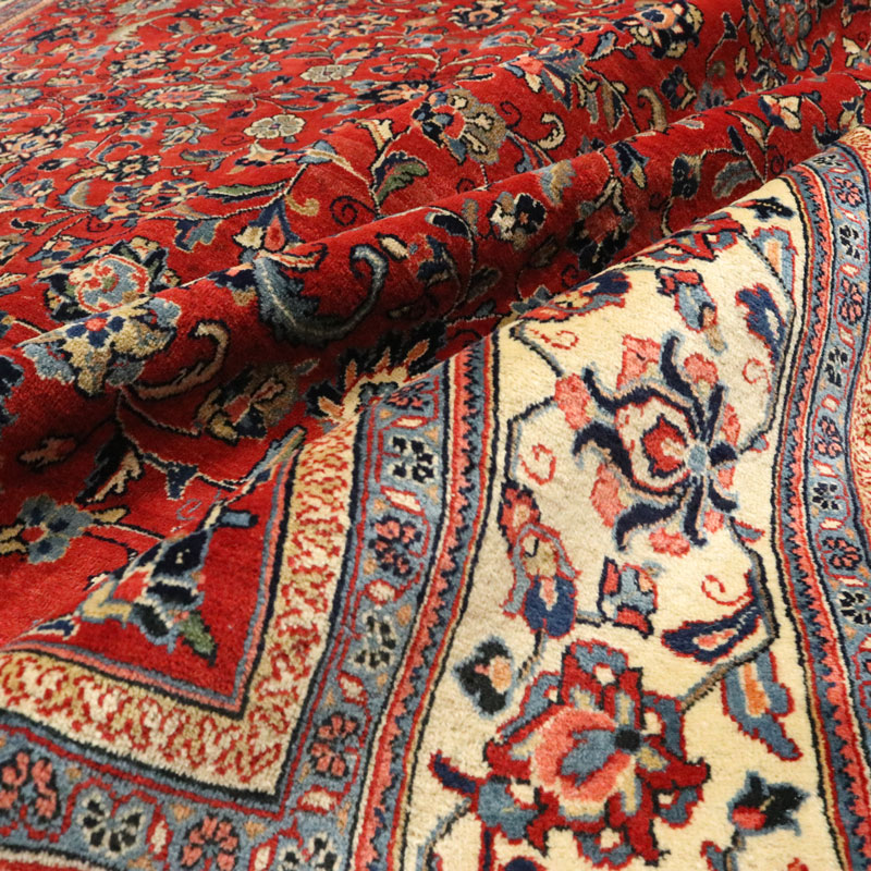 فرش دسبافت ساروق با رنگ زمینه لاکی و حاشیه کرم و ضخامت 2 میلیمتر و مساحت 10.56 متر مربع و وزن 36.97 کیلوگرم است.