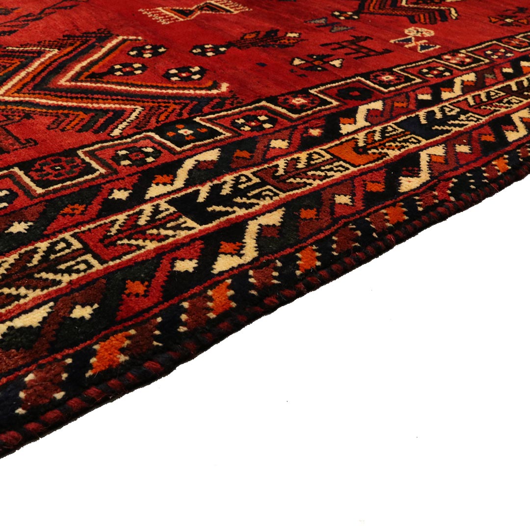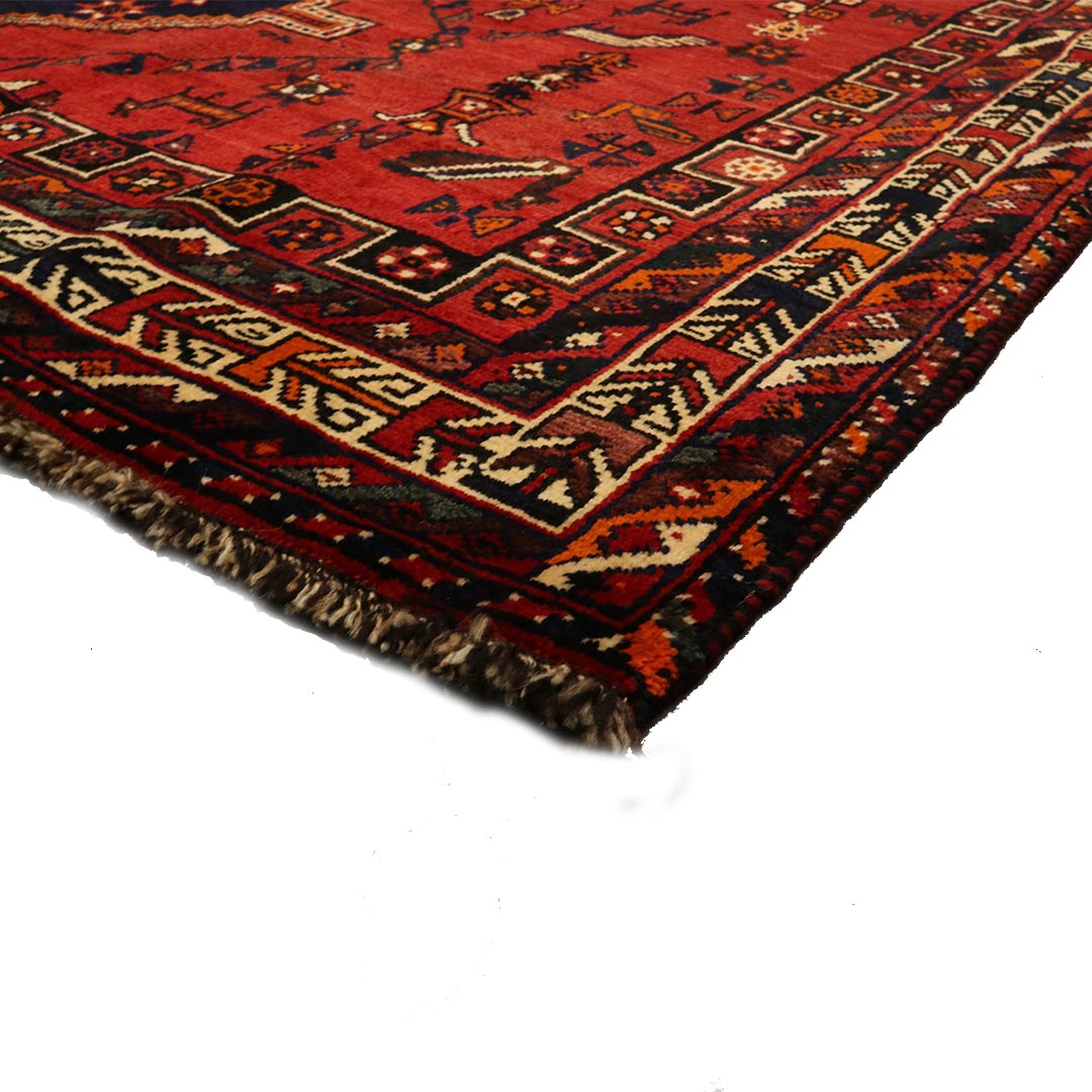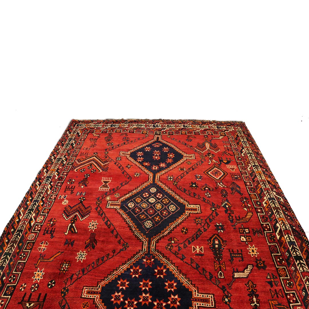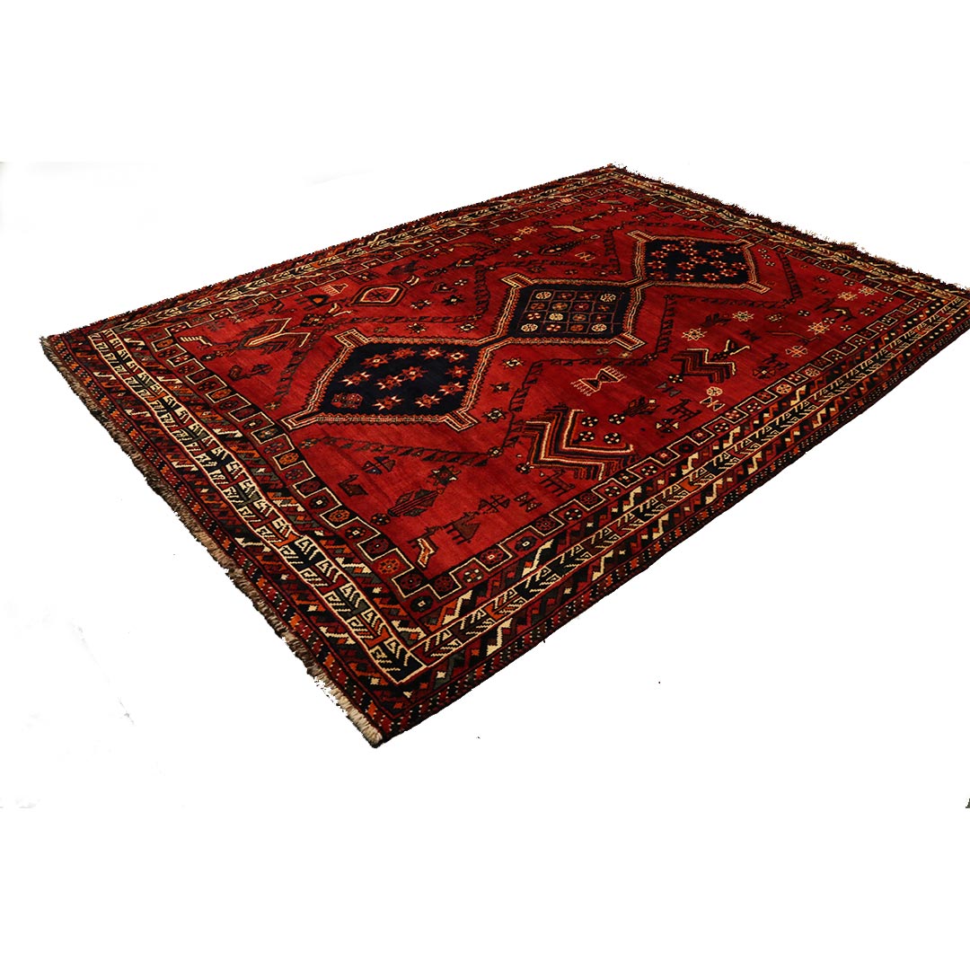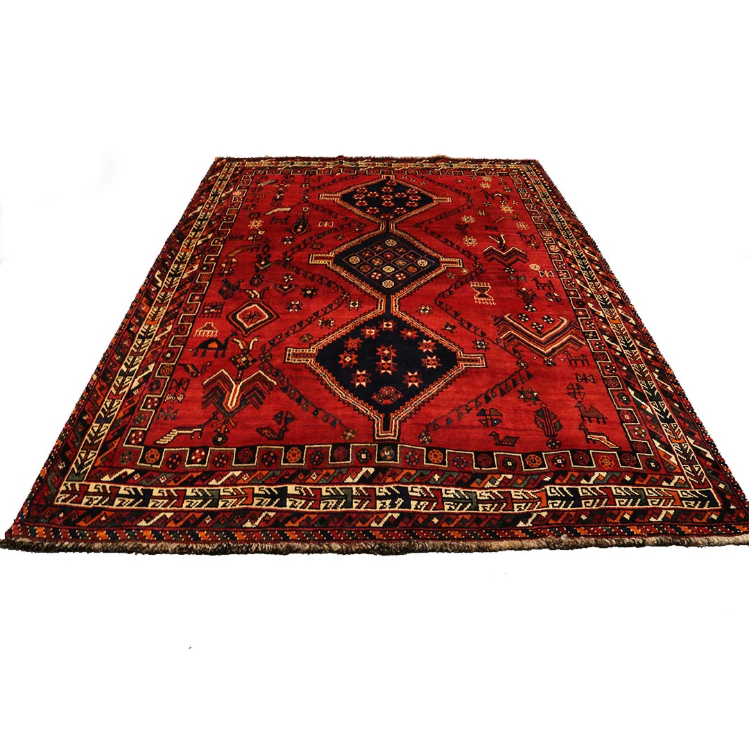فرش دستبافت شیراز با طرح سه ترنج و رنگ گرم , 6 مترمربع مساحت دارد . وزن آن حدود 21.33 کیلوگرم می باشد.