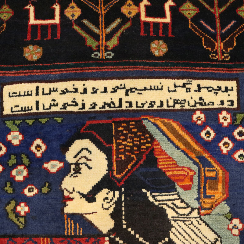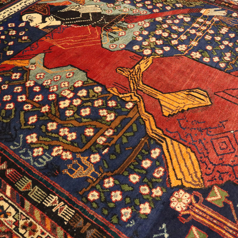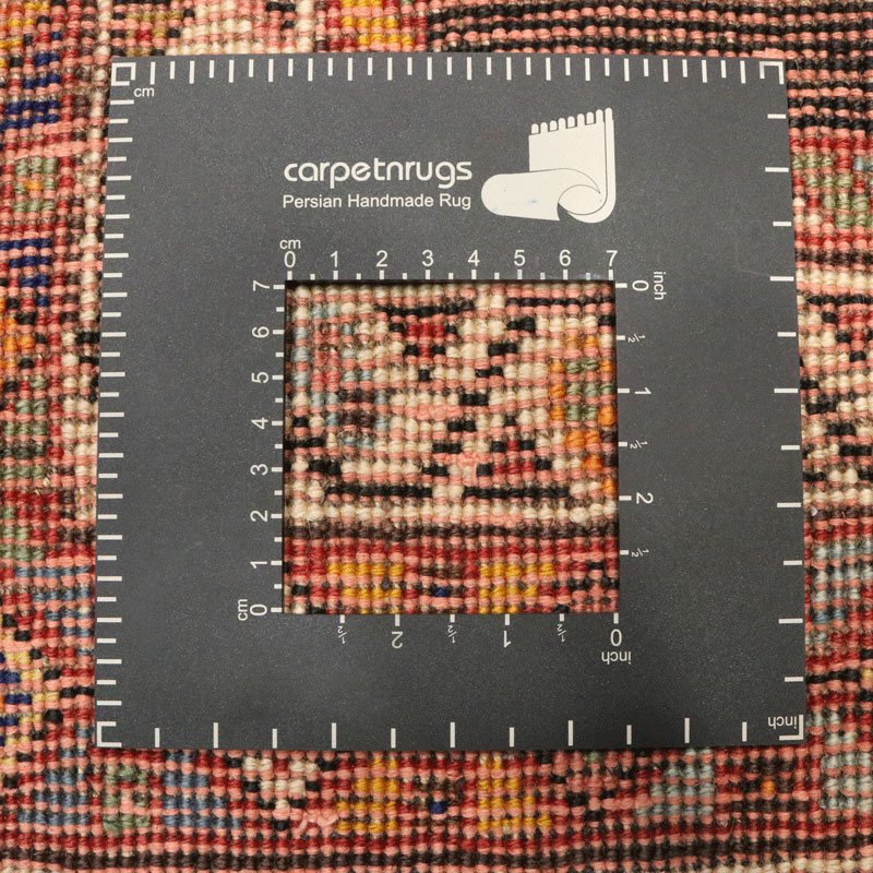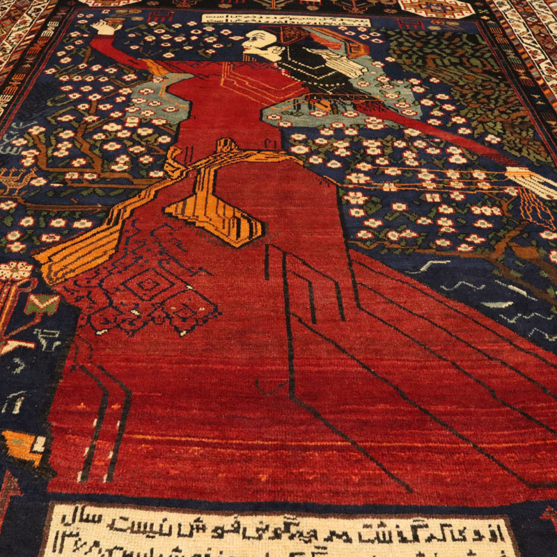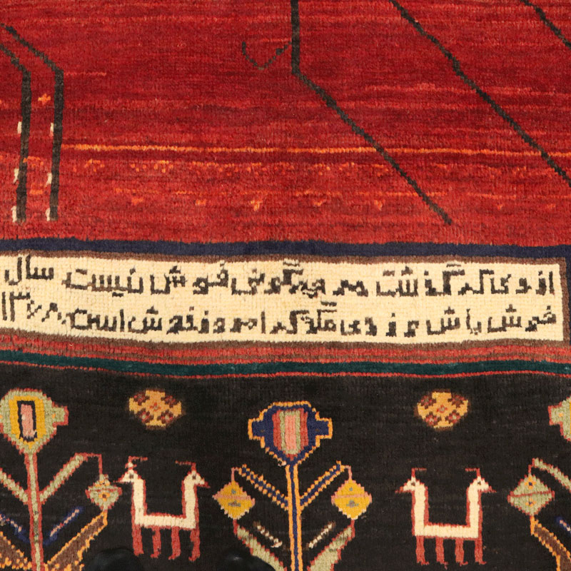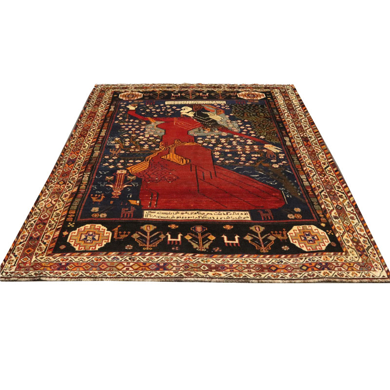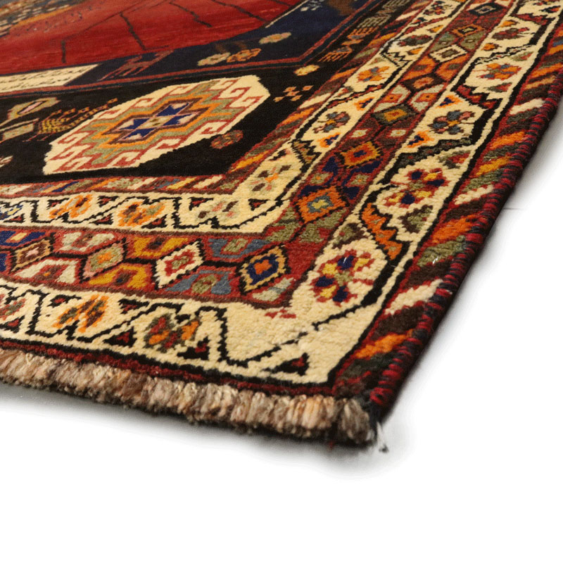 فرش دسبافت شیراز با مساحت 6.25 متر مربع و وزن 21.8 کیلوگرم و ضخامت 2 میلیمتر با رنگ زمینه لاکی و حاشیه کرم میباشد.