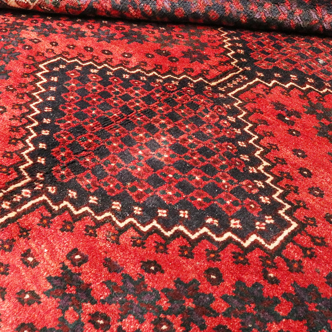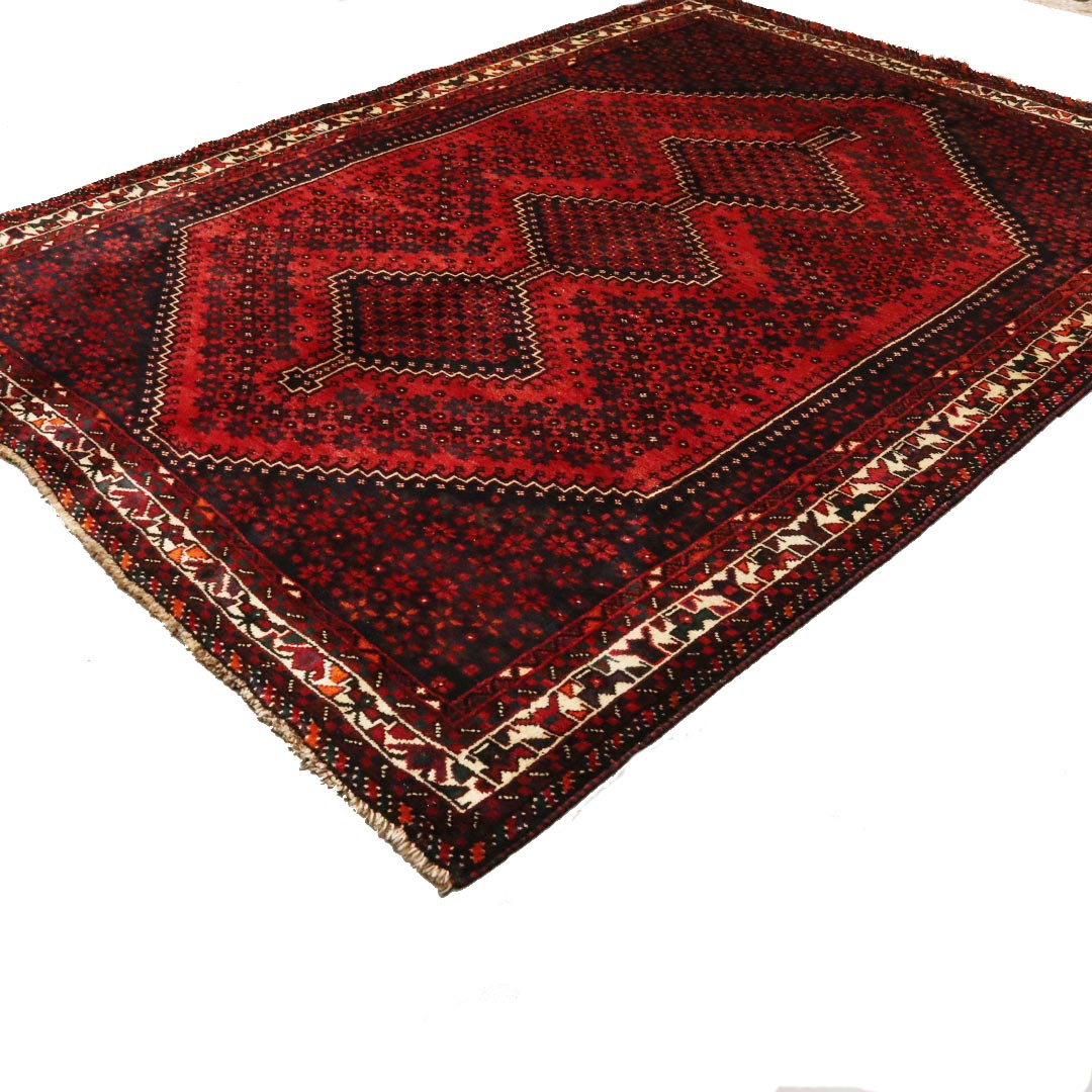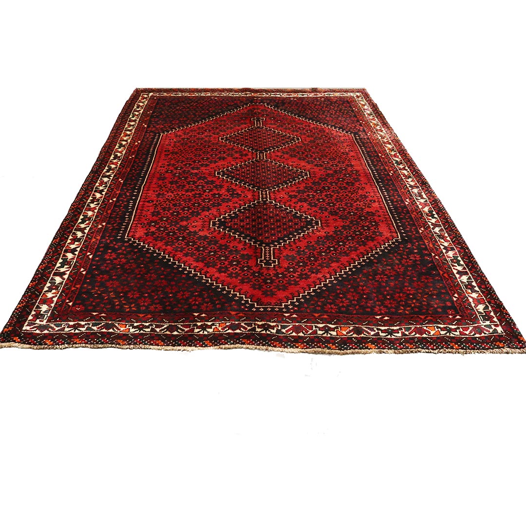 فرش دستبافت شیراز با رنگ زمینه لاکی و طرح لچک ترنج سه تایی که از مواذ طبیعی پشم و کتان تولید شد ه است.
