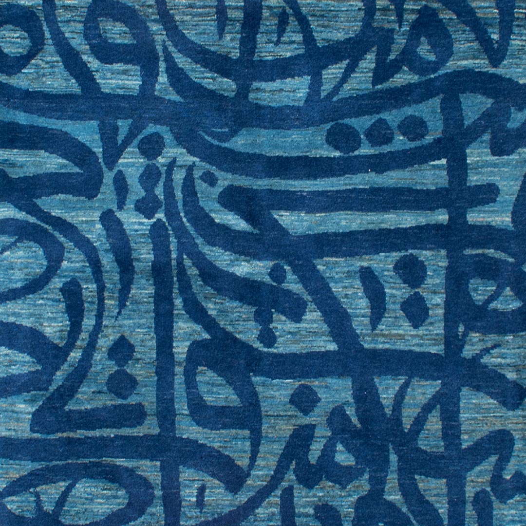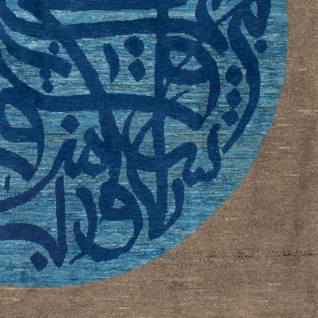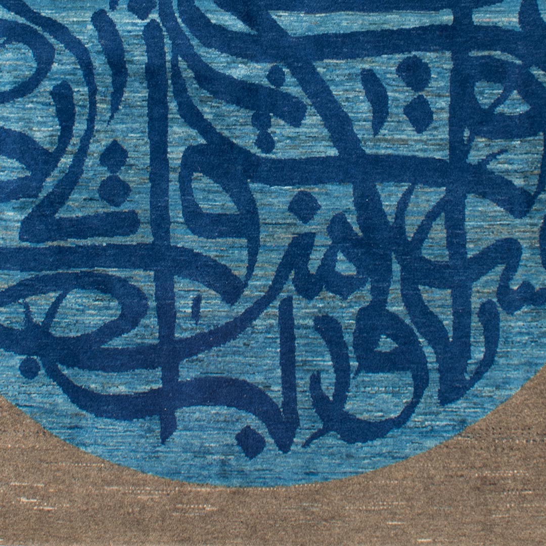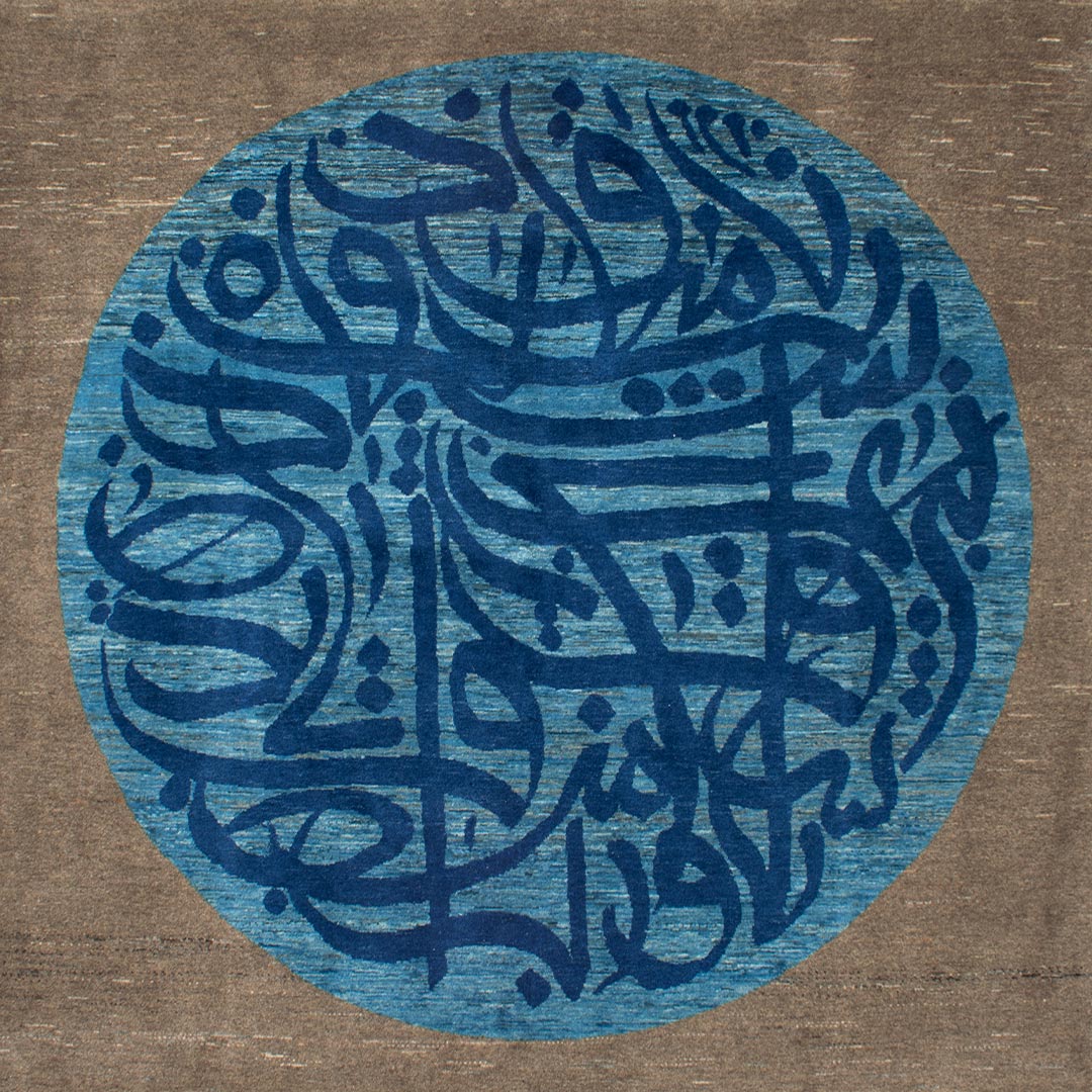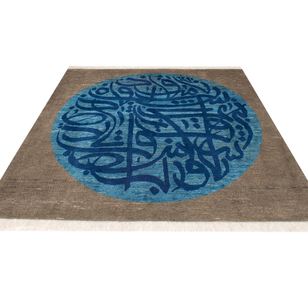 متن فرش متشکل از یک دایره به رنگ آبی روشن و نوشته هایی به رنگ آبی پر رنگ است , که درون یک مربع قرار دارد.