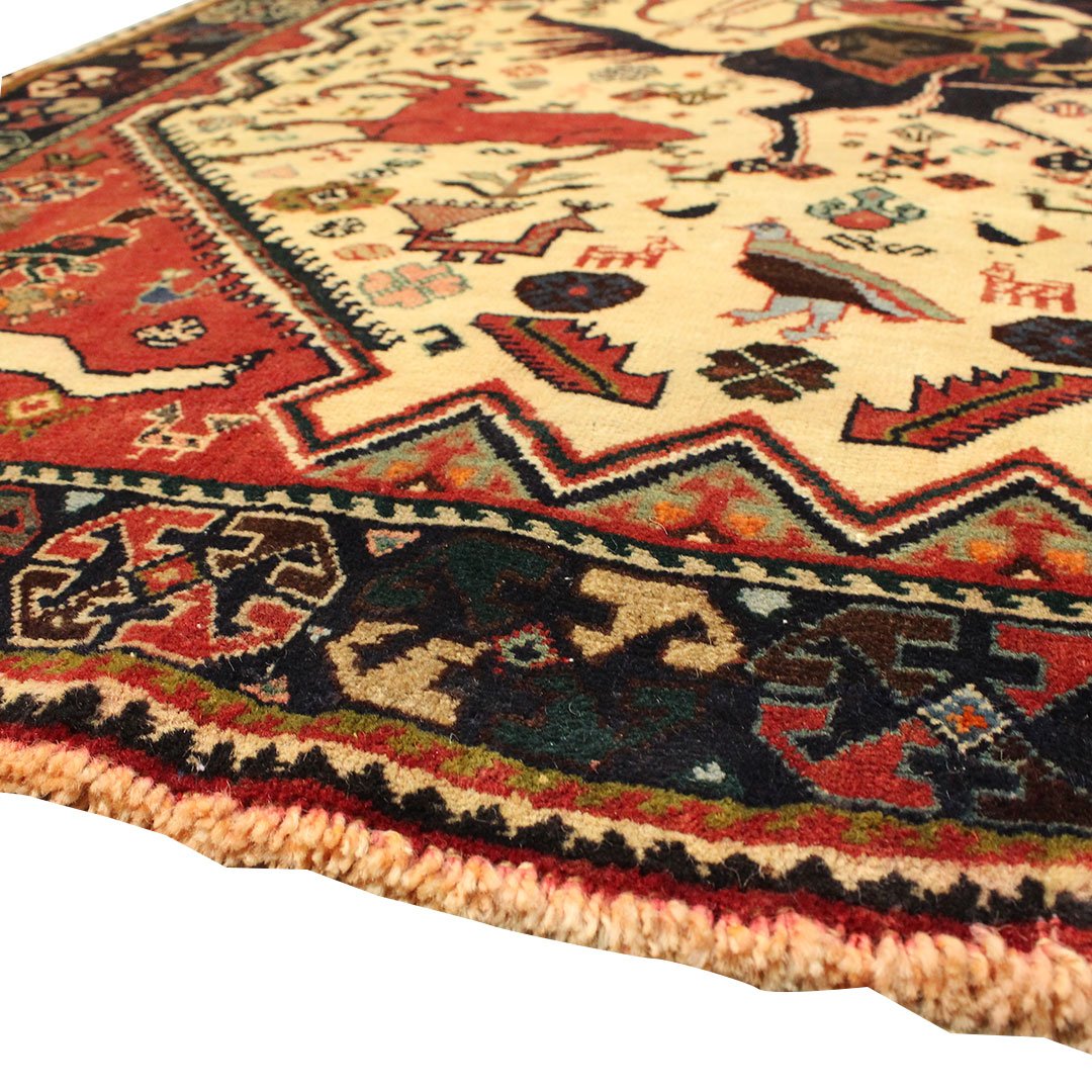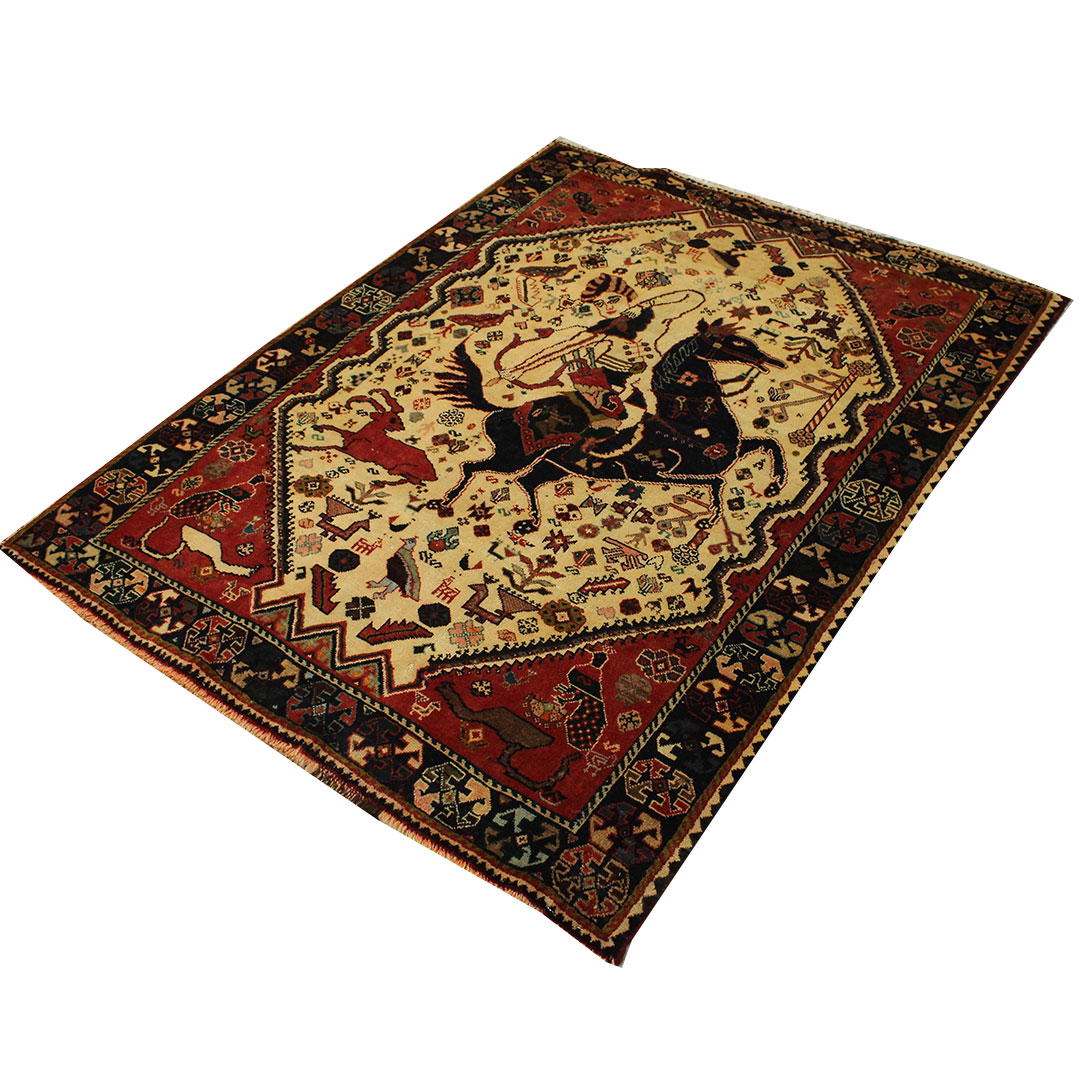 کد فرش:2939 -فرش دستبافت قشقایی به شکل مستطیل ودر ابعاد: 171سانتیمترمربع و عرض:131سانتیمترمربع د بافته شده است،جنس چله فرش از نخ و جنس پودها از پشم میباشد ،،رنگها گیاهی و ثابت است در اثر شستشو دچار تغییر رنگ و پس دادن و پخش شدن رنگ در فرش نمیشود،مساحت که فرش در منزل شما اشغال میکند2.24متر مربع میباشد،ضخامت و قطر آن در حدود ۱0میلی متر ودارای وزن 7.8کیلوگرم است،در بافت فرش از نقوش ترنج و هندسی وذهنی بافت عشابری استفاده شده است .استفاده شده و طرح خاص و بی نظیر میباشد .نحوه ی رنگرزی سنتی با استفاده از رنگهای گیاهی طبیعی و ارگانیک میباشد،و همین امر فرش را خوش رنگ و باکیفیت کرده است.
