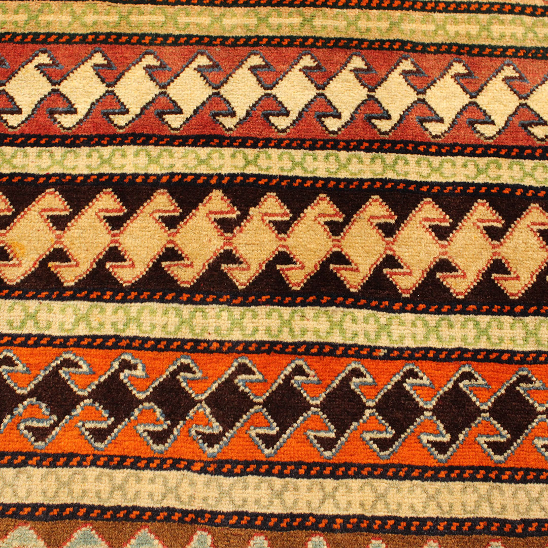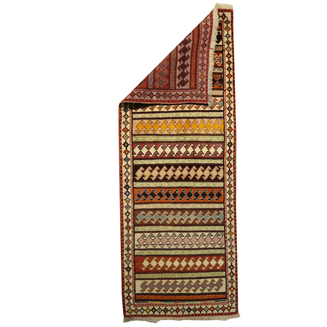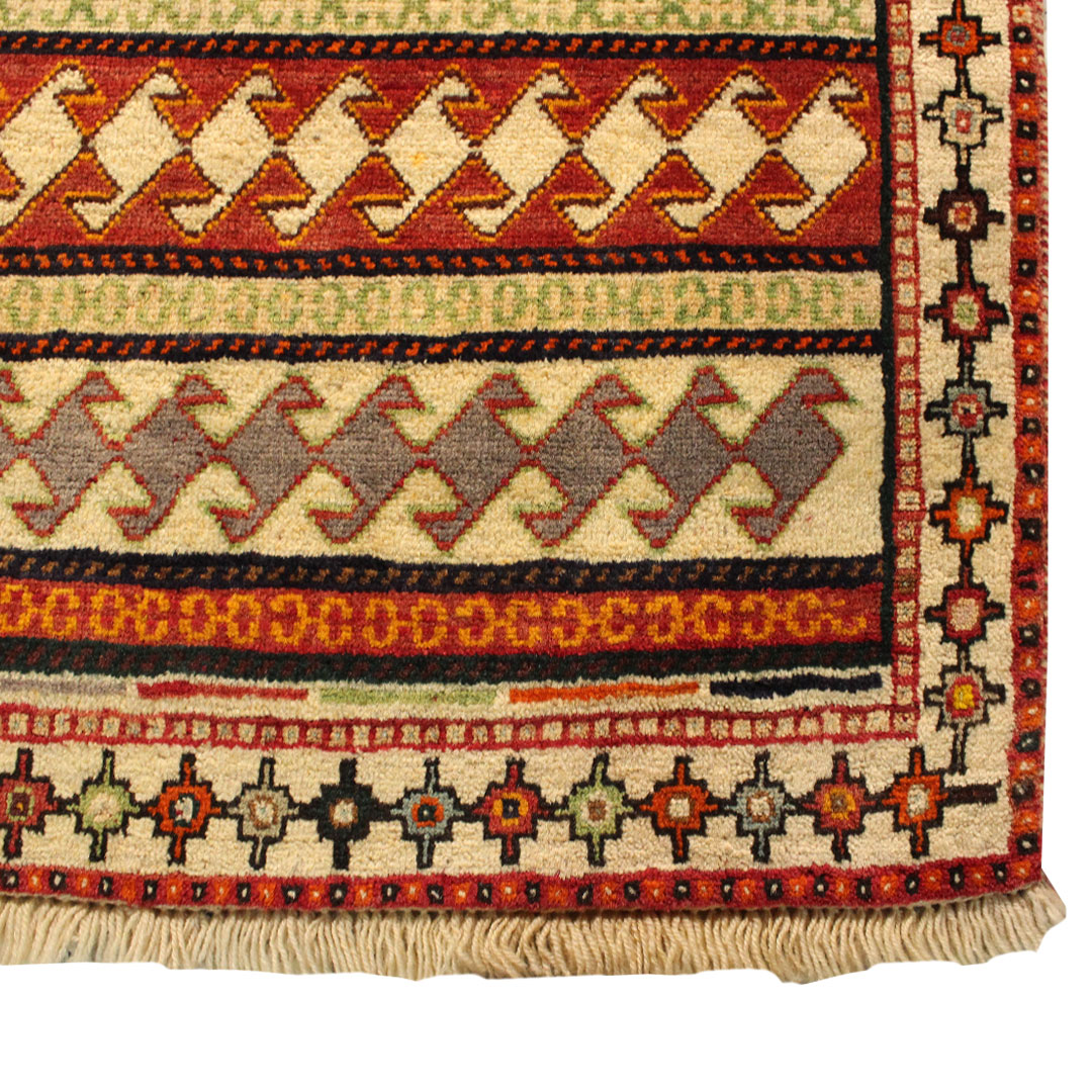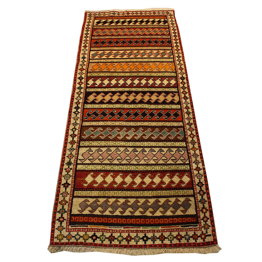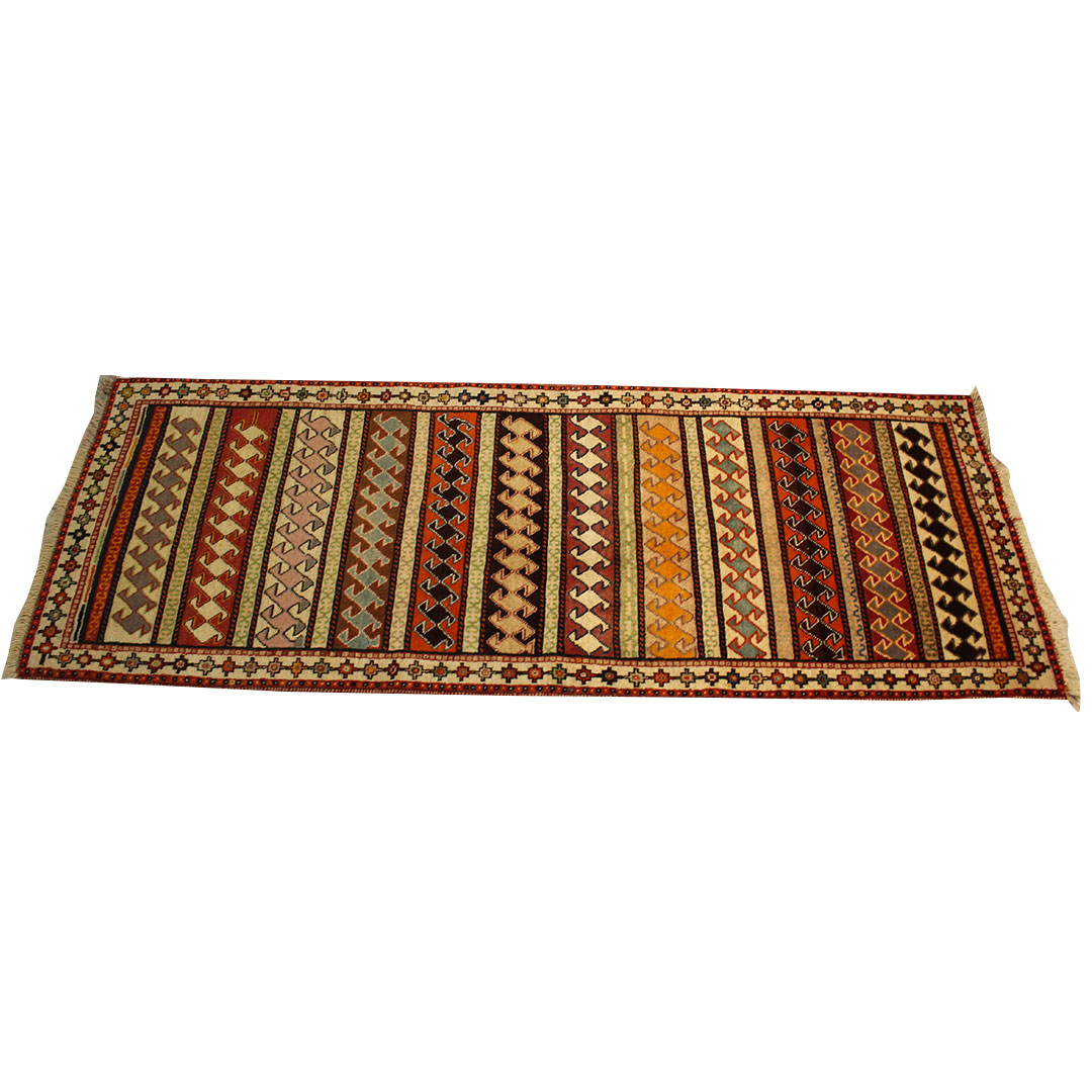 فرش دستبافت قشقایی به شکل مستطیل ودر ابعاد: 195 سانتیمترمربع و عرض: 74 سانتیمترمربع بافته شده است،