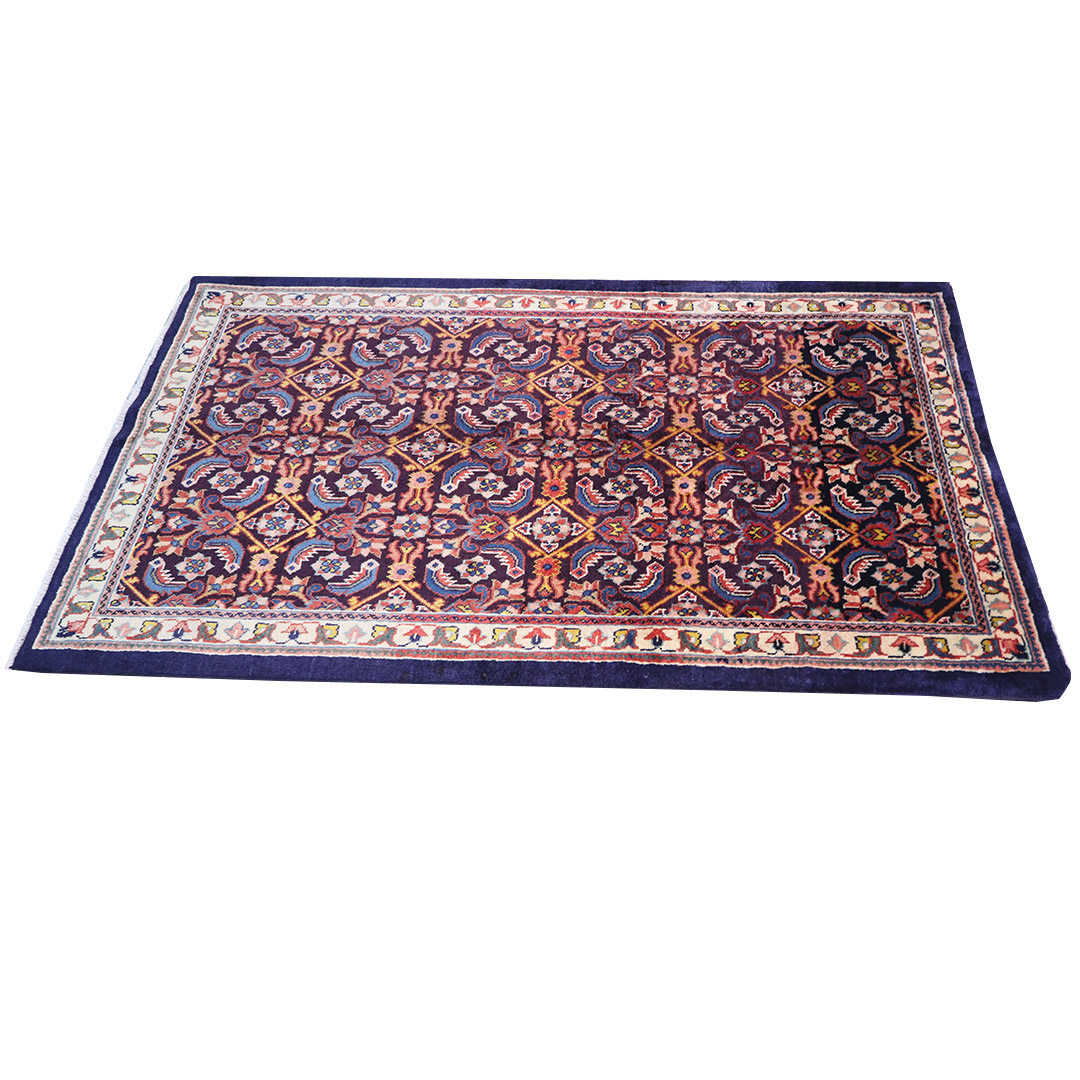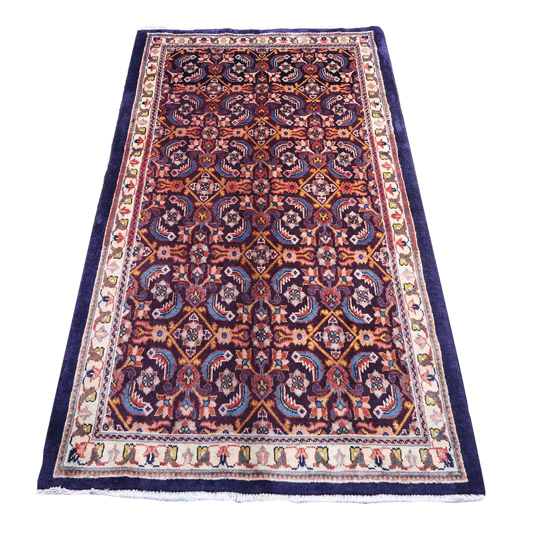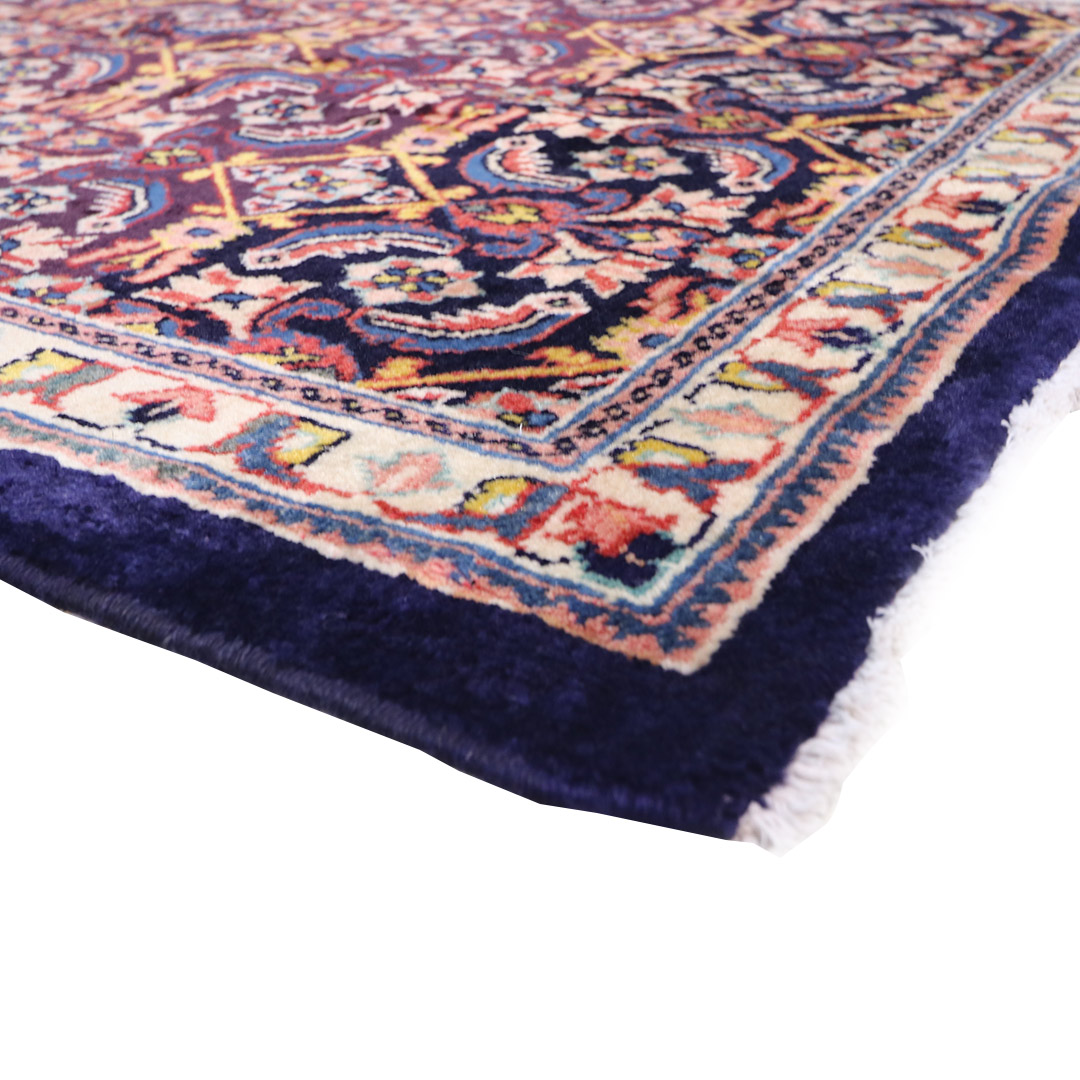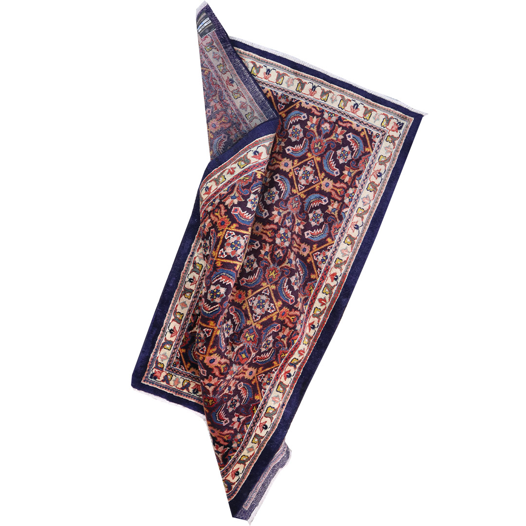 کد فرش:1690 -فرش دستبافت محلات به شکل مستطیل ودر ابعاد: 182سانتیمترمربع و عرض:104 سانتیمترمربع در شهرستان محلات بافته شده است،جنس چله فرش از نخ و جنس پودها از پشم میباشد ،رنگ زمینه فرش سورمه ای و رنگ حاشیه کرم است ،رنگها گیاهی و ثابت است در اثر شستشو دچار تغییر رنگ و پس دادن و پخش شدن رنگ در فرش نمیشود،مساحت که فرش در منزل شما اشغال میکند ۱.89متر مربع میباشد،ضخامت و قطر آن در حدود ۱۵میلی متر ودارای وزن ۱۰کیلوگرم است،در بافت فرش از نقوش سراسر یا افشان استفاده شده و طرح خاص و بی نظیر میباشد .نحوه ی رنگرزی سنتی با استفاده از رنگهای گیاهی طبیعی و ارگانیک میباشد،و همین امر فرش را خوش رنگ و باکیفیت کرده است.