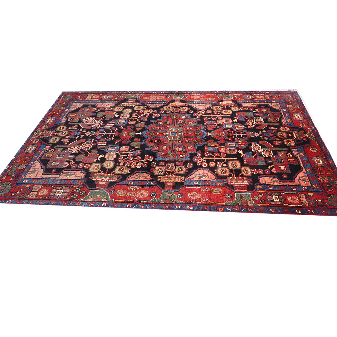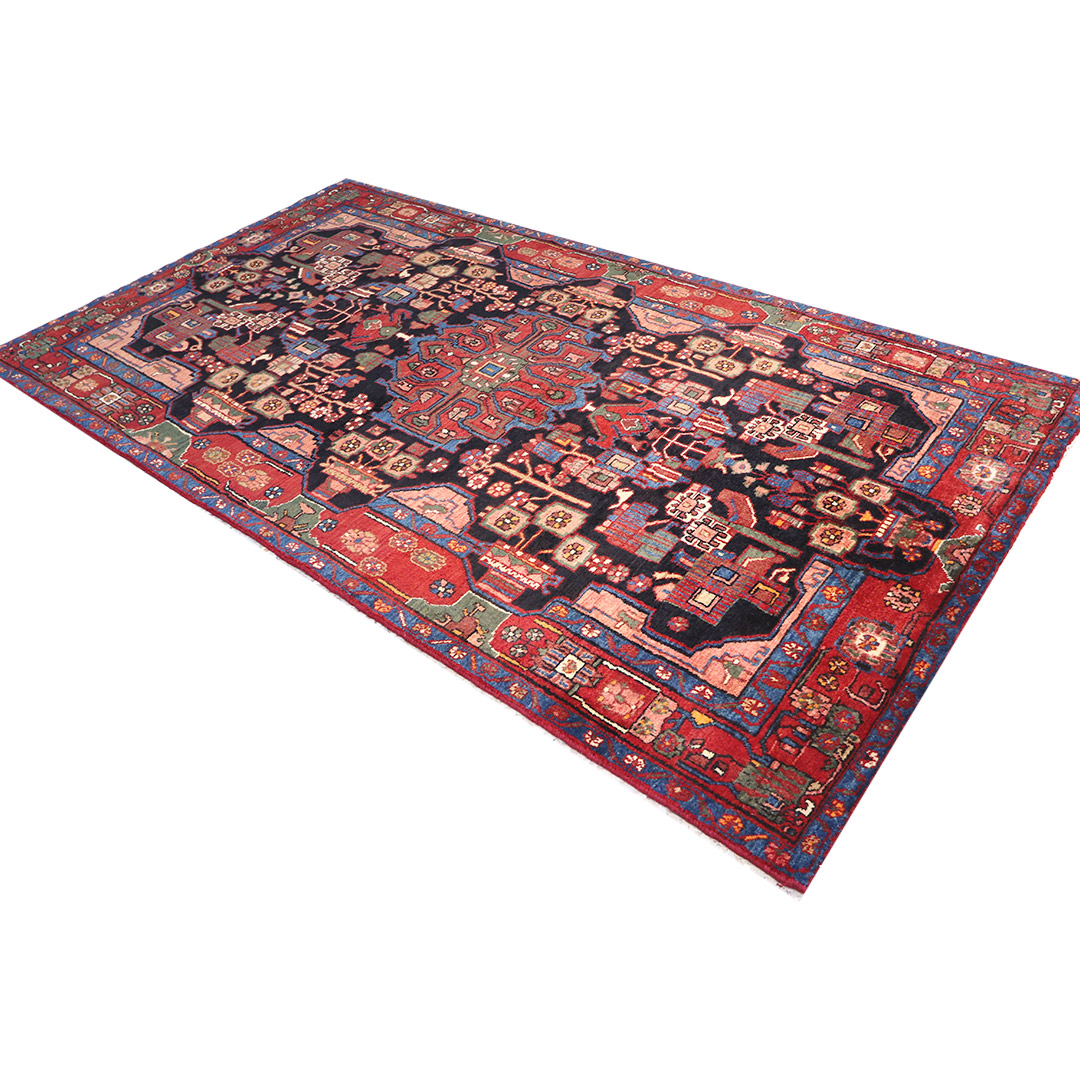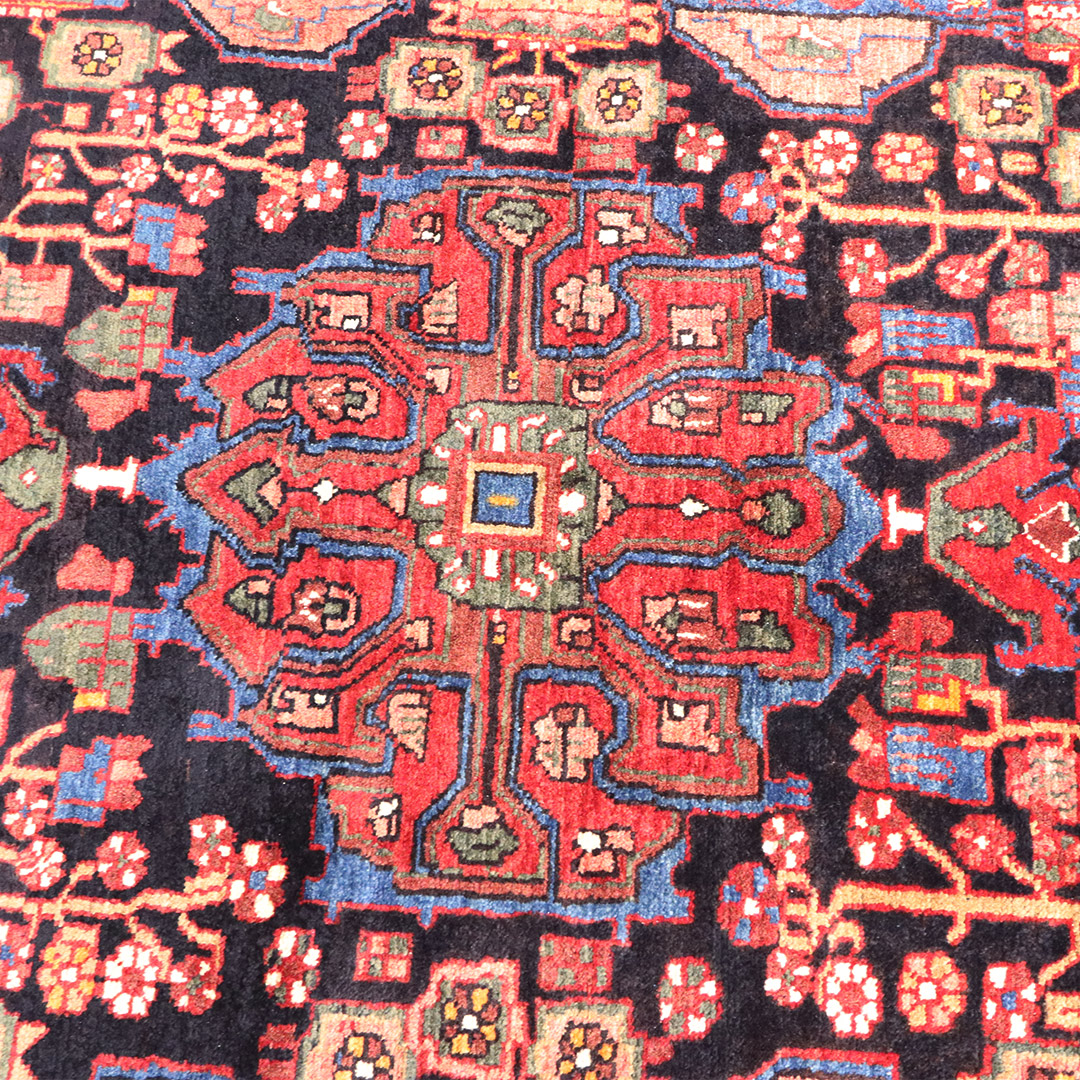 کد فرش:3393 -فرش دستبافت توبسرکان نهاوند به شکل مستطیل ودر ابعاد: 274سانتیمترمربع و عرض:153 سانتیمترمربع در شهرستان نهاوند بافته شده است،جنس چله فرش از نخ و جنس پودها از پشم میباشد ،رنگ زمینه فرش مشکی و رنگ حاشیه لاکی است ،رنگها گیاهی و ثابت است در اثر شستشو دچار تغییر رنگ و پس دادن و پخش شدن رنگ در فرش نمیشود،مساحت که فرش در منزل شما اشغال میکند 4.19متر مربع میباشد،ضخامت و قطر آن در حدود ۱۵میلی متر ودارای وزن ۱۰کیلوگرم است،در بافت فرش از نقوش ترنج هندسی دهنی بافت عشایری استفاده شده و طرح خاص و بی نظیر میباشد .نحوه ی رنگرزی سنتی با استفاده از رنگهای گیاهی طبیعی و ارگانیک میباشد،و همین امر فرش را خوش رنگ و باکیفیت کرده است.
