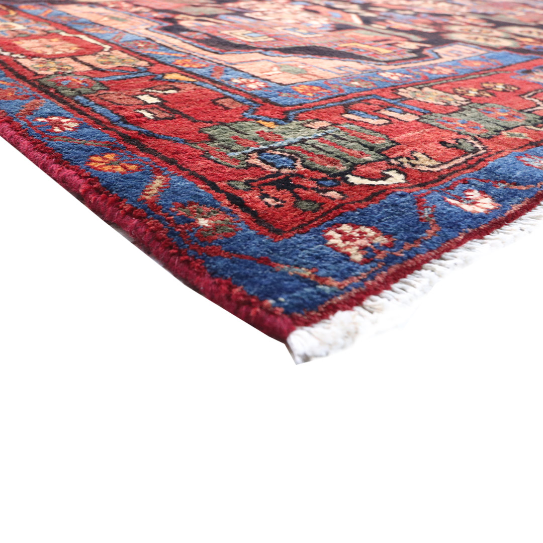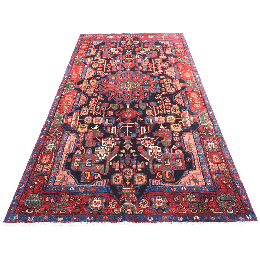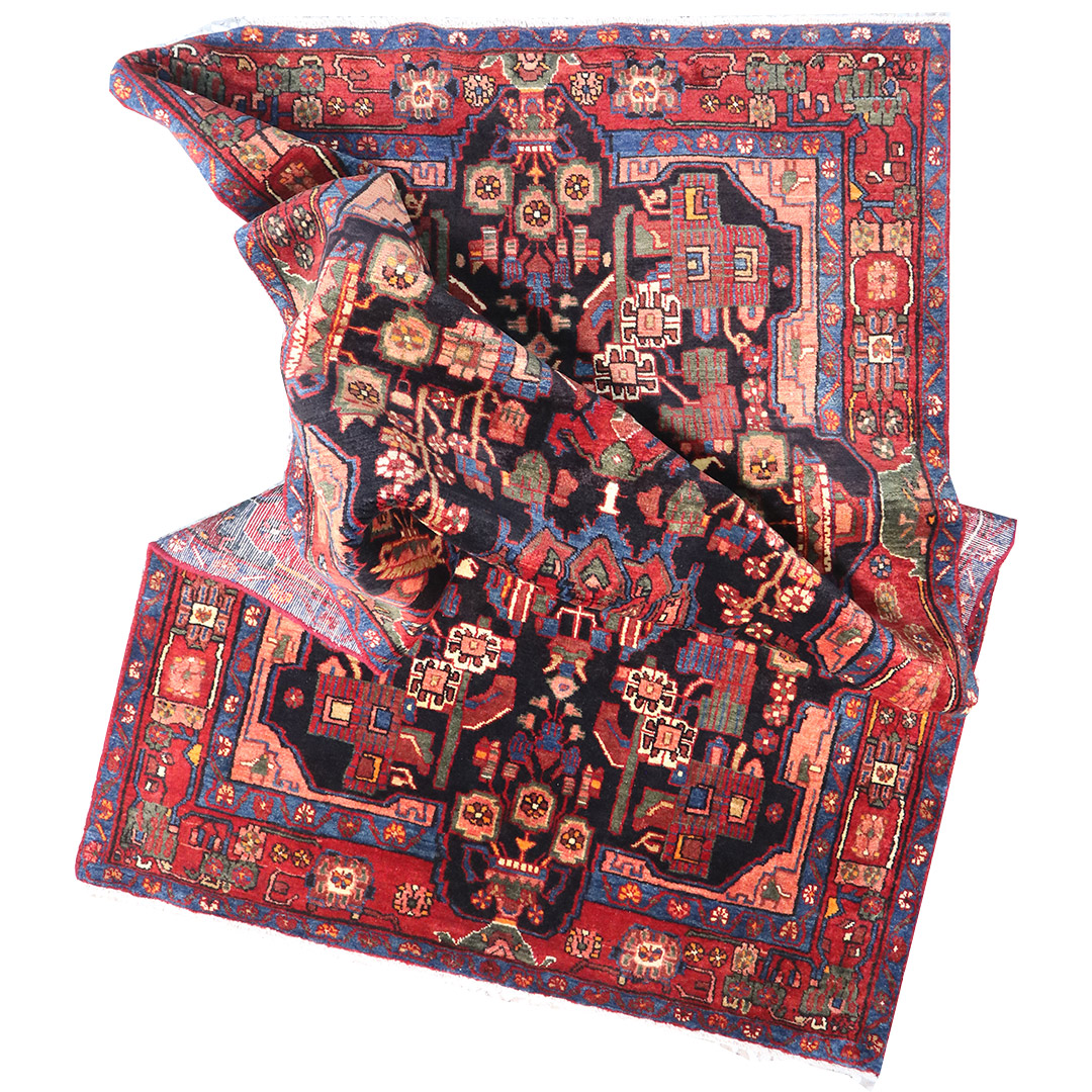 کد فرش:3393 -فرش دستبافت توبسرکان نهاوند به شکل مستطیل ودر ابعاد: 274سانتیمترمربع و عرض:153 سانتیمترمربع در شهرستان نهاوند بافته شده است،جنس چله فرش از نخ و جنس پودها از پشم میباشد ،رنگ زمینه فرش مشکی و رنگ حاشیه لاکی است ،رنگها گیاهی و ثابت است در اثر شستشو دچار تغییر رنگ و پس دادن و پخش شدن رنگ در فرش نمیشود،مساحت که فرش در منزل شما اشغال میکند 4.19متر مربع میباشد،ضخامت و قطر آن در حدود ۱۵میلی متر ودارای وزن ۱۰کیلوگرم است،در بافت فرش از نقوش ترنج هندسی دهنی بافت عشایری استفاده شده و طرح خاص و بی نظیر میباشد .نحوه ی رنگرزی سنتی با استفاده از رنگهای گیاهی طبیعی و ارگانیک میباشد،و همین امر فرش را خوش رنگ و باکیفیت کرده است.