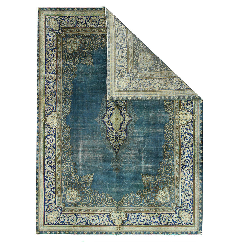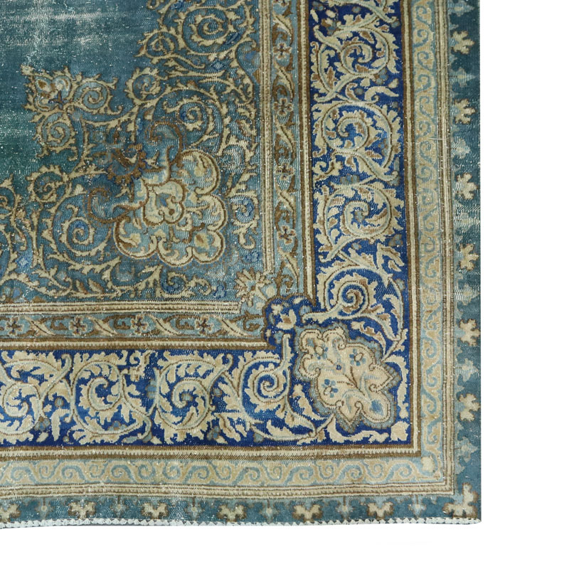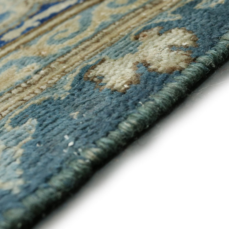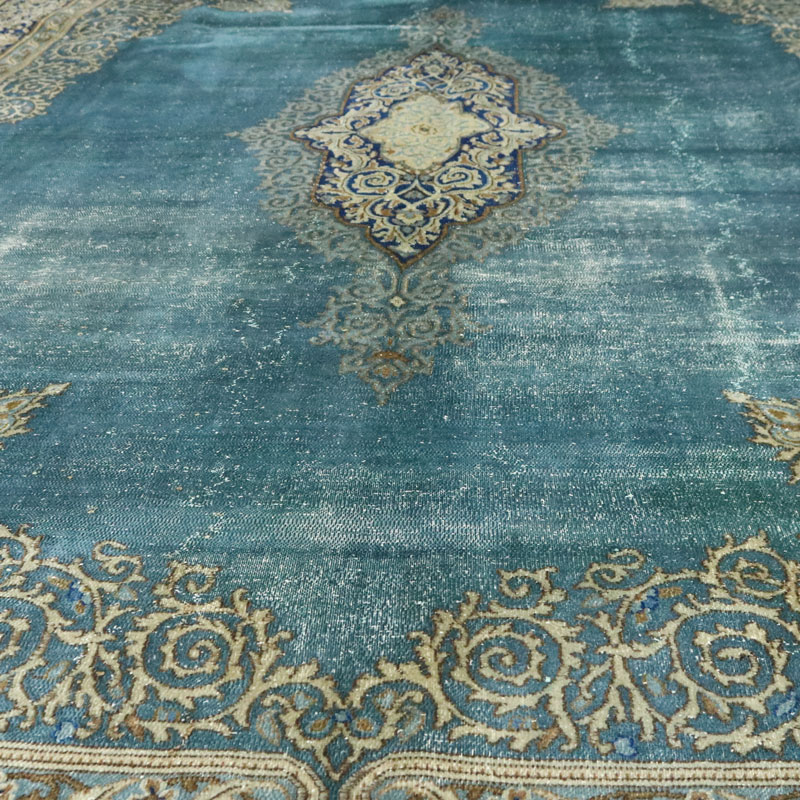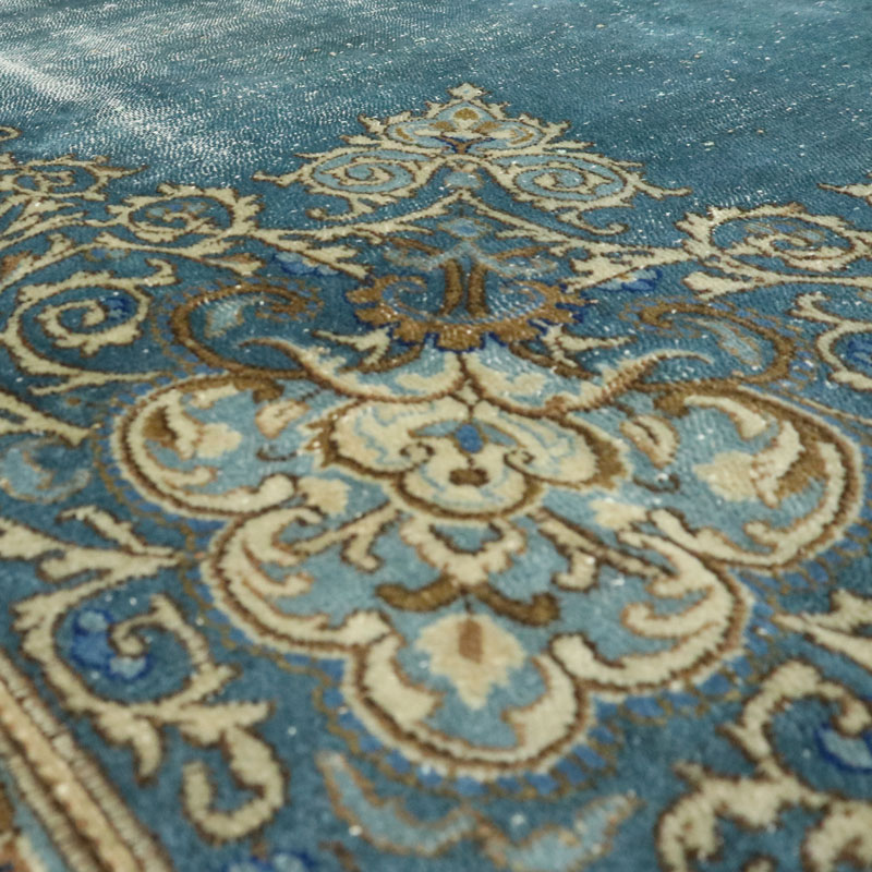 فرش دستبافت وینتیج (260×358) سانتیمتر با رنگ زمینه آبی و حاشیه کرم و مساحت 9.3 مترمربع و وزن 32.57 کیلوگرم است.