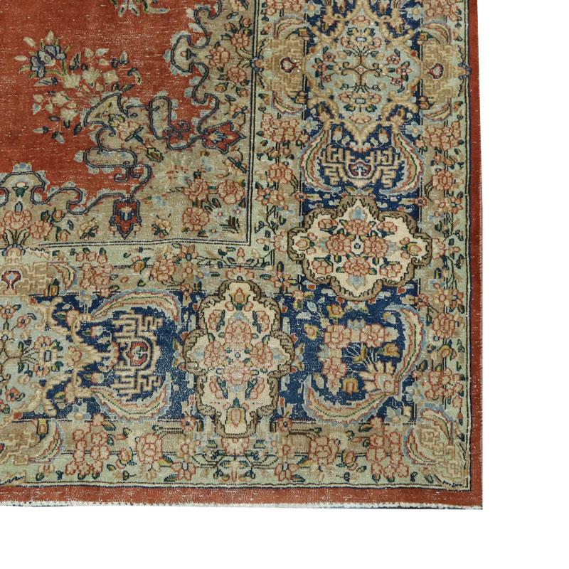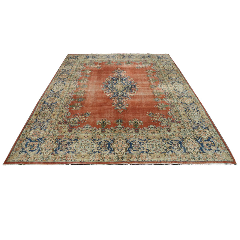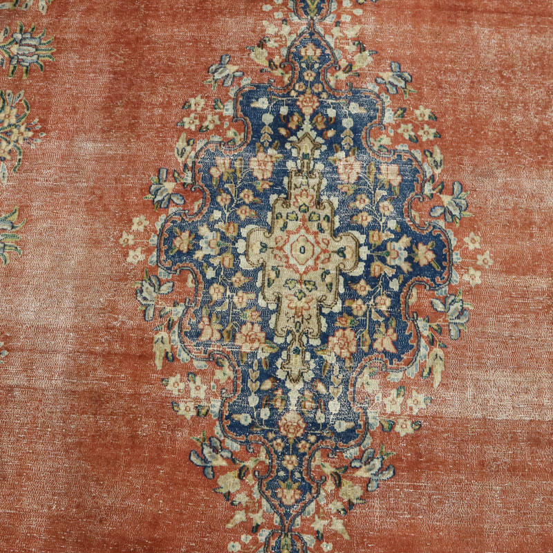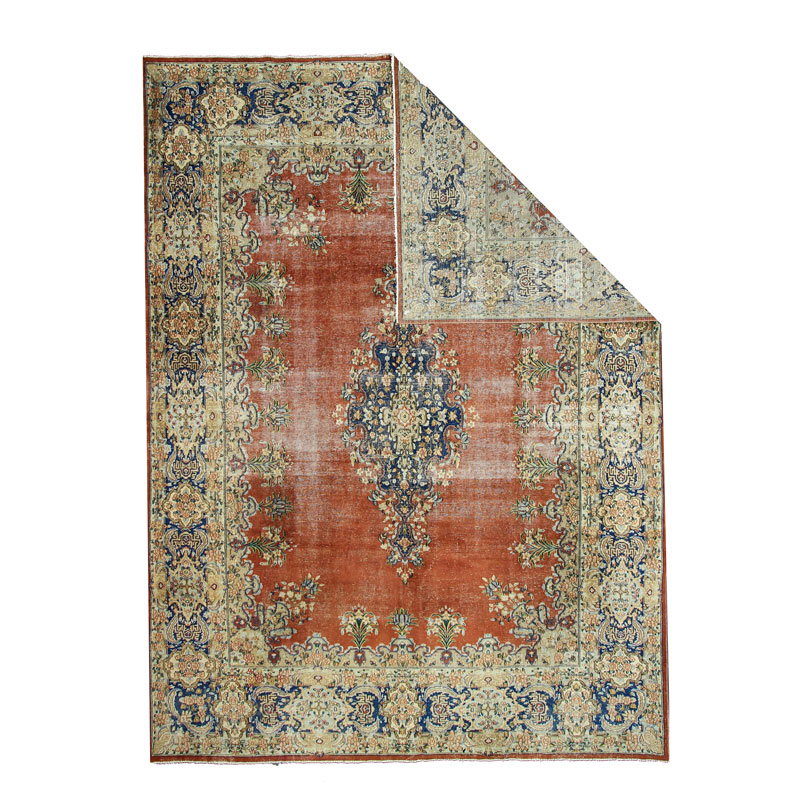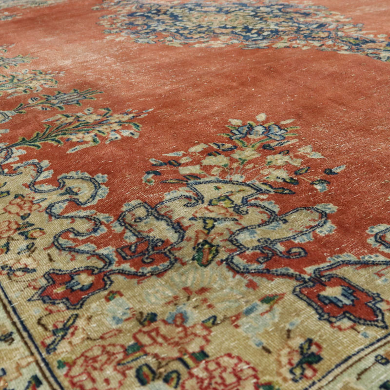 جنس فرش دستبافت وینتیج (290×398) سانتیمتر از پشم و کتان خالص و طرح لچک ترنج هندسی است.