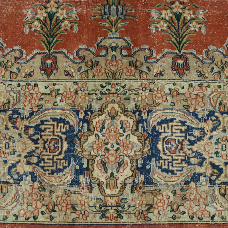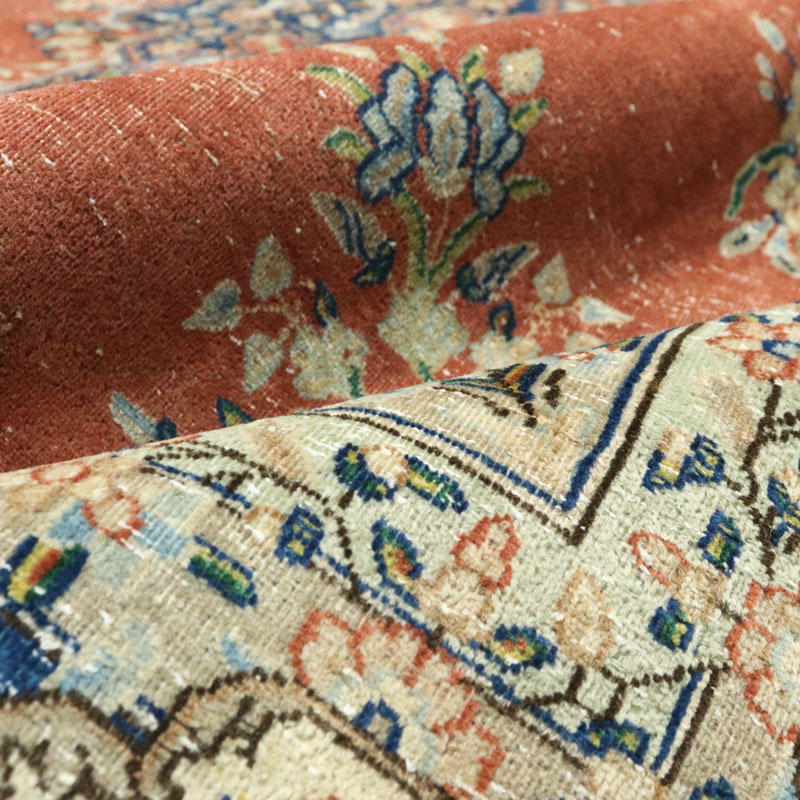 فرش دستبافت وینتیج (290×398) سانتیمتر با رنگ زمینه لاکی و حاشیه کرم و مساحت 11.54 مترمربع و وزن 40.39 کیلوگرم است.
