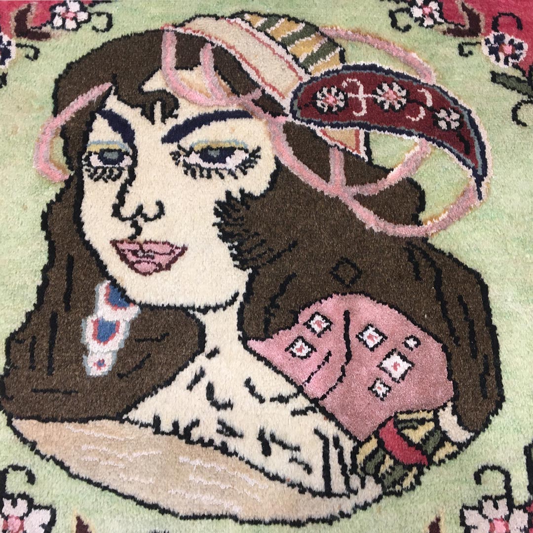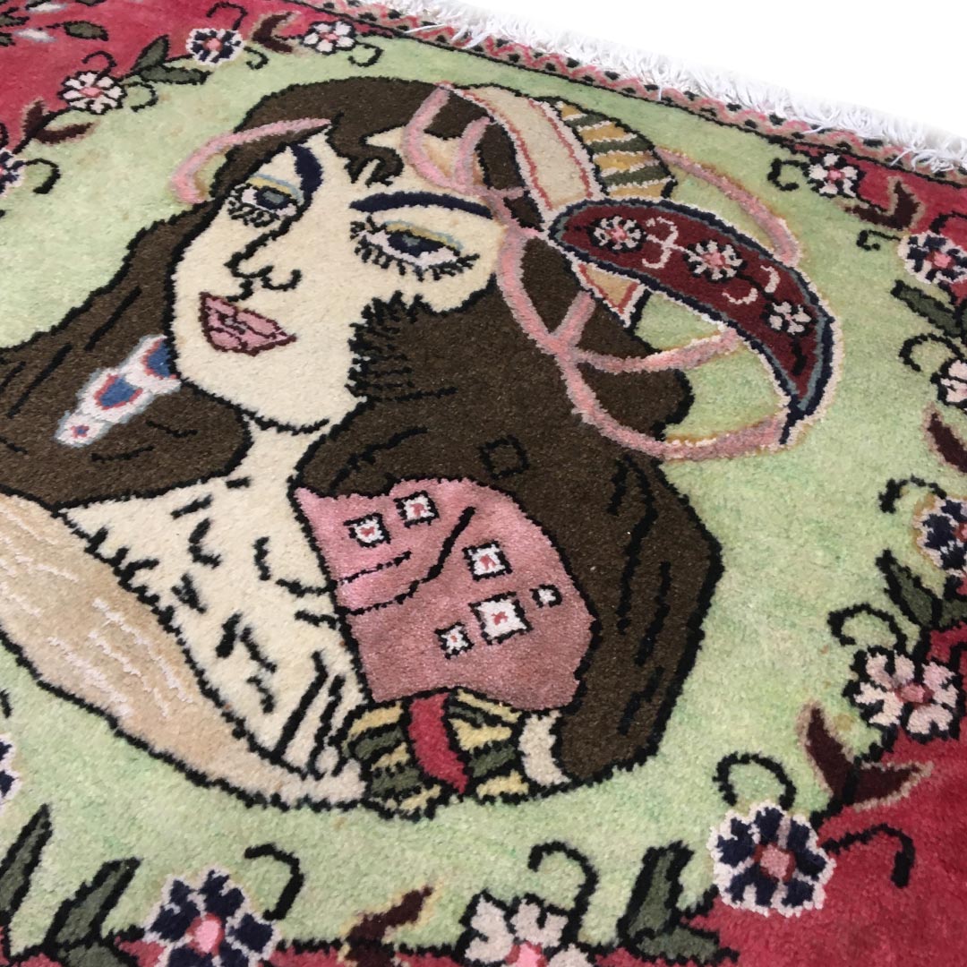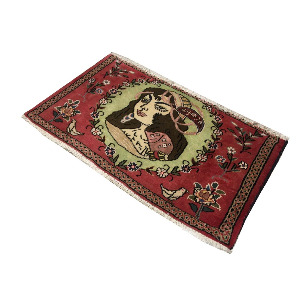 طرح این فرش تصویری است و به شکل مستطیل میباشد رنگ زمینه لاکی است.