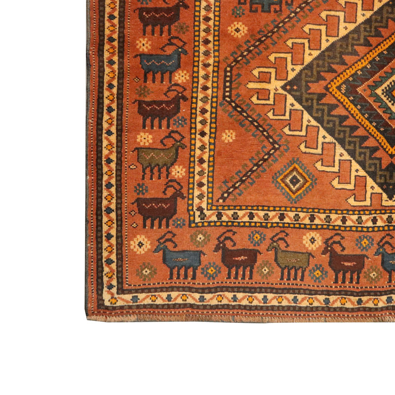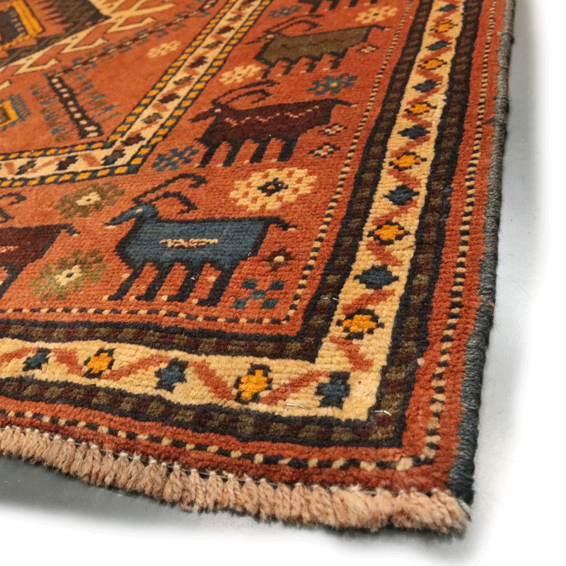 فرش دسبافت کردی قوچان با رنگ متن لاکی و حاشیه کرم و ضخامت 3 میلی و از تار و پود آن از جنس پشم .
