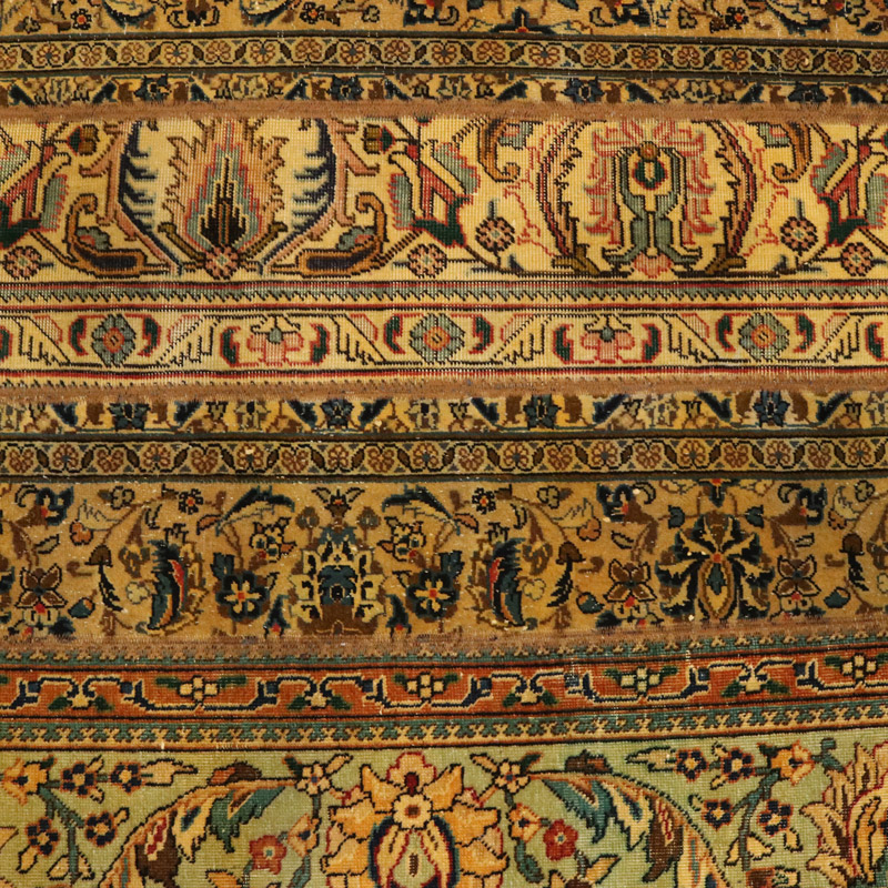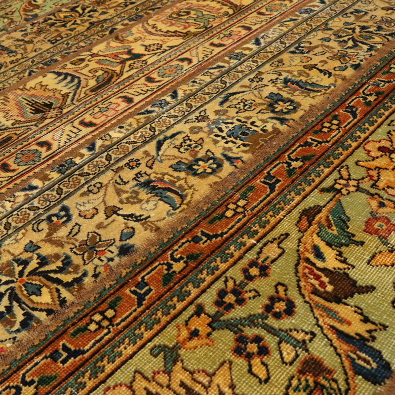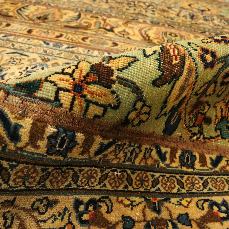 جنس تار و پود آن از پشم و کتان خالص با وزن 9.13 کیلوگرم است.