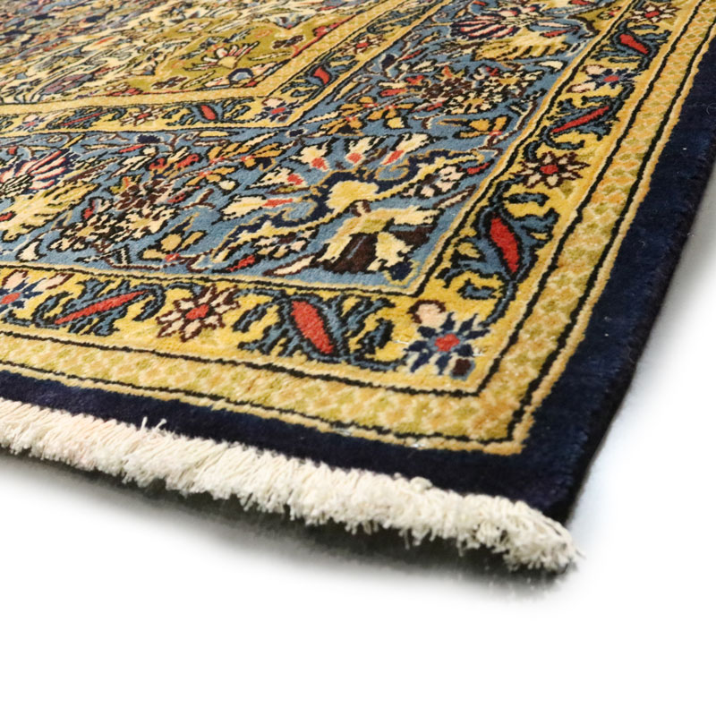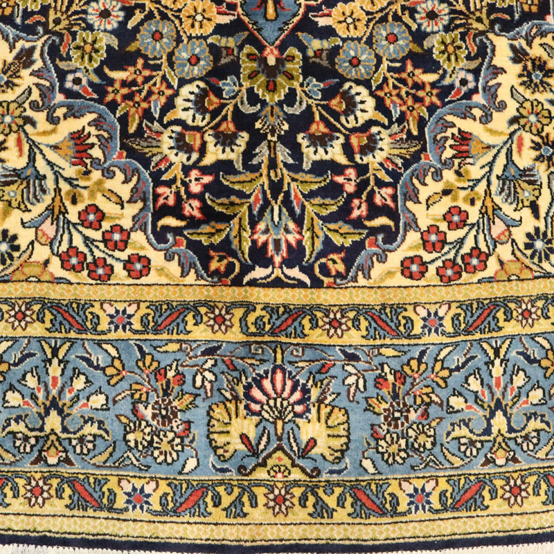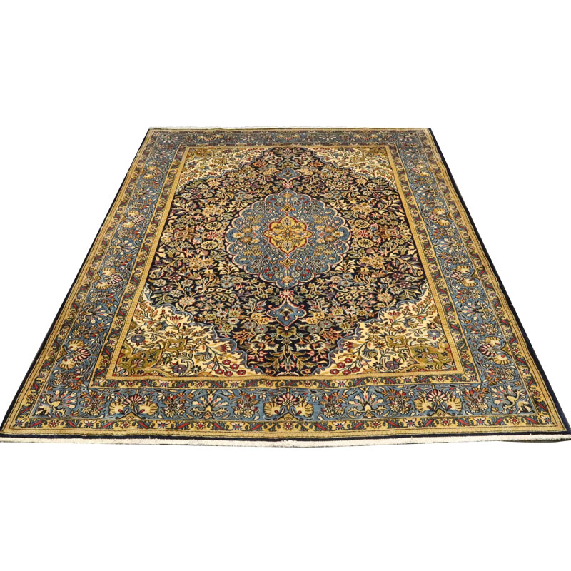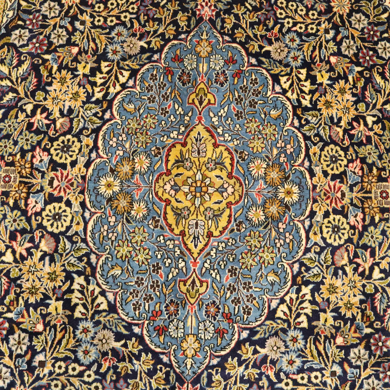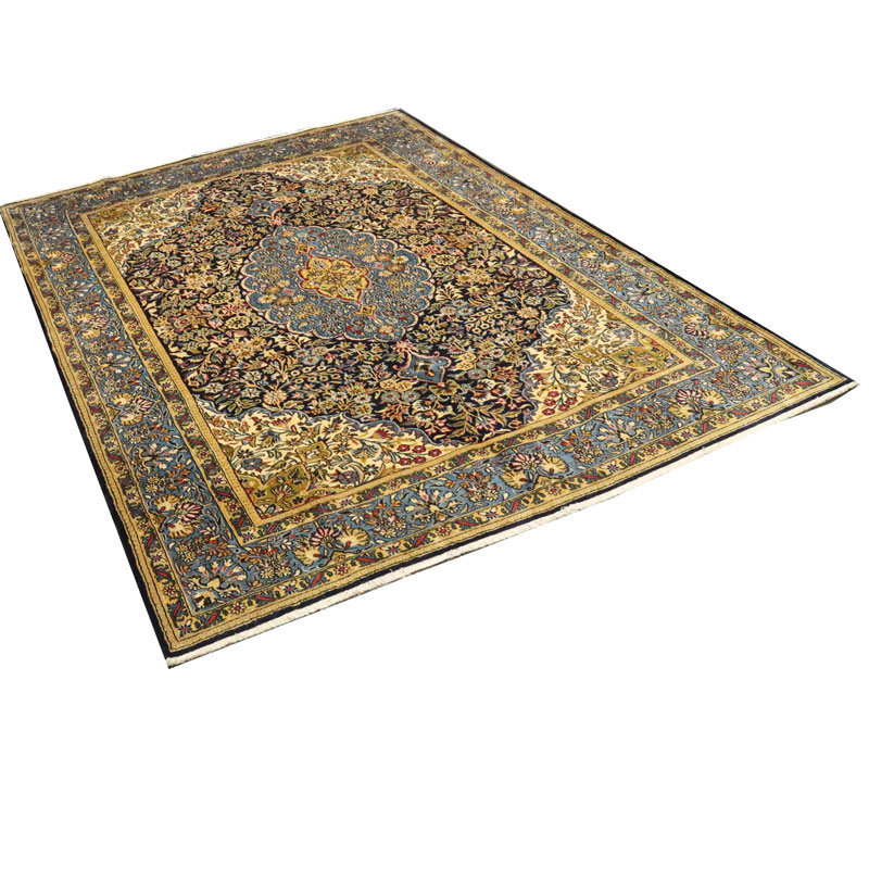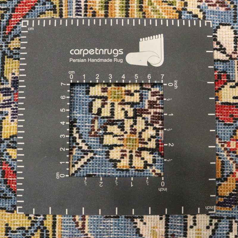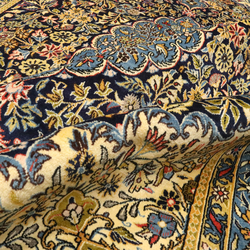 قالی دسبافت گل ابریشم شهرضا با ضخامت 3 میلیمتر و مساحت 7.5 متر مربع با طرح و نقشه لچک ترنج هندسی اسلیمی است.
