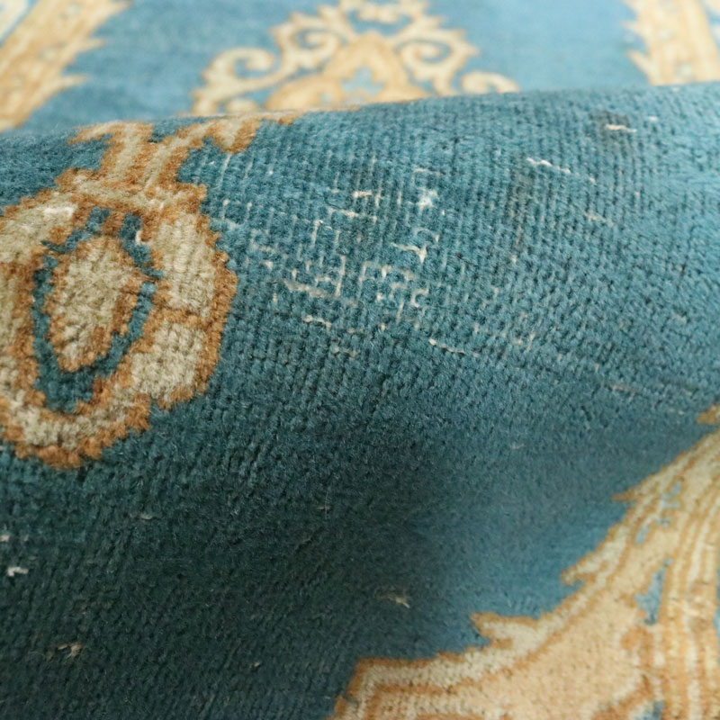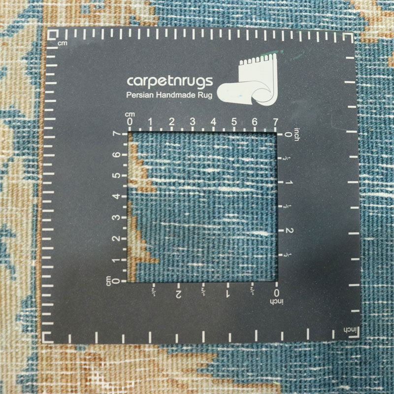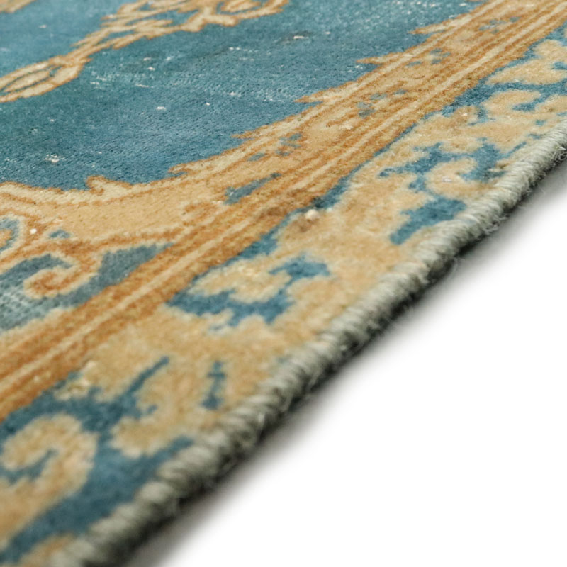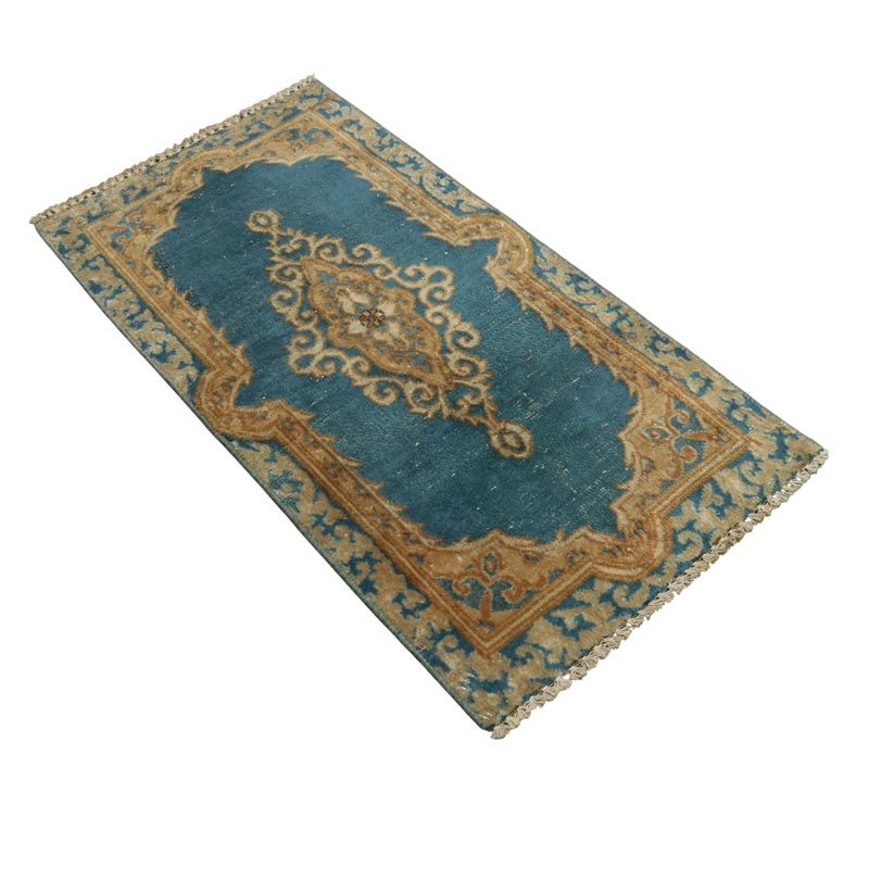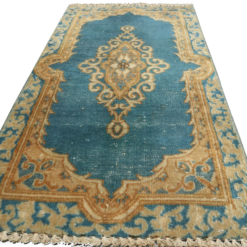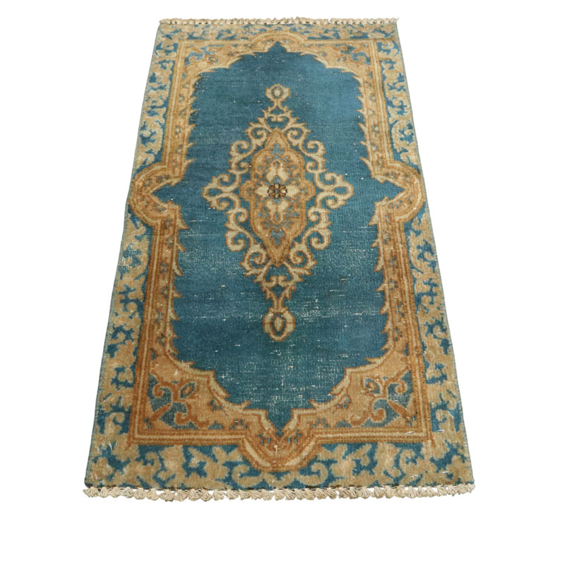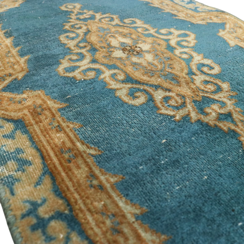 فرش وینتیج دستبافت (52×102) سانتیمتر با رنگ زمینه فیروزه ای و مساحت 0.53 مترمربع و وزن 1.85 کیلوگرم و ضخامت 0.4 میلیمتر است.