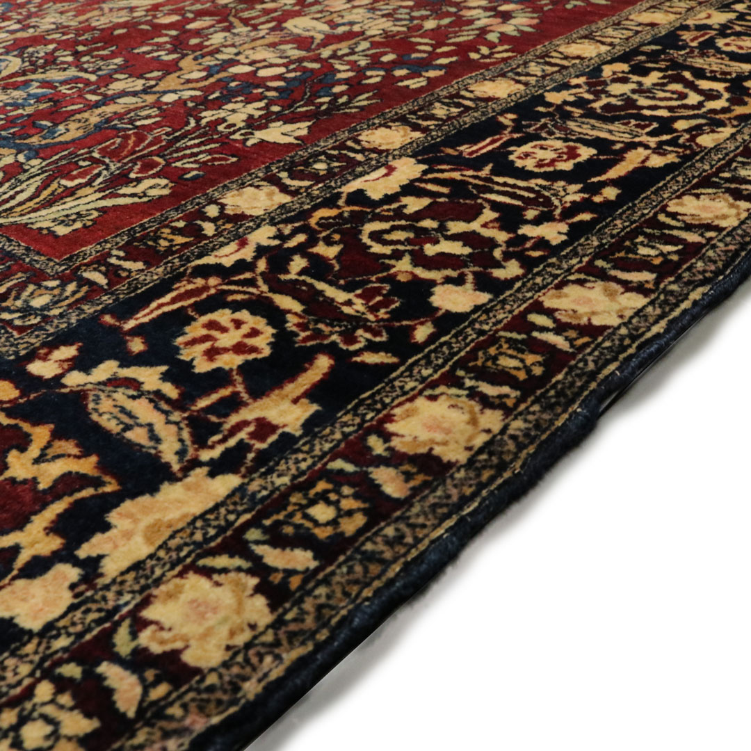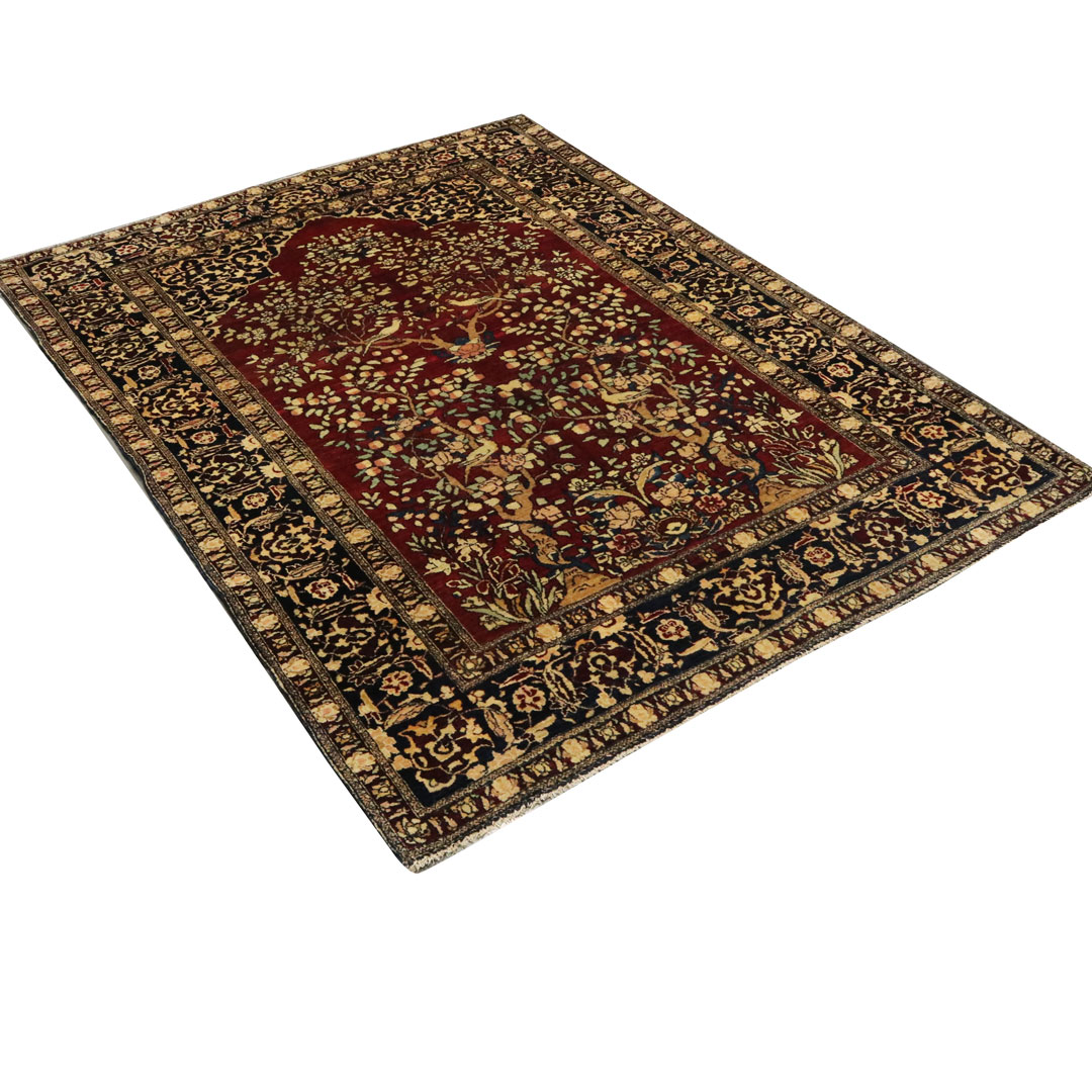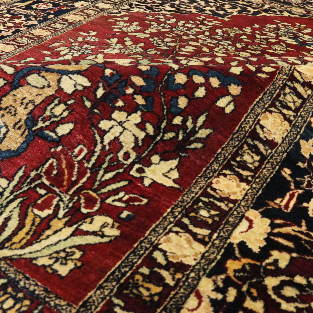 این قالیچه ی دست بافت یک قالیچه ی آنتیک با نقش و نگار گل و بوته با زمینه ی لاکی است .