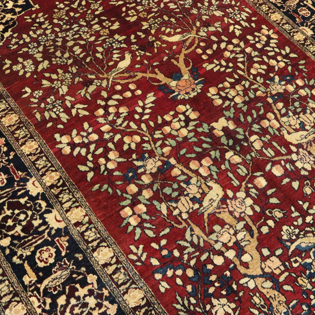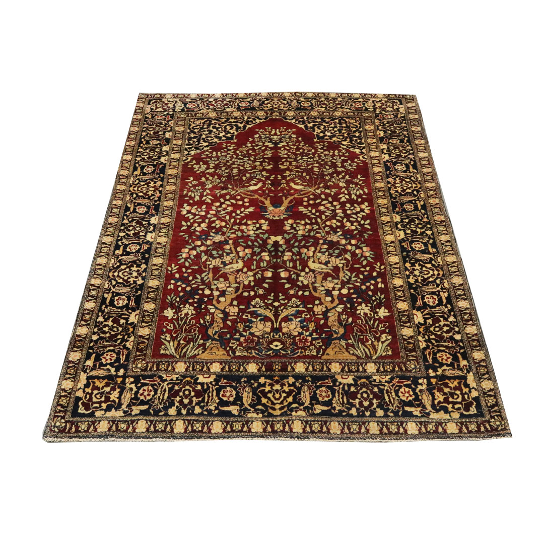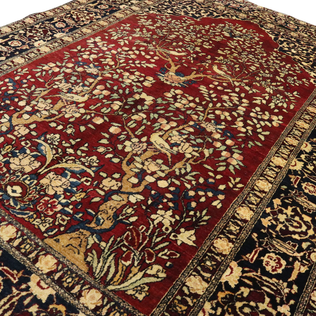 این قالیچه ی دست بافت یک قالیچه ی آنتیک با نقش و نگار گل و بوته با زمینه ی لاکی است .