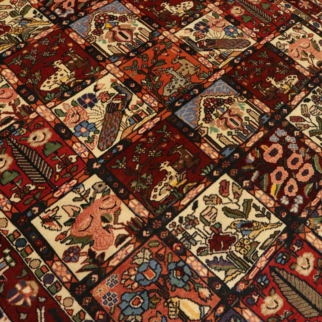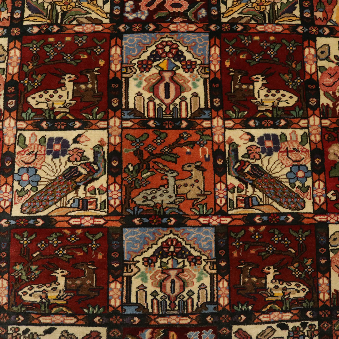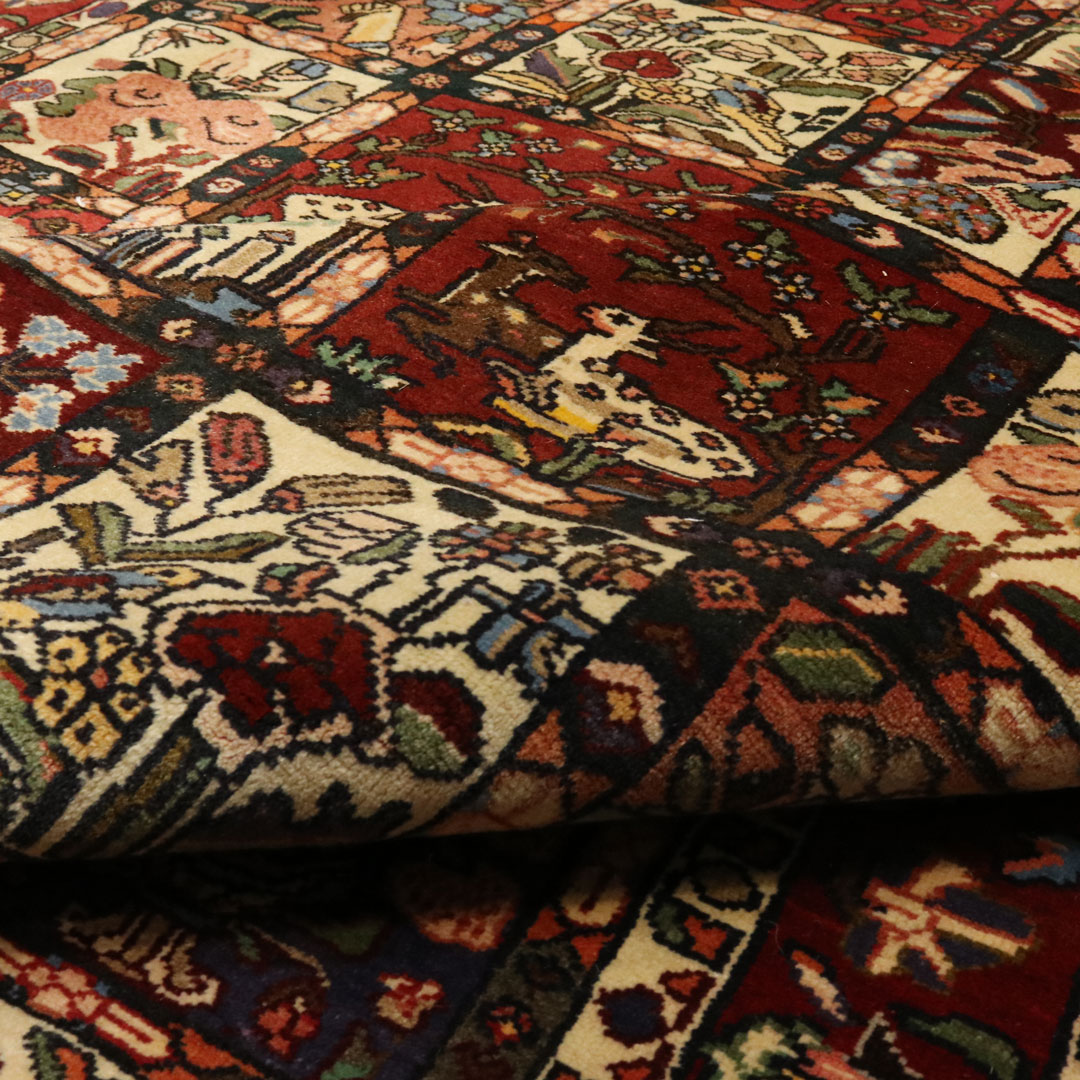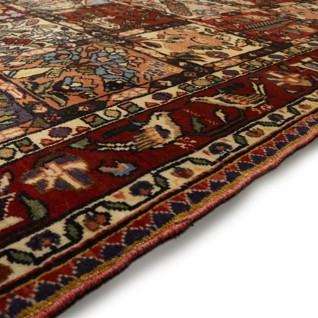 قالیچه دستبافت بختیار به شکل مستطیل و وزن 11.13 کیلوگرم و مساحت 3.18 متر مربع با متریال پشم و کتان طبیعی میباشد.