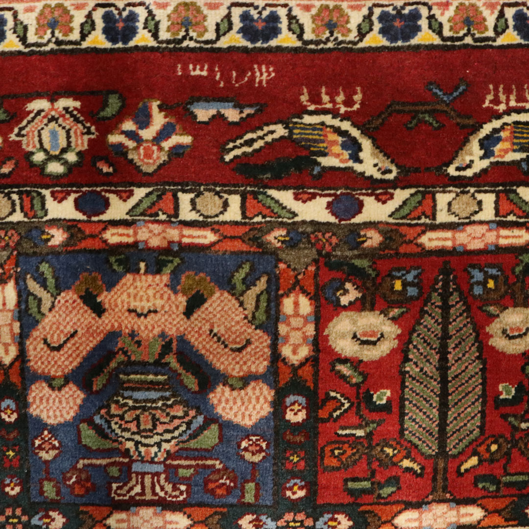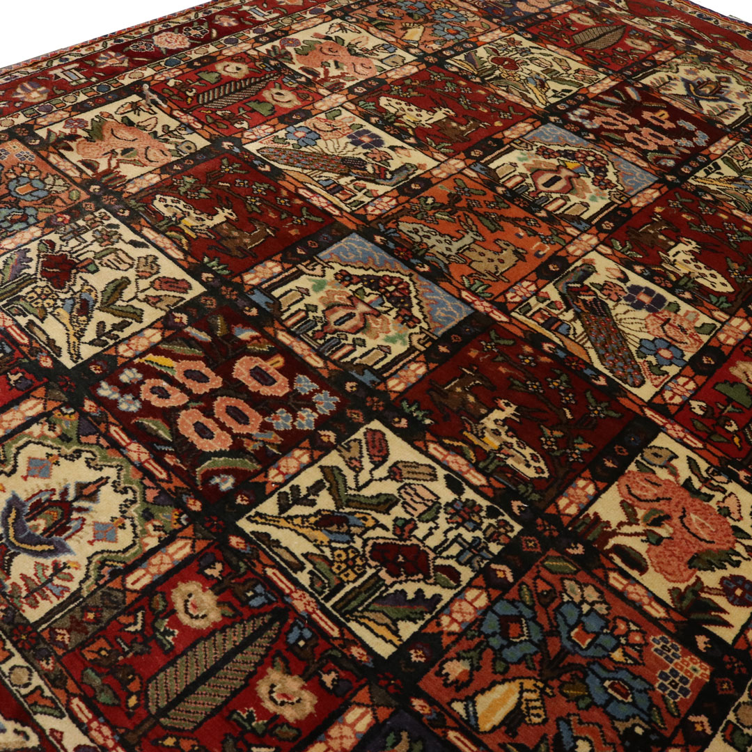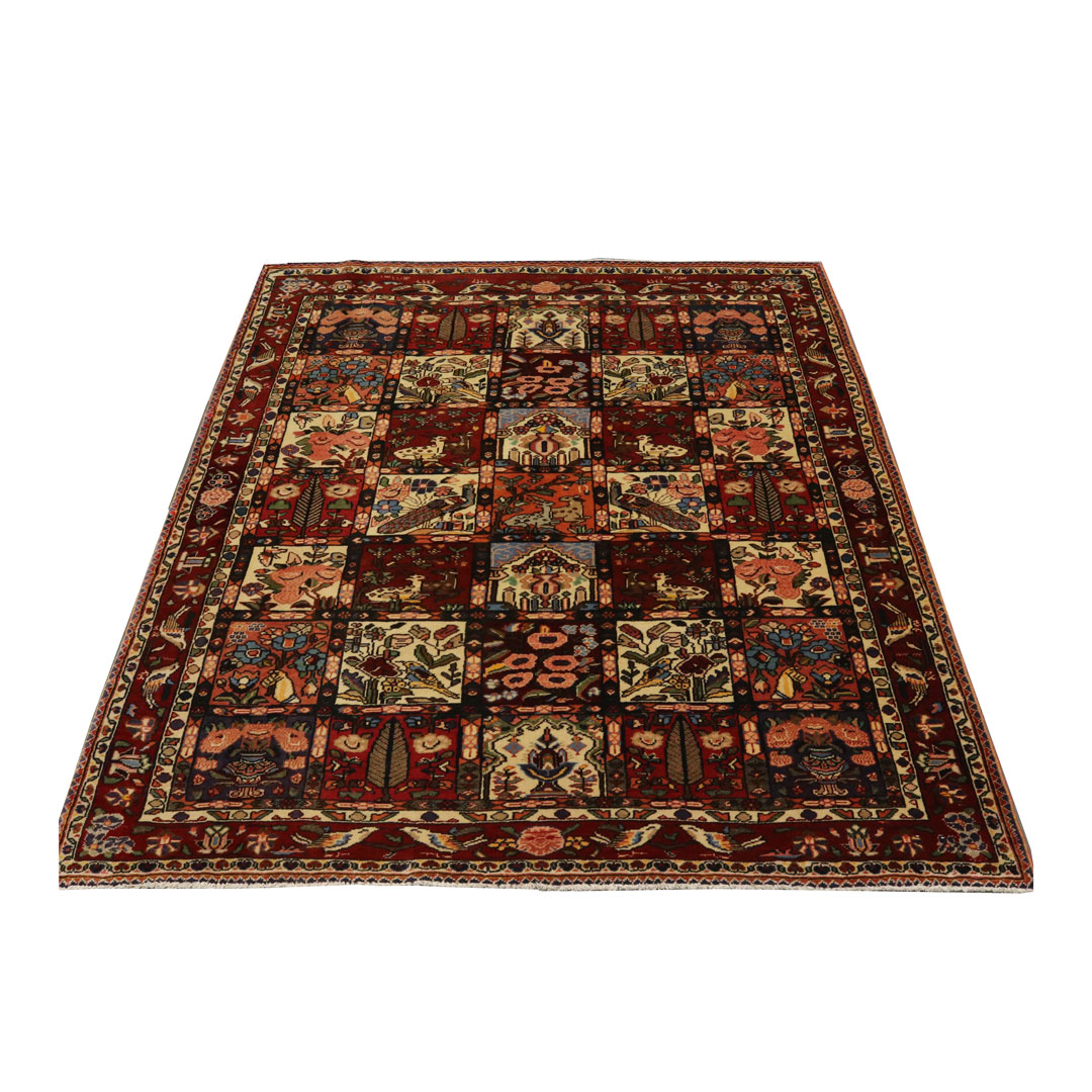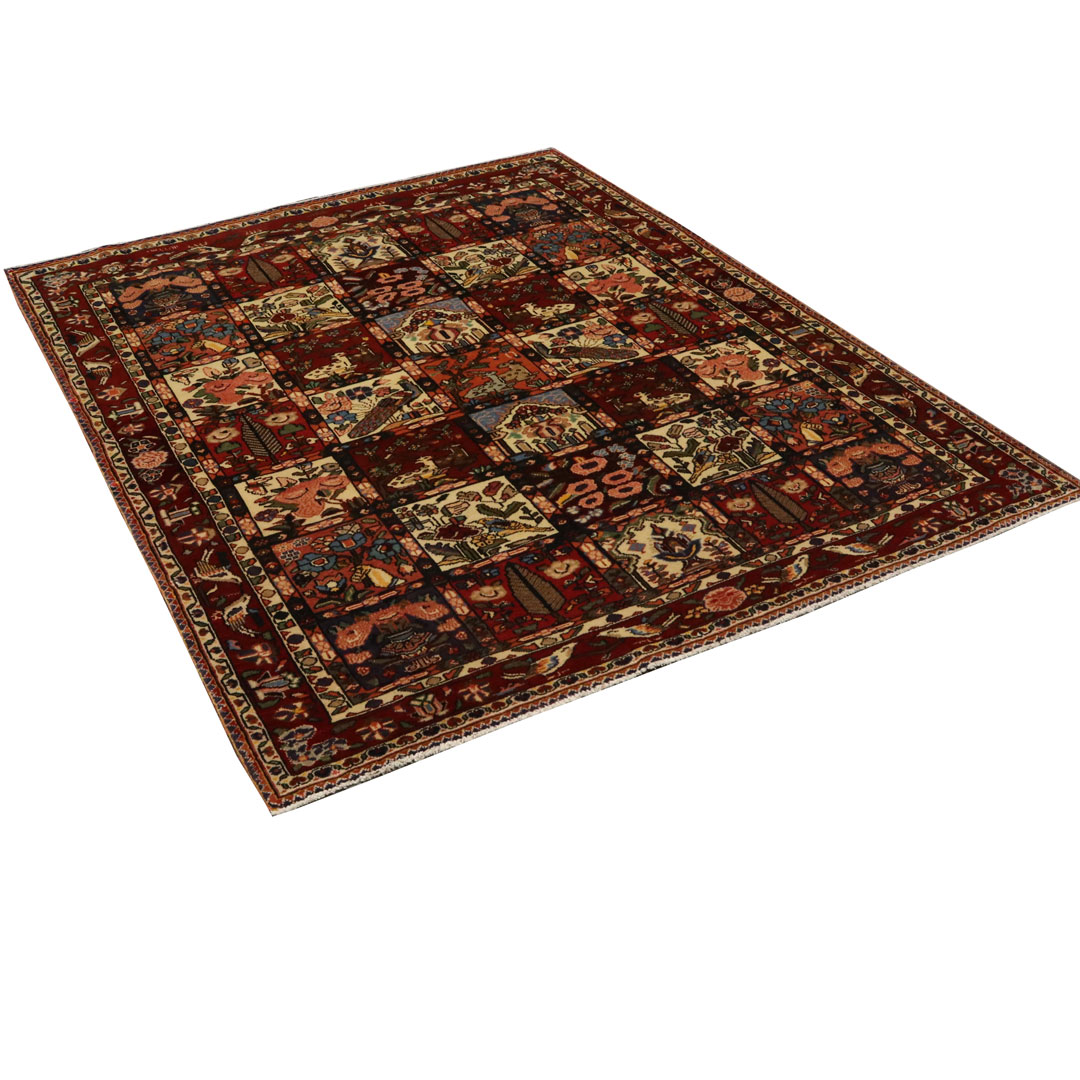 قالیچه دستبافت بختیار به شکل مستطیل و وزن 11.13 کیلوگرم و مساحت 3.18 متر مربع با متریال پشم و کتان طبیعی میباشد.