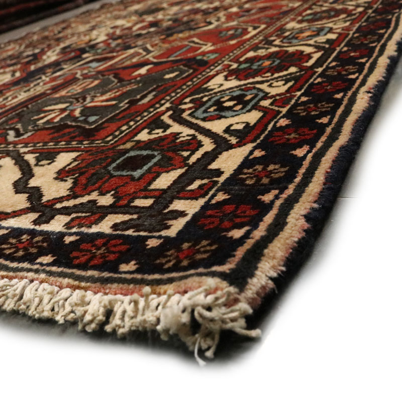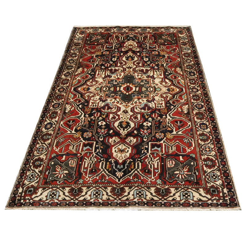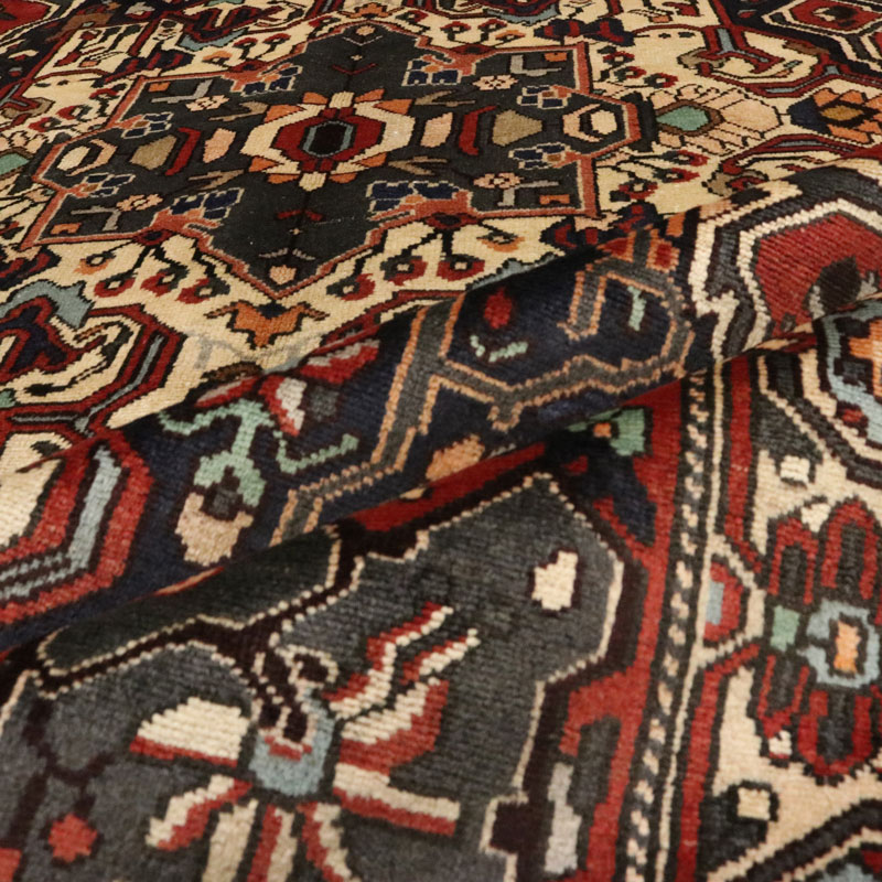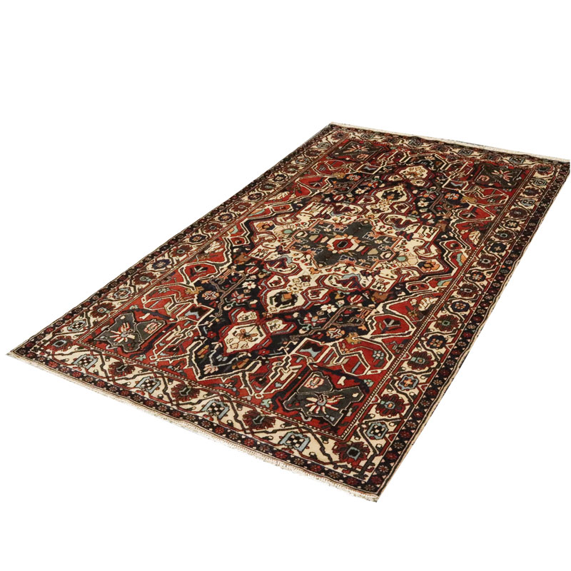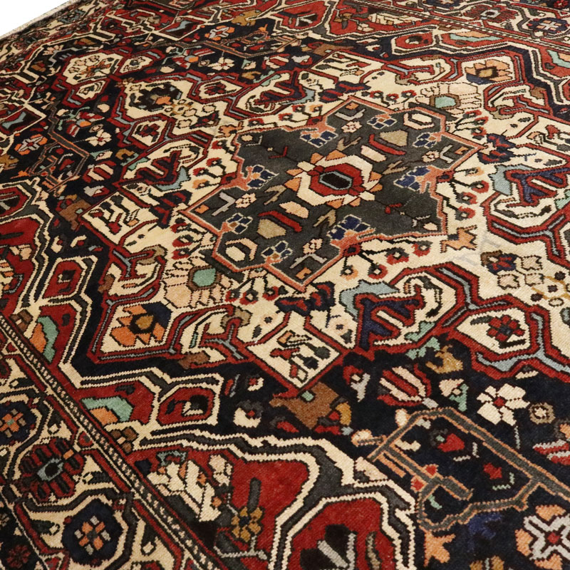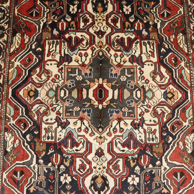 قالیچه دسبافت بختیار با مساحت 4.75 متر مربع و وزن 16.65 کیلوگرم و ضخامت 3 میلیمتر با رنگ متن سرمه ای و حاشیه کرم است.