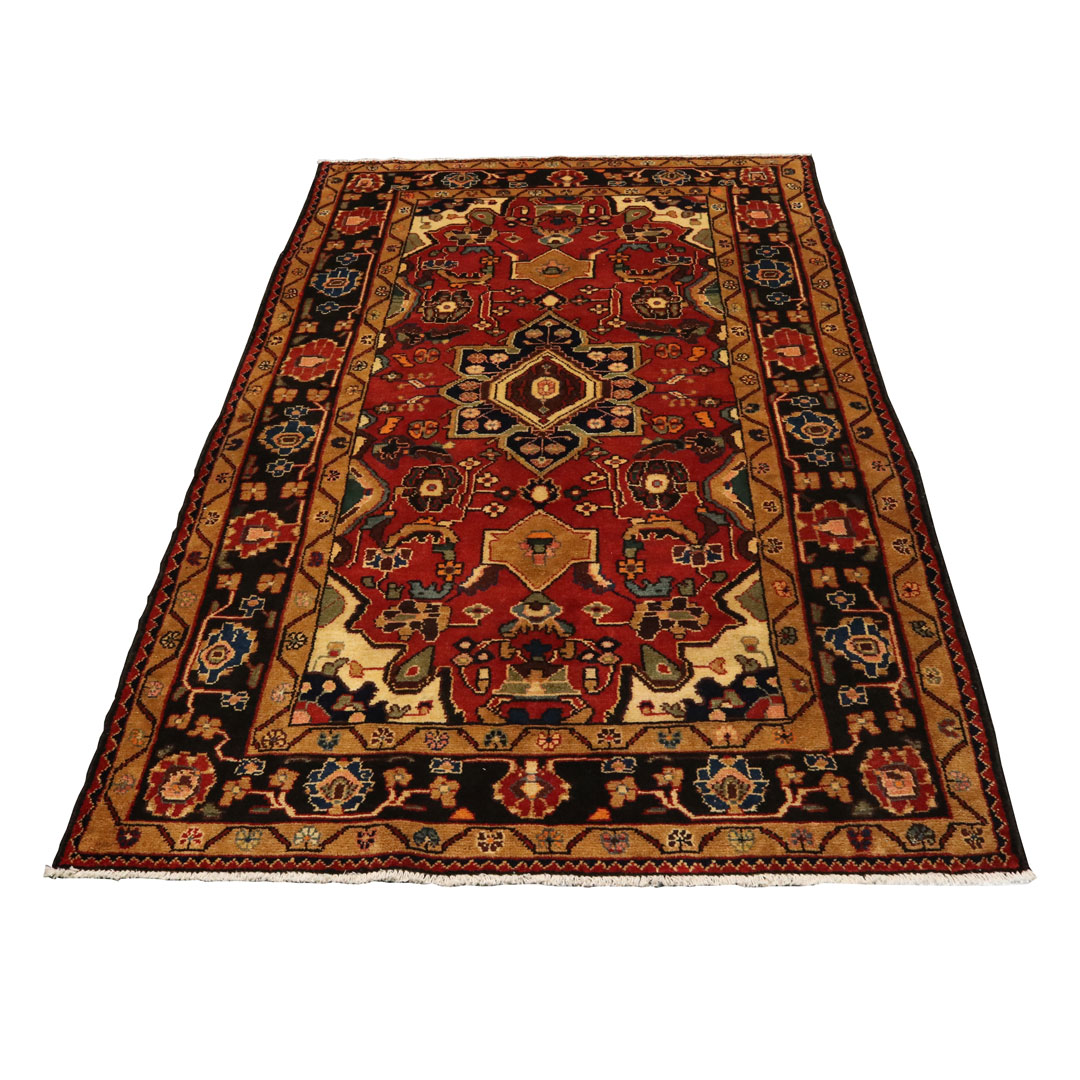 تصاویری که مشاهده میفرمایید مربوط به قالیچه ی دستبافت برچلو با رنگ زمینه لاکی و نقشه ی لچک ترنج است.