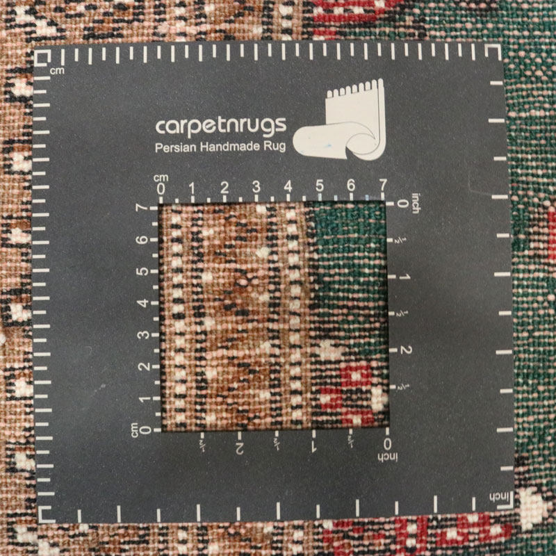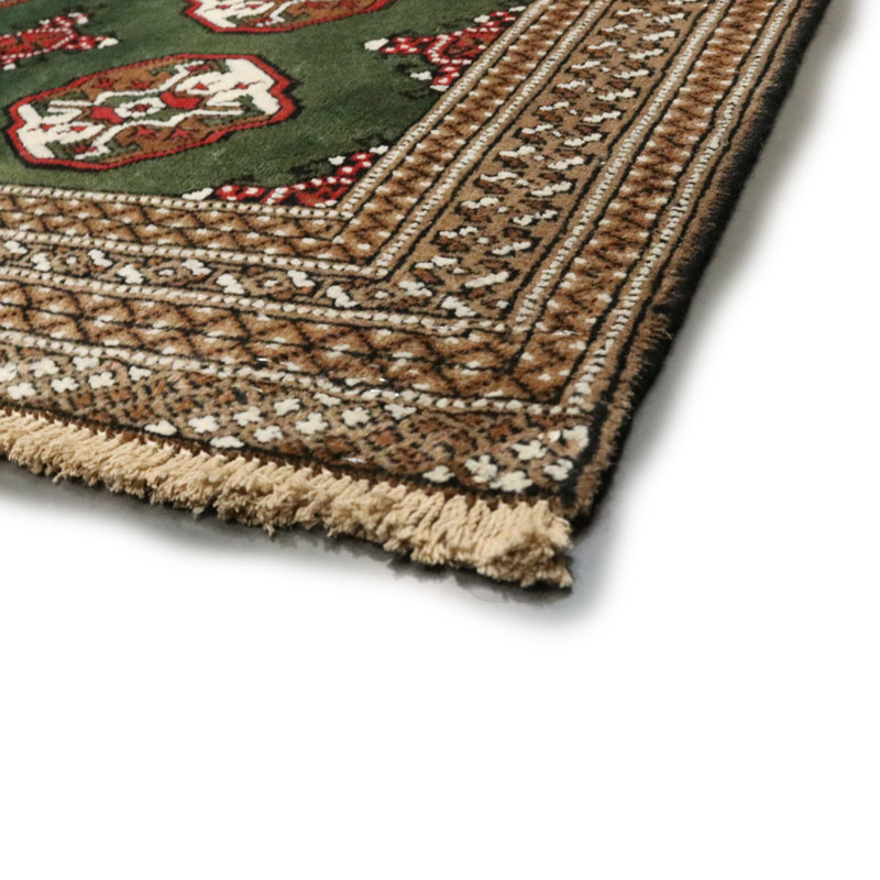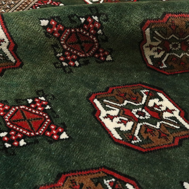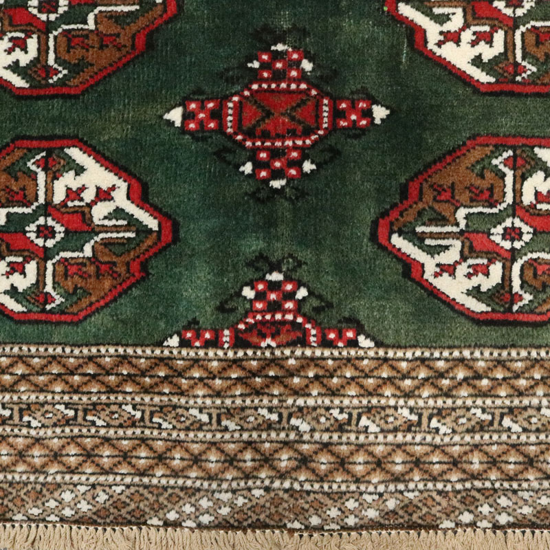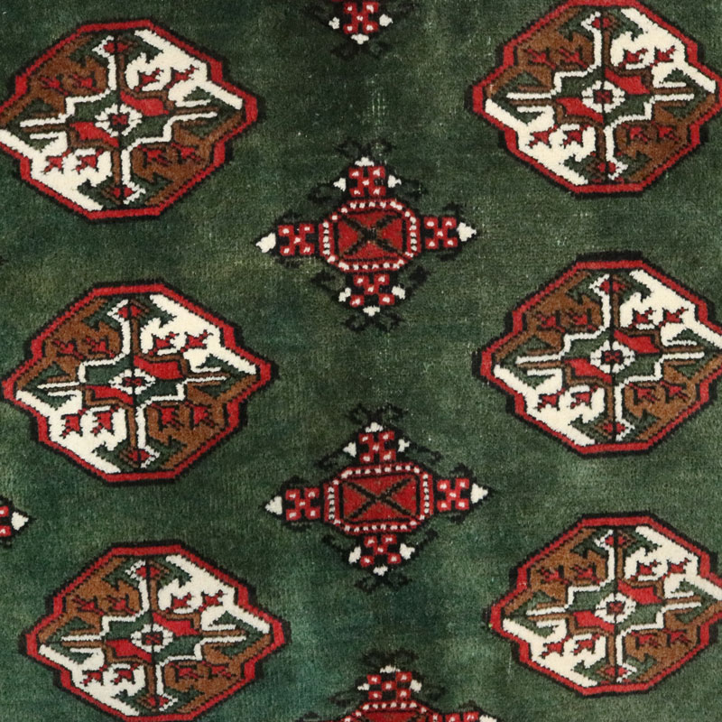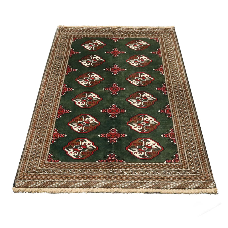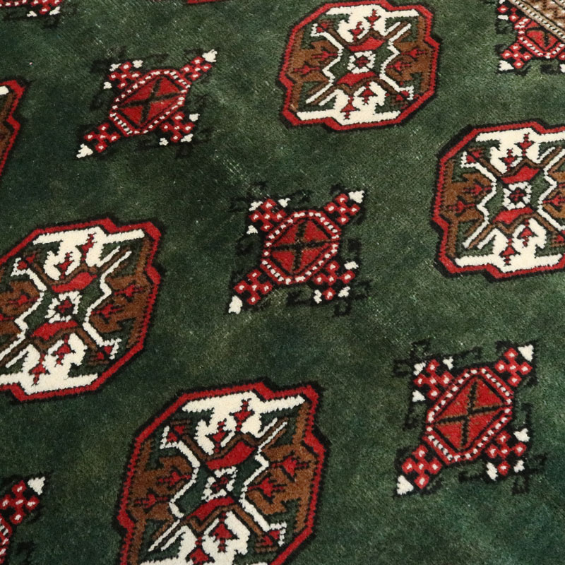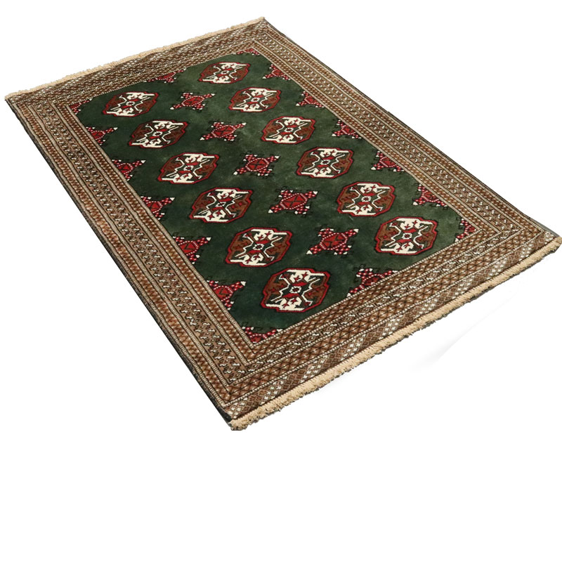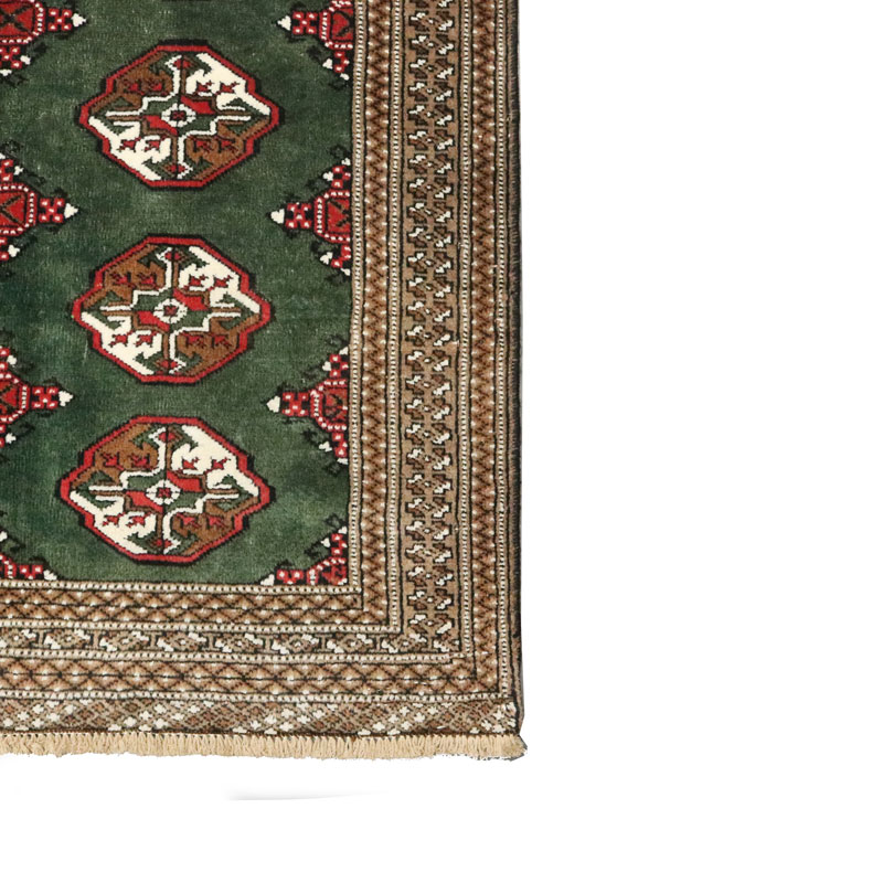 قالیچه دست بافت ترکمن با وزن 5.3 متر مربع و مساحت 1.5 متر مربع با رنگ زمینه سبز و رنگ حاشیه کرم میباشد.