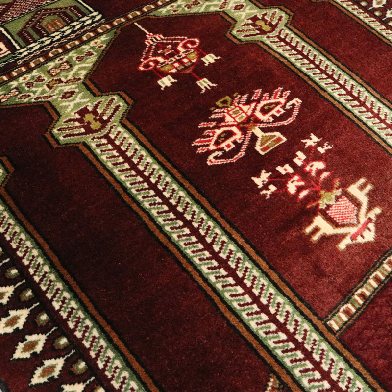 جنس تار و پود قالیچه دستبافت ترکمن (90×117) سانتیمتر از پشم خالص با طرح سراسر تصویری میباشد .