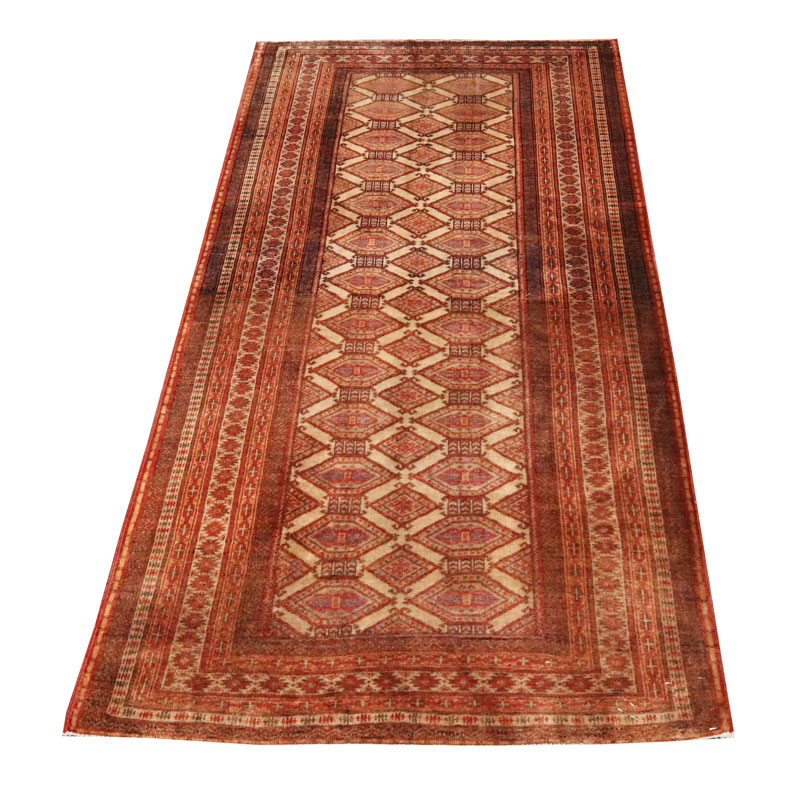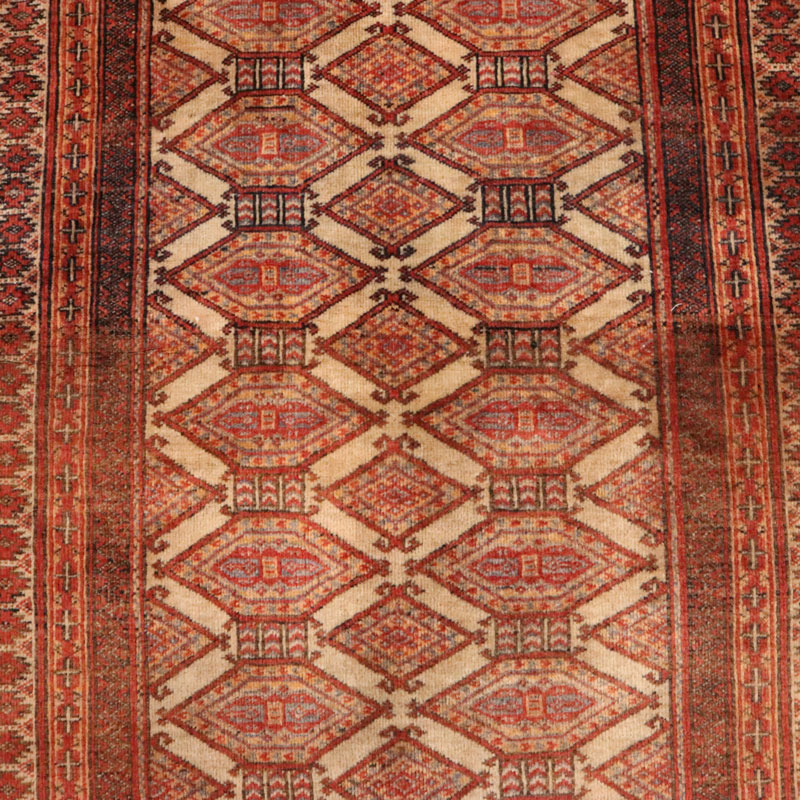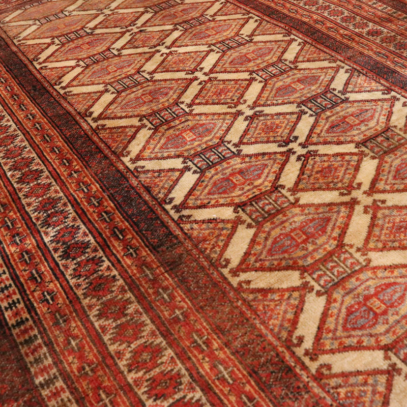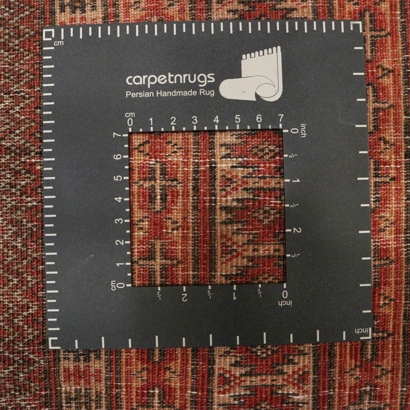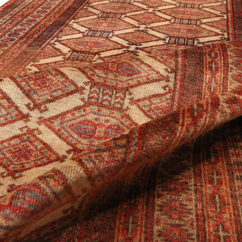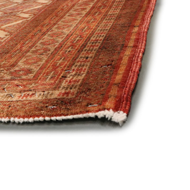 قالیچه دسبافت ترکمن با مساحت 1.6 متر مربع و وزن 5.6 کیلوگرم و ضخامت 2 میلیمتر از جنس پشم و کتان است .
