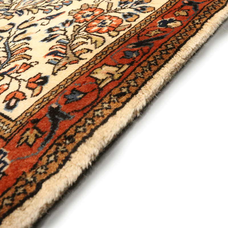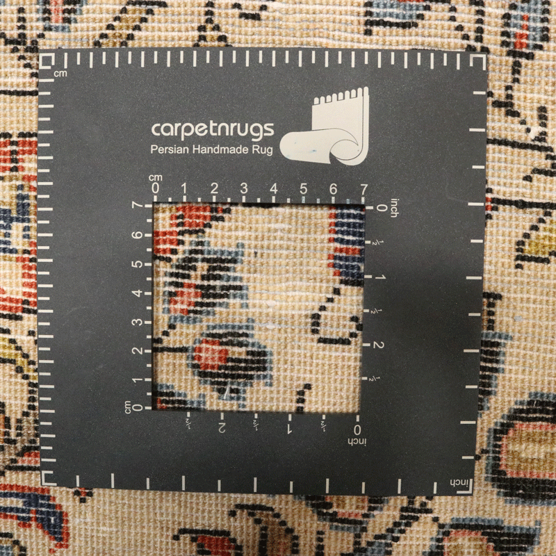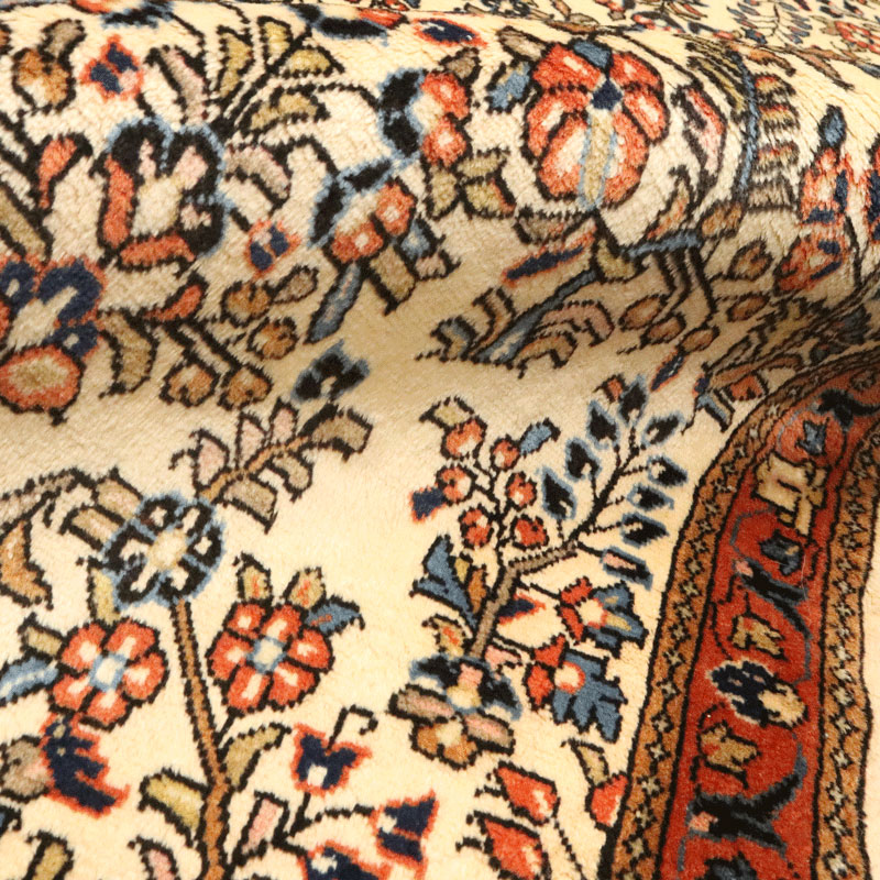 طرح فرش گل و فرنگ و با زمینه رنگ روشن و از جنس پشم و کتان طبیعی میباشد.
