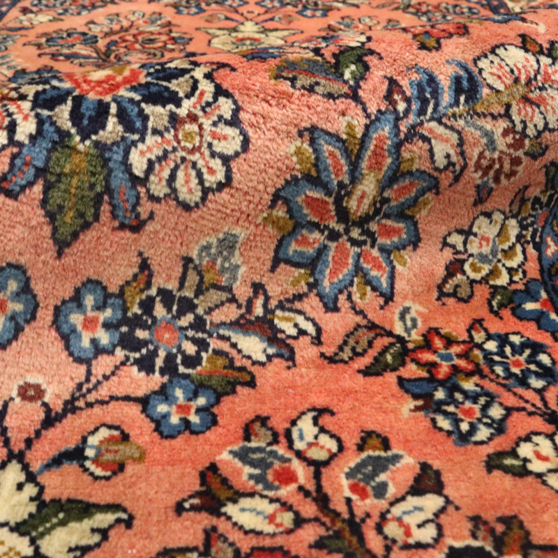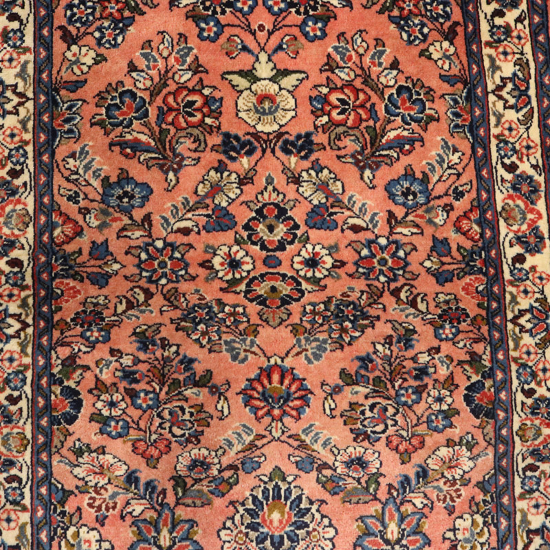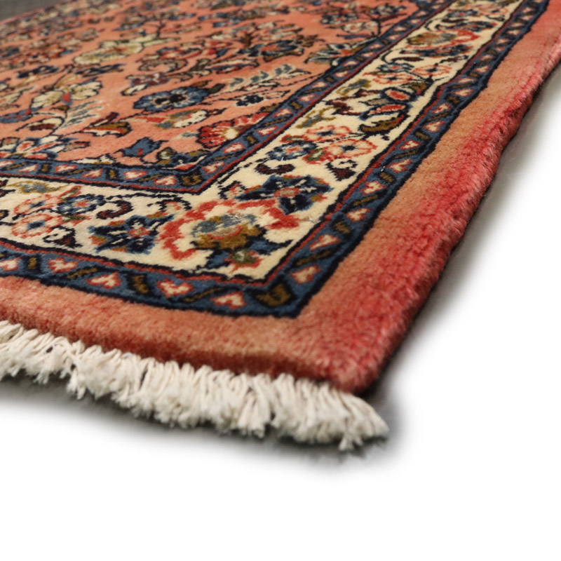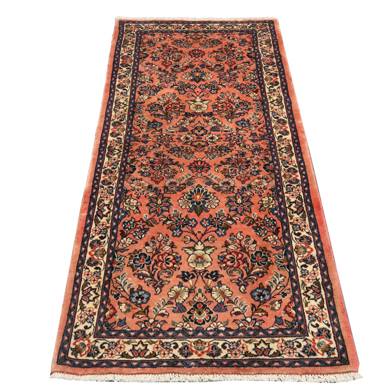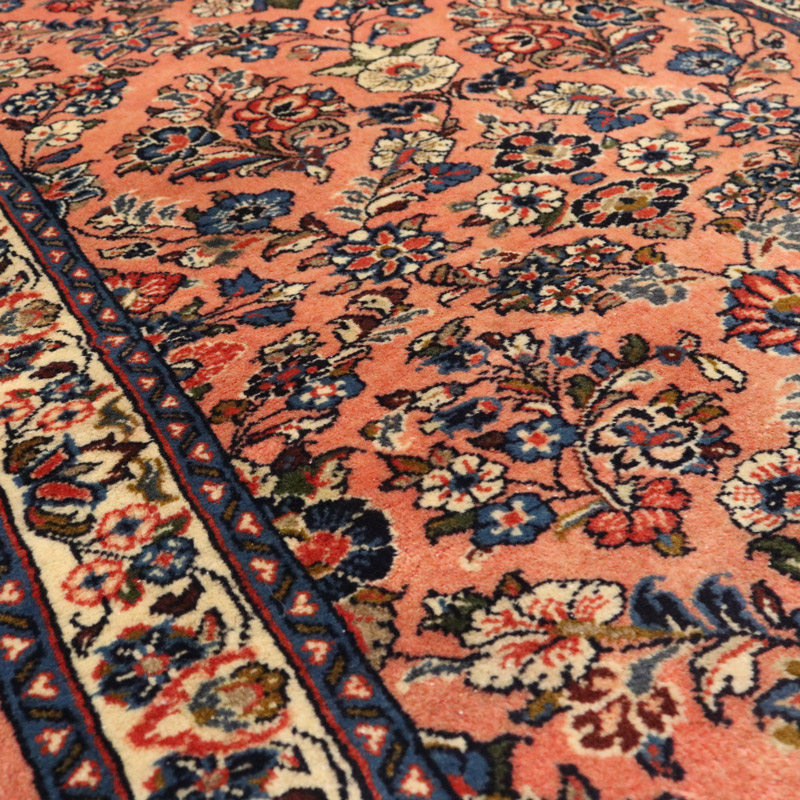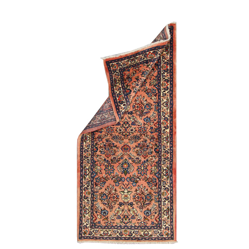 قالیچه دستبافت ساروق (85×189) سانتیمتر با ترکیب رنگی صورتی و کرم و مساحت 1.6 متری و وزن 5.6 کیلوگرم بسیار خوش بافت است.