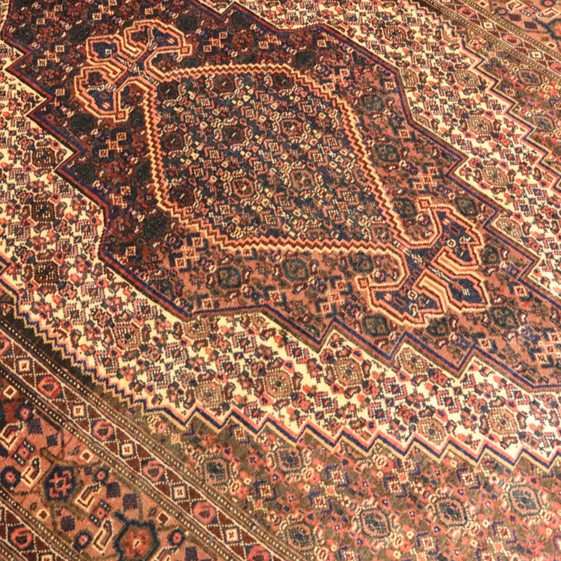 یک قالیچه دست بافت سنندج با بکارگیری از الیاف پشم و کتان طبیعی و ارگانیک را از زوایای مختلف را مشاهده میفرمایید .
