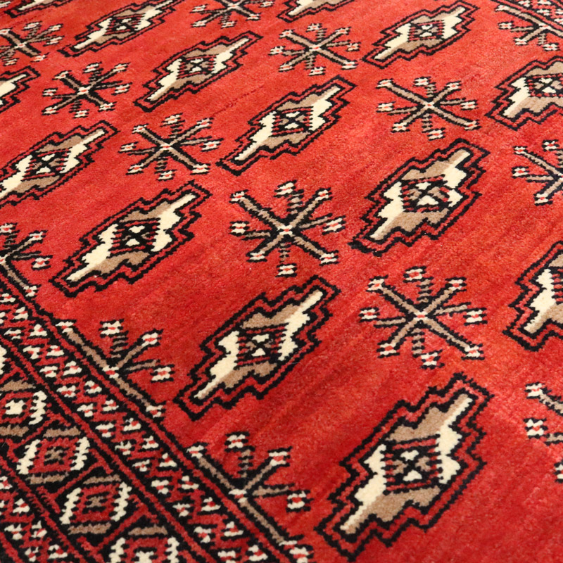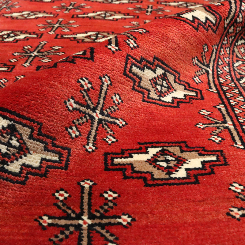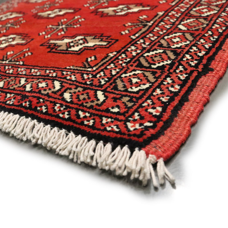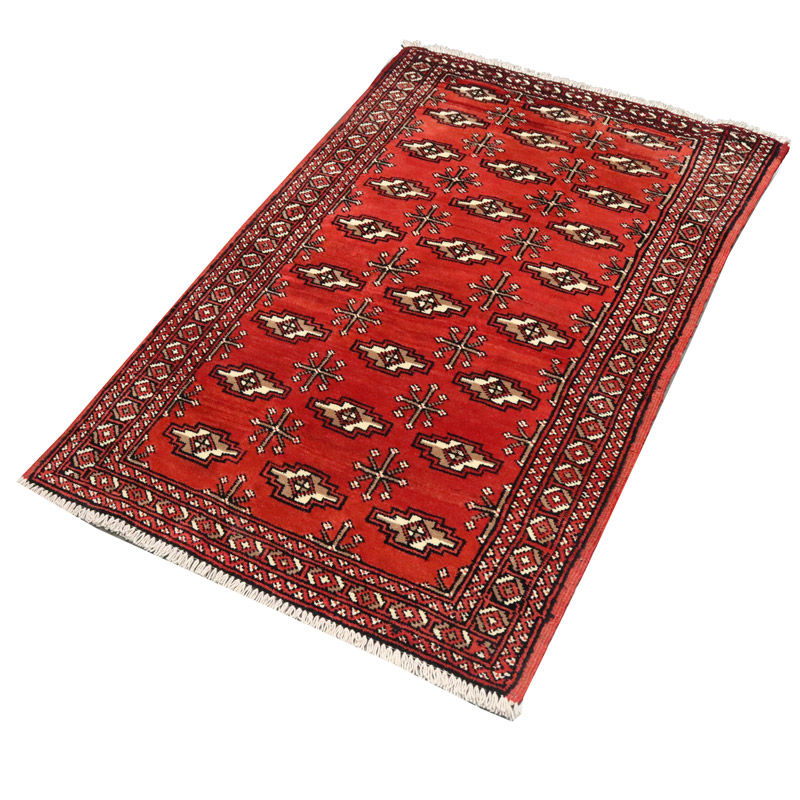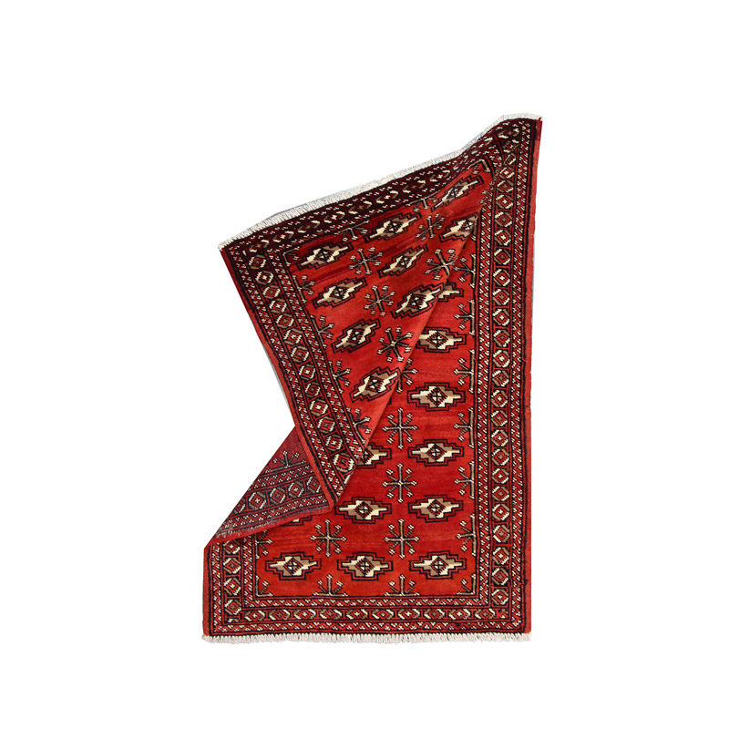 قالیچه دستبافت صادراتی ترکمن (80×130) سانتیمتر که تصاویر آن را از زوایای مختلف مشاهده میفرمایید دارای رنگ زمینه لاکی و حاشیه مشکی است.
