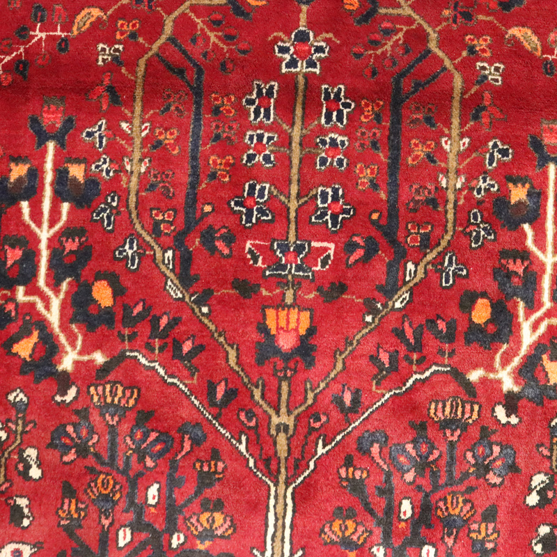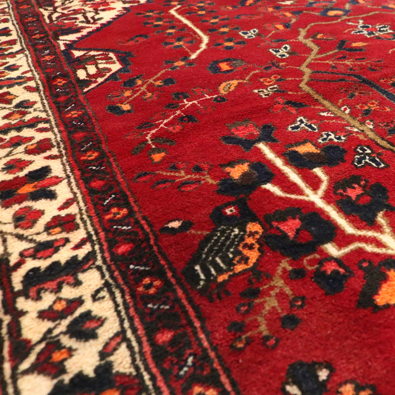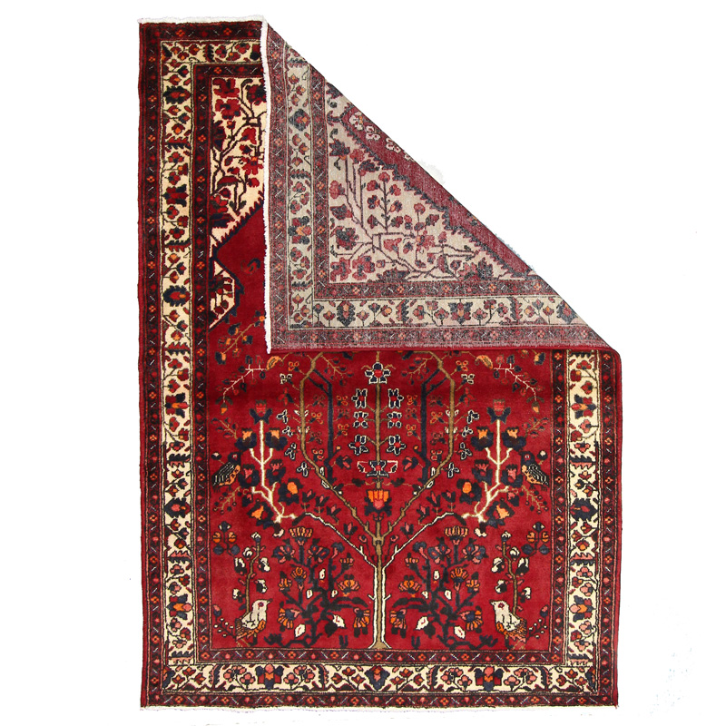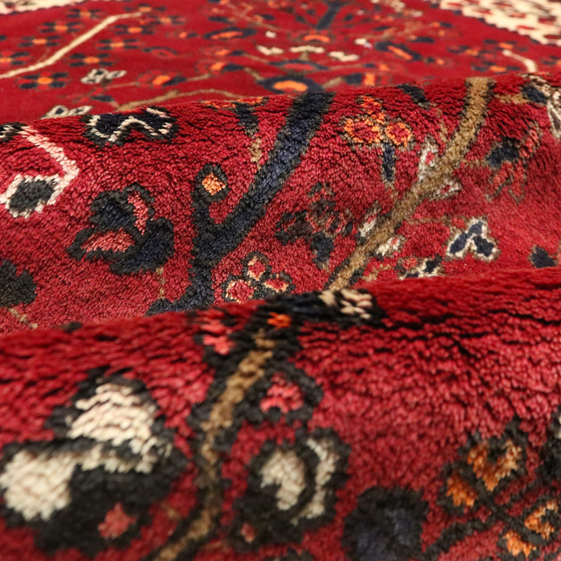 ضخامت این قالیچه دستبافت فردوس (126×193) سانتیمتر 0.5 میلیمتر از جنس پشم خالص و کتان و طرح درختی است.