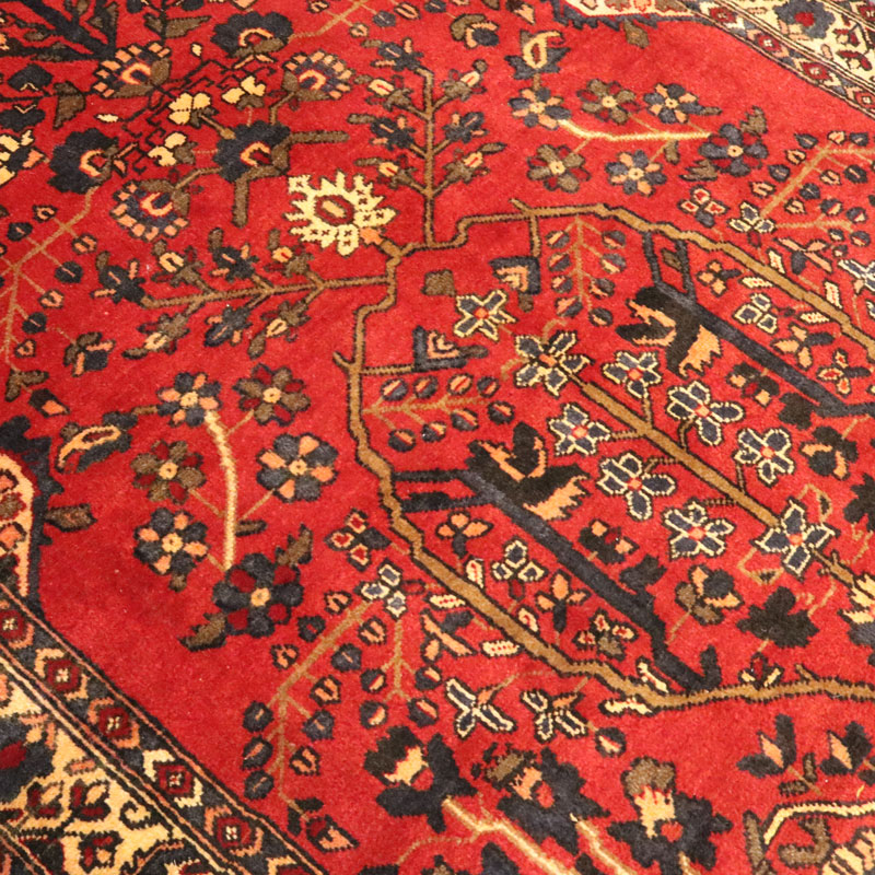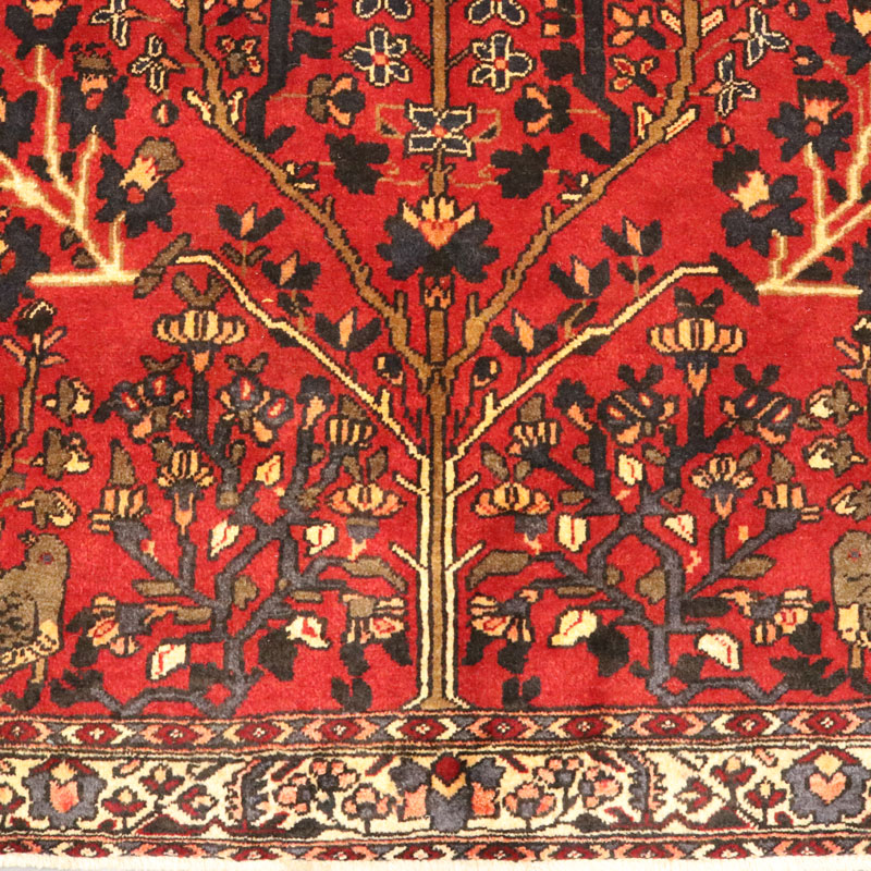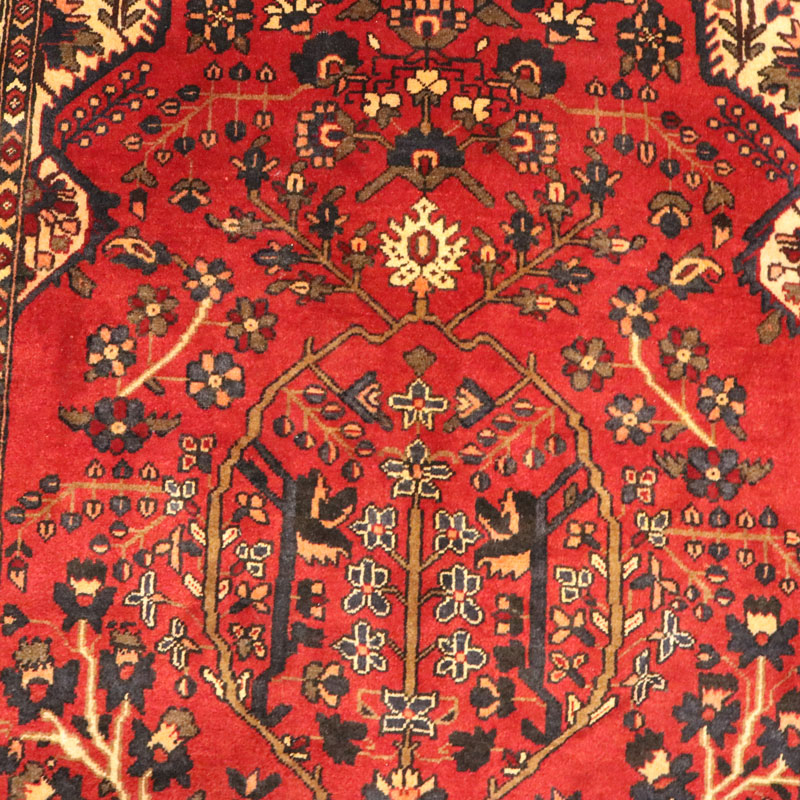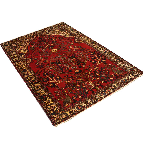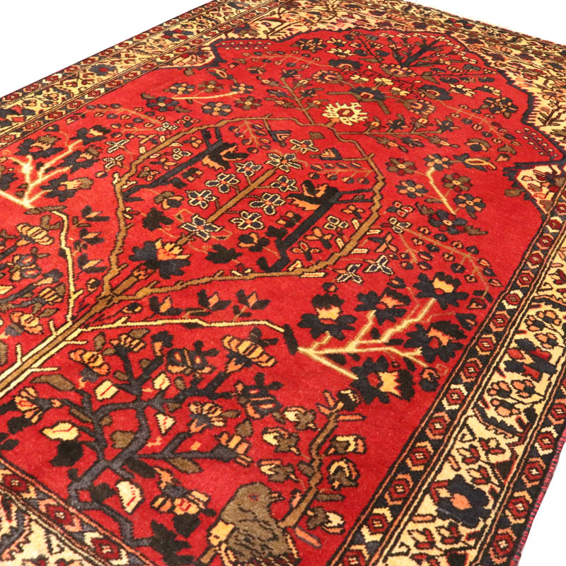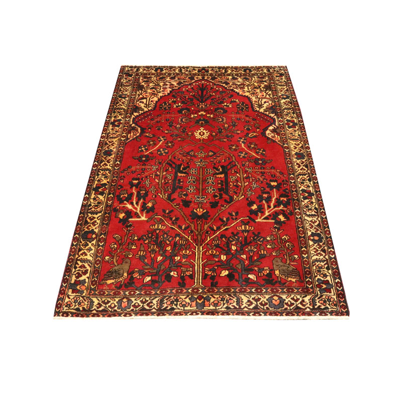 قالیچه دست بافت فردوس با رنگ زمینه قرمز و طرح گل و مرغ را مشاهده میفرمایید.
