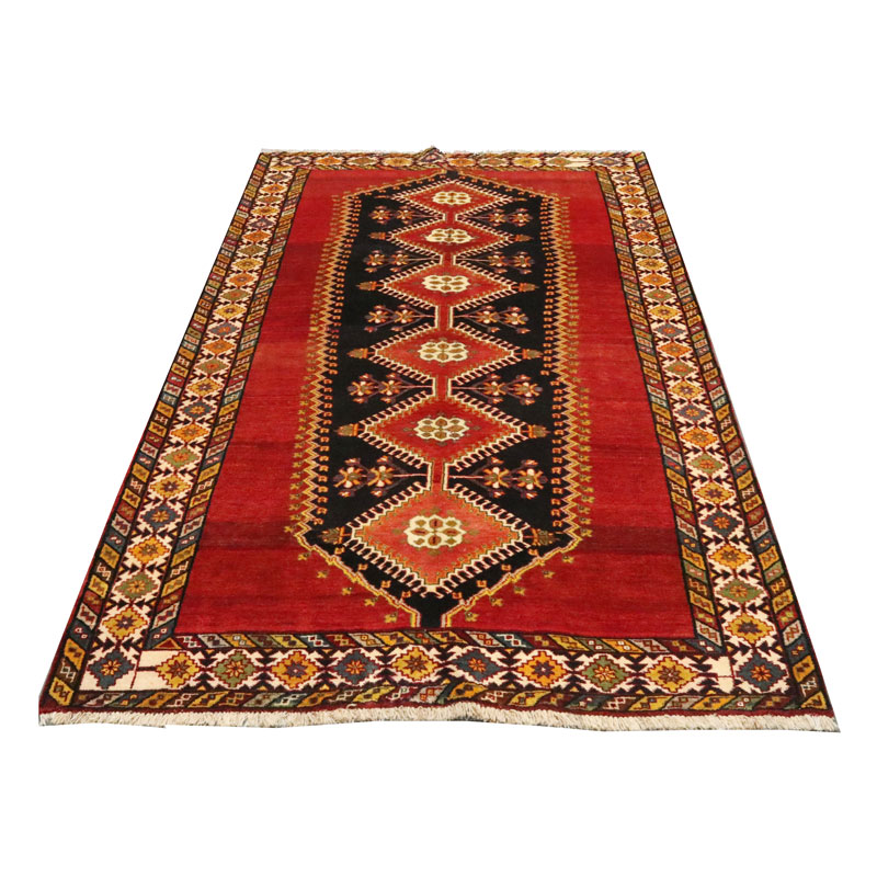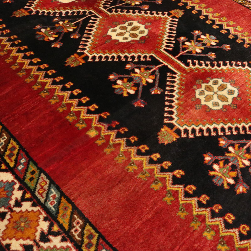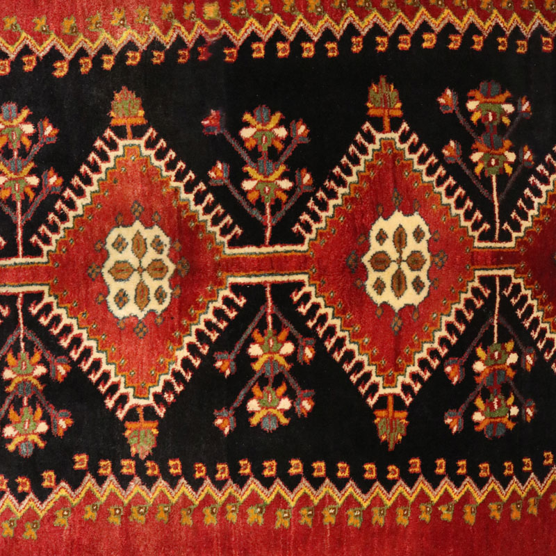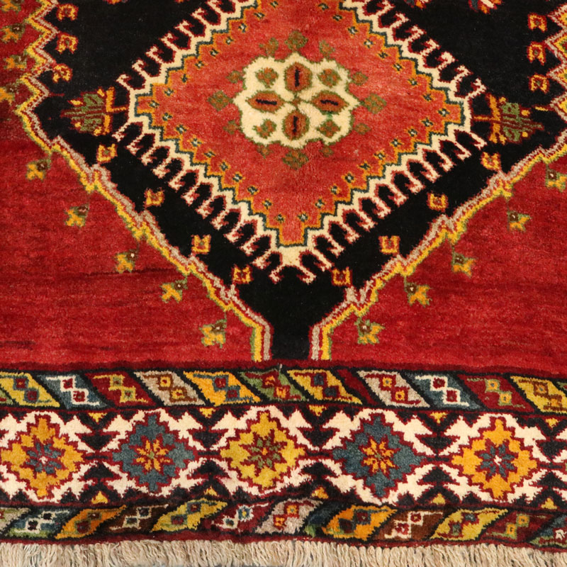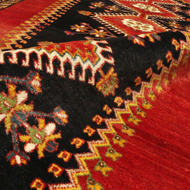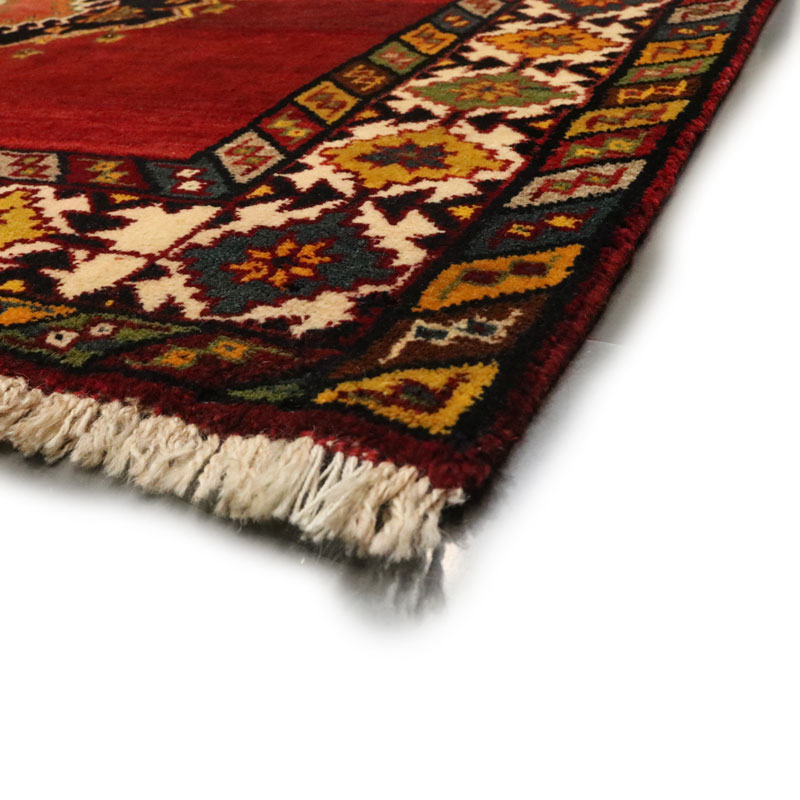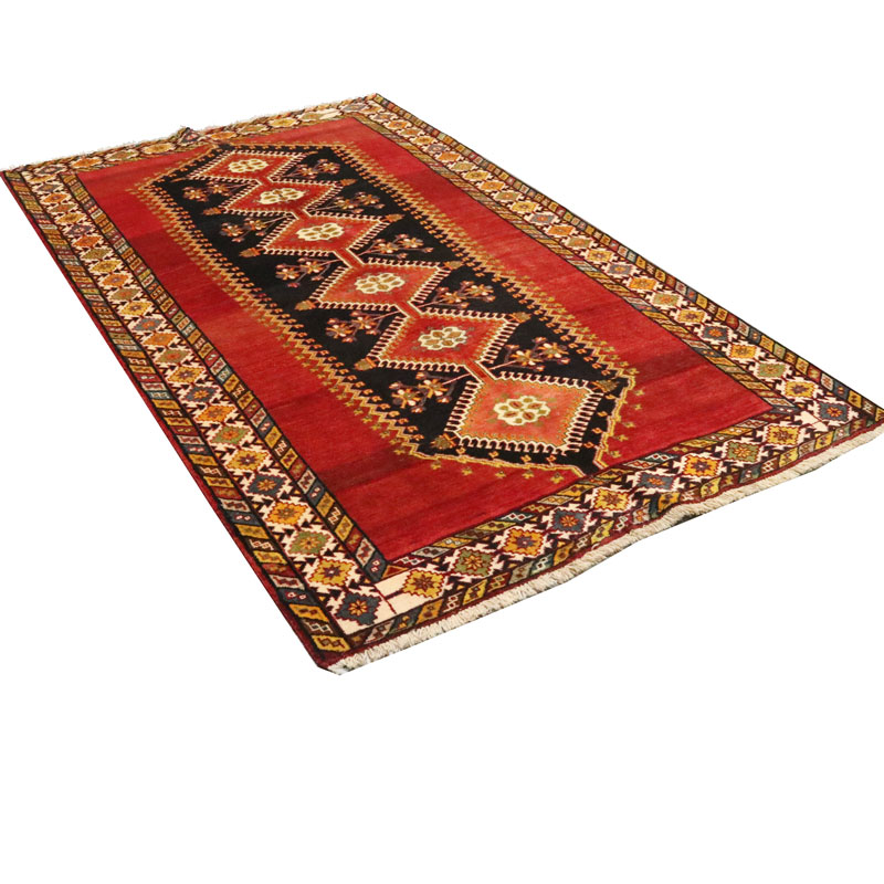 ضخامت این قالیچه دسبافت قشقایی 4 میلیمتر با طرح لچک ترنج هندسی و رنگ زمینه لاکی و حاشیه کرم است.