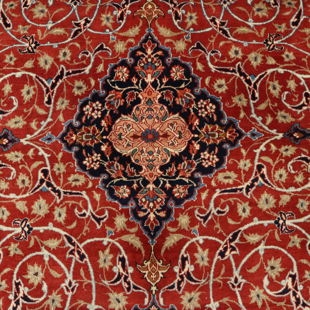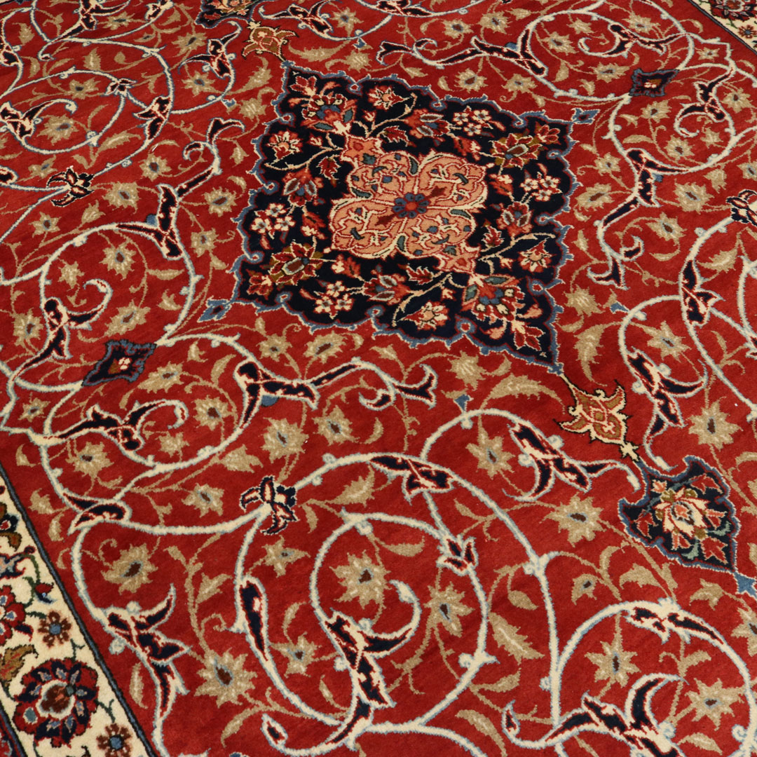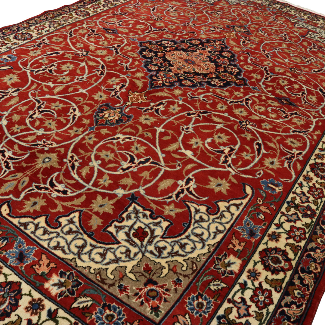 قالیچه ای که مشاهده میفرمایید یک قالیچه ی 4 متری با زمینه لاکی رنگ و طرح لچک ترنج محصول نجف آباد اصفهان میباشد.