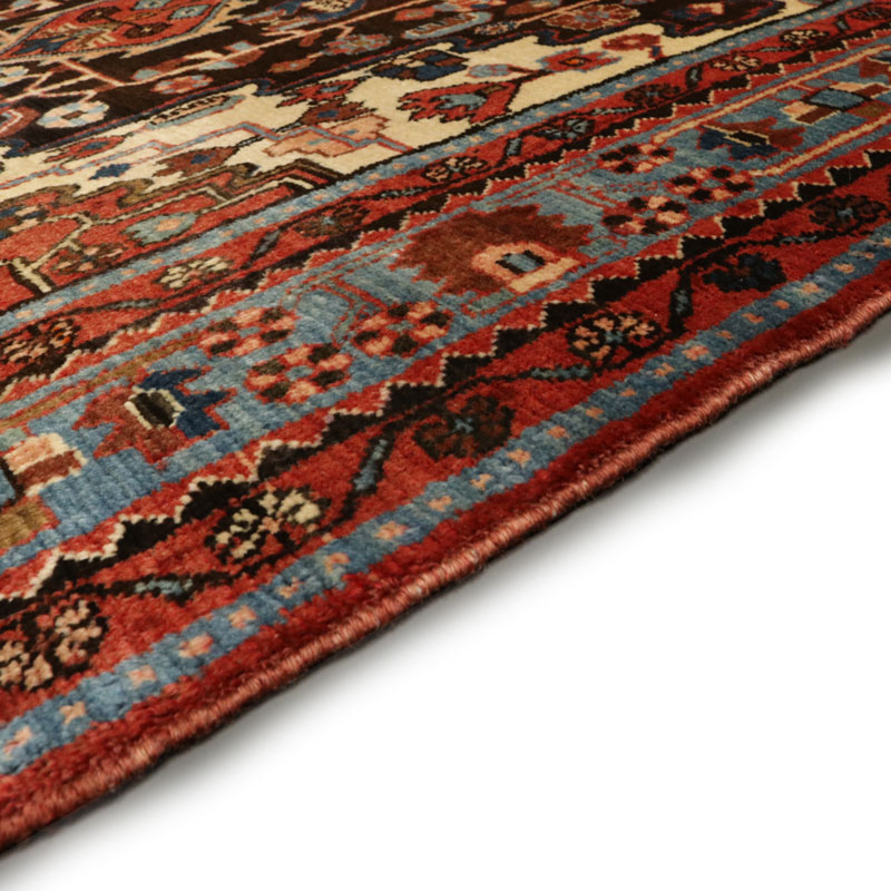 رنگ زمینه قالیچه تیره و رنگ حاشیه آبی است .طرح کاربردی لچک ترنج است .