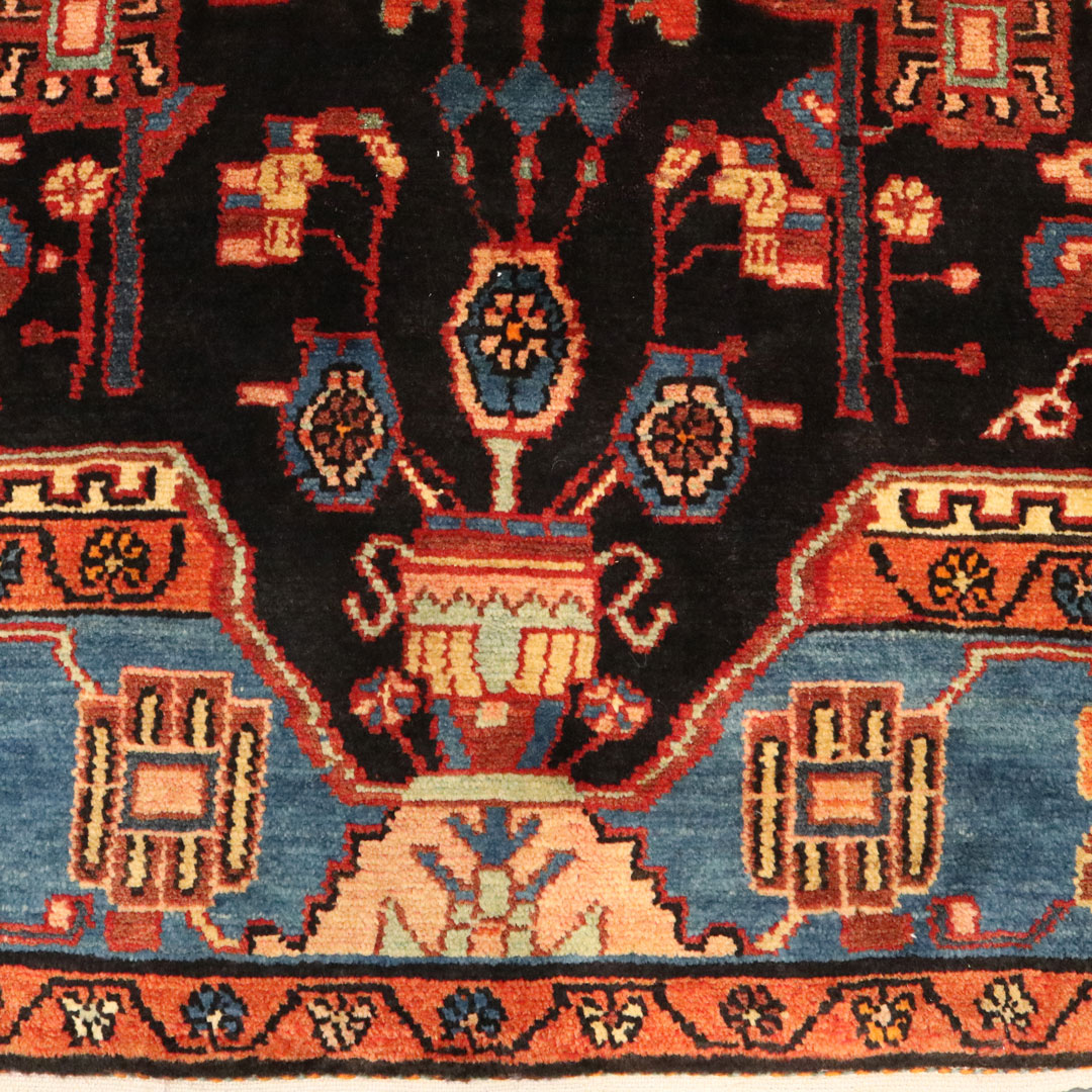 حاشیه فرش آبی است و فرش مستطیلی شکل از جنس پشم و کتان میباشد.