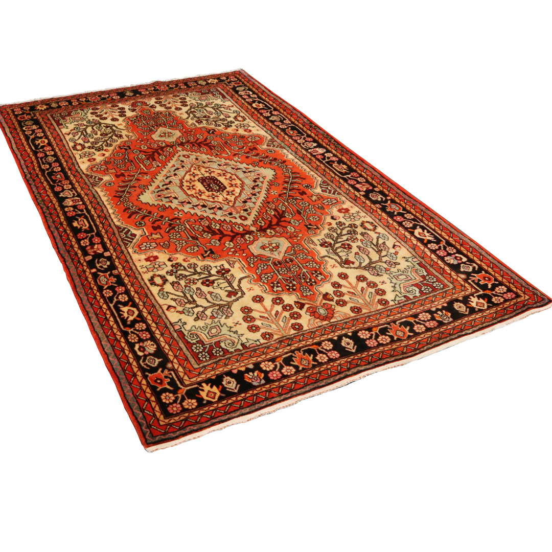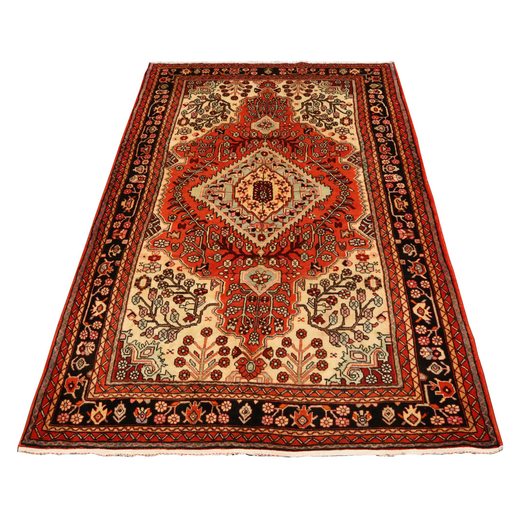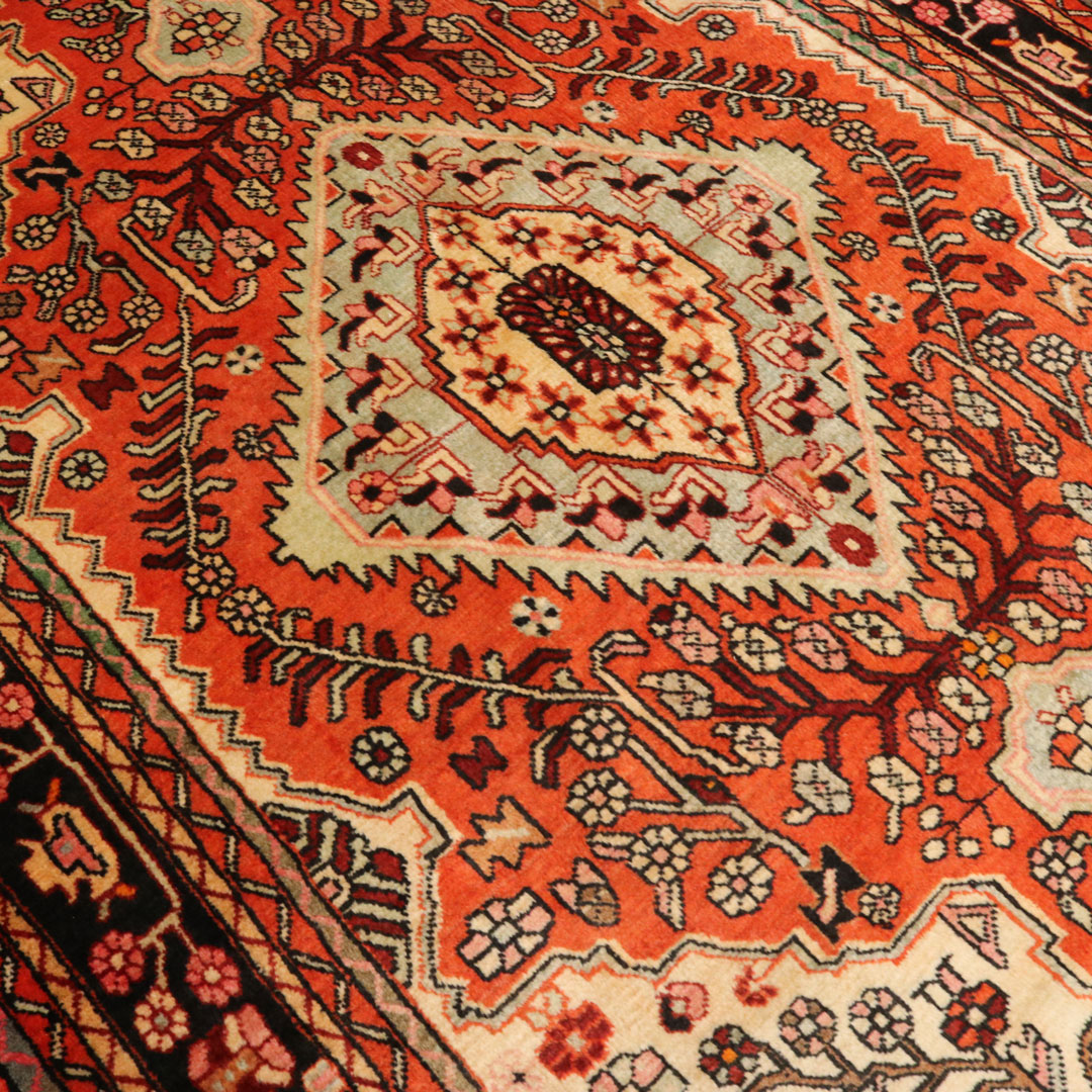 قالیچه دست بافت نهاوند با مساحت 3.95 متر مربع و وزن 13.85 کیلوگرم با رنگ زمینه لاکی و حاشیه تیره رنگ با نقشه لچک ترنج