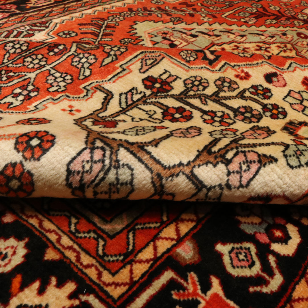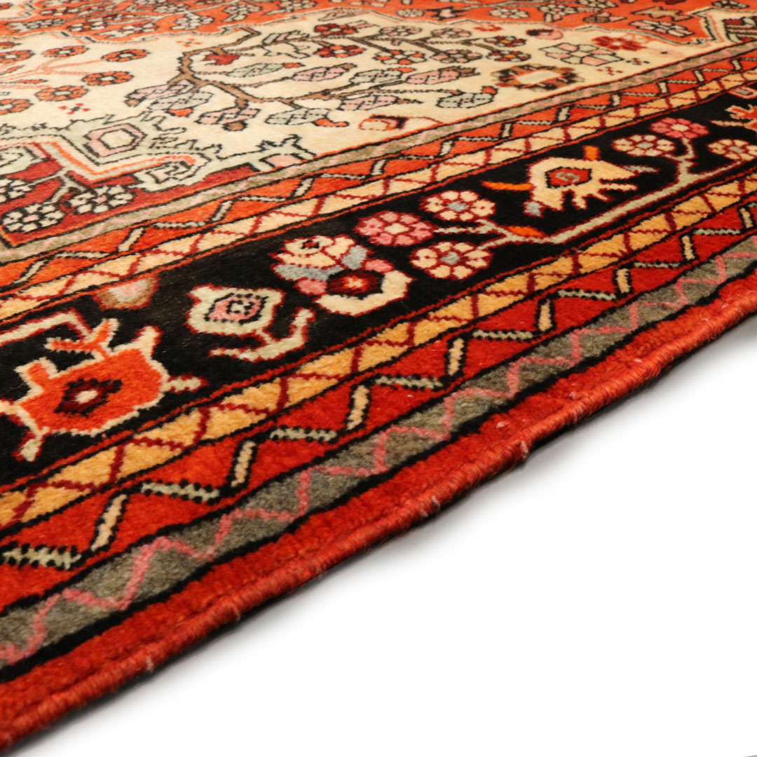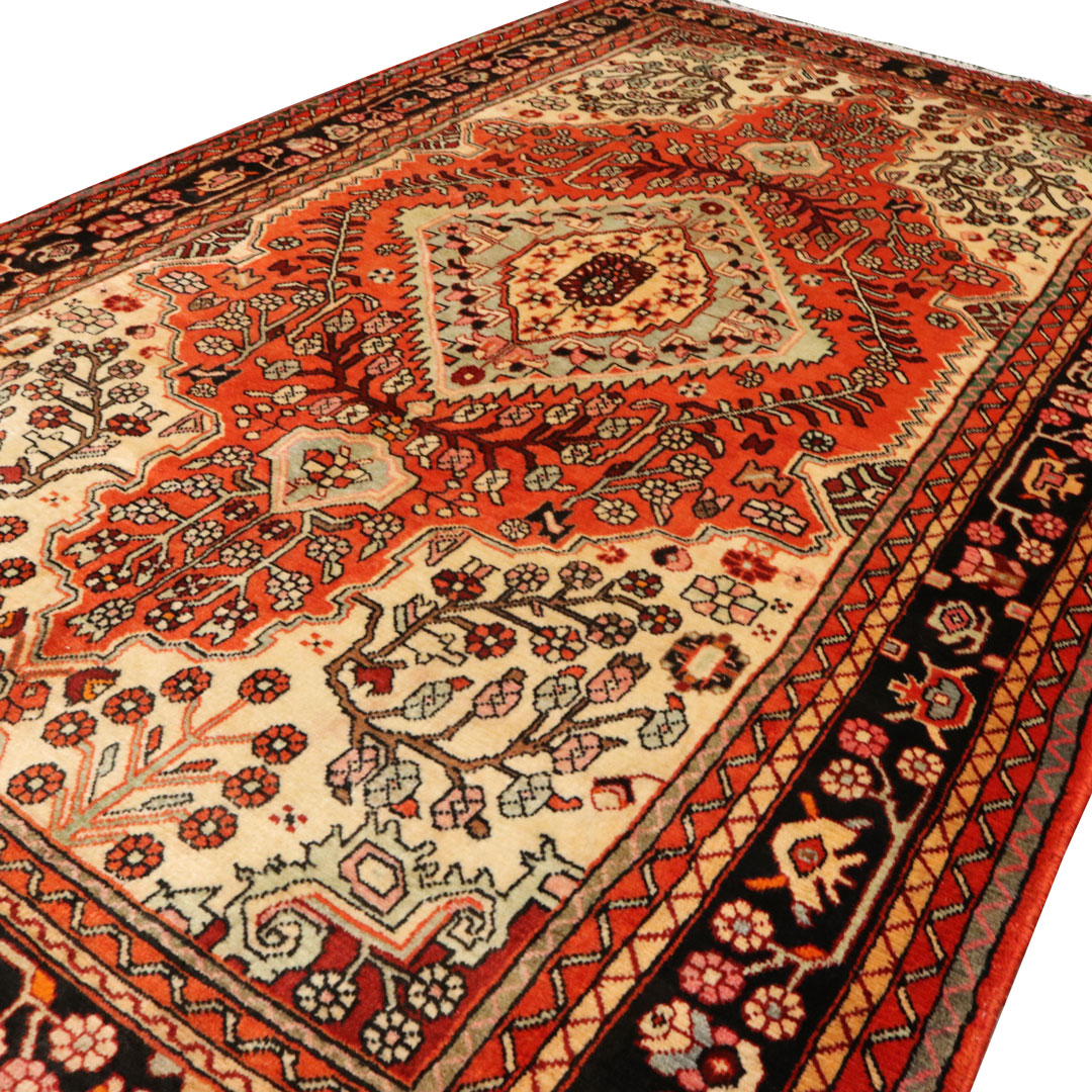قالیچه دست بافت نهاوند با مساحت 3.95 متر مربع و وزن 13.85 کیلوگرم با رنگ زمینه لاکی و حاشیه تیره رنگ با نقشه لچک ترنج