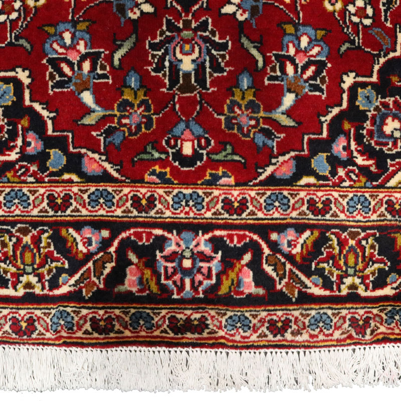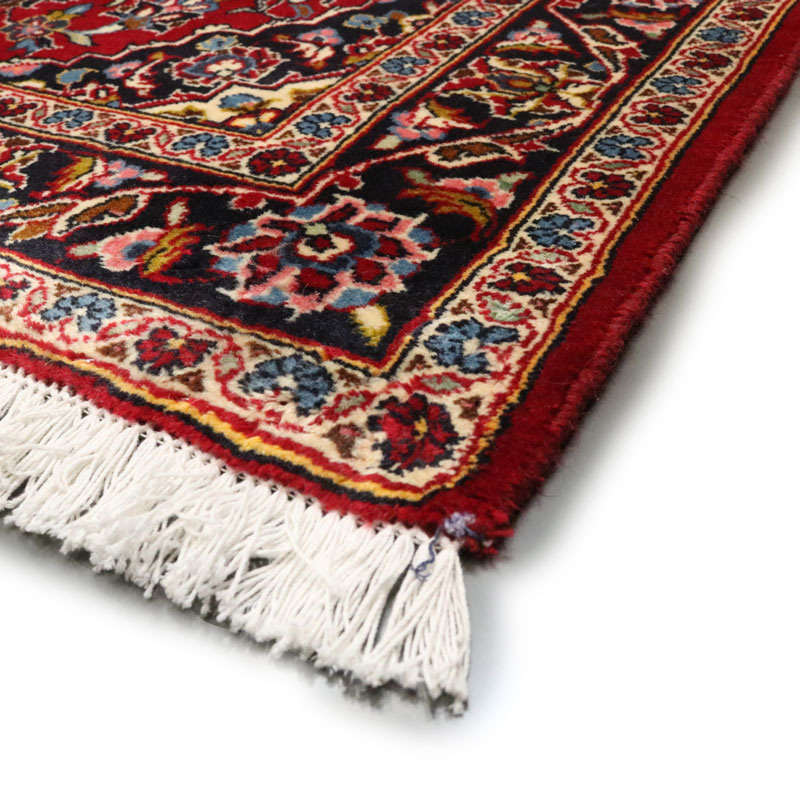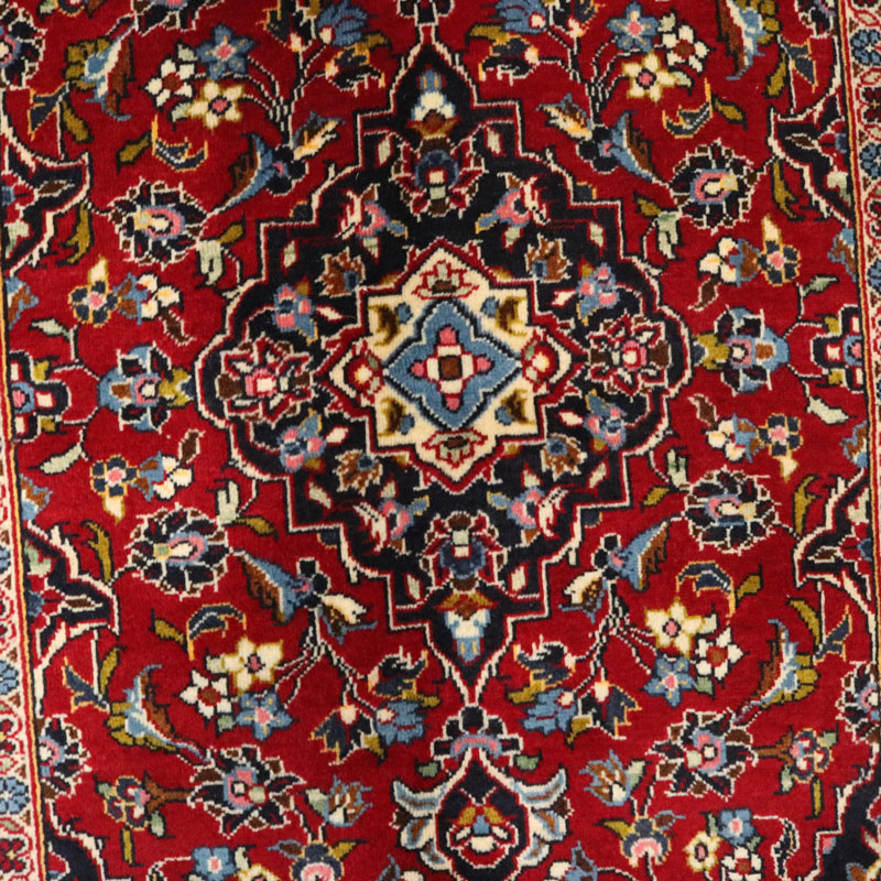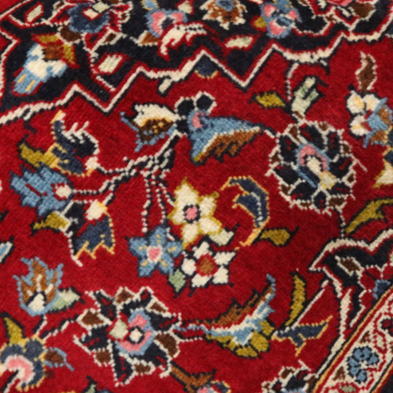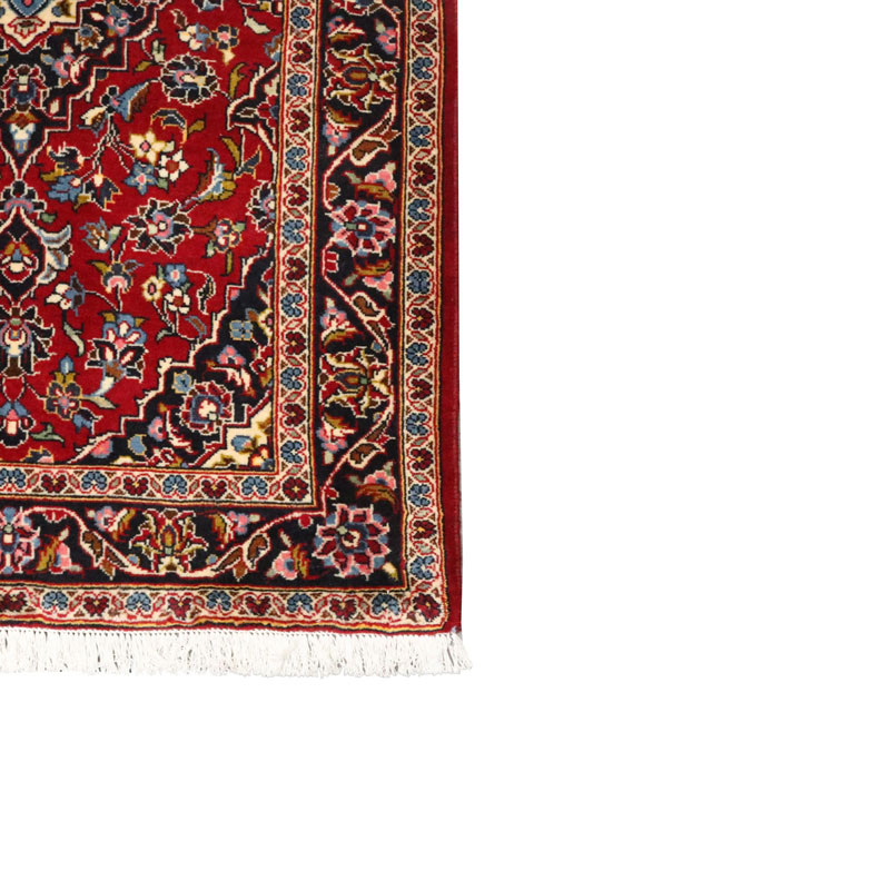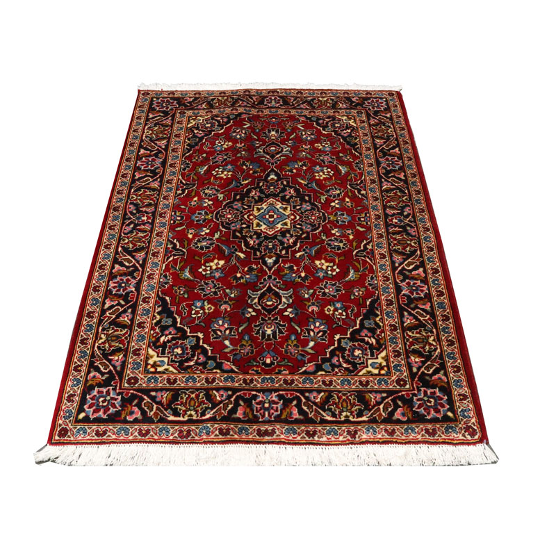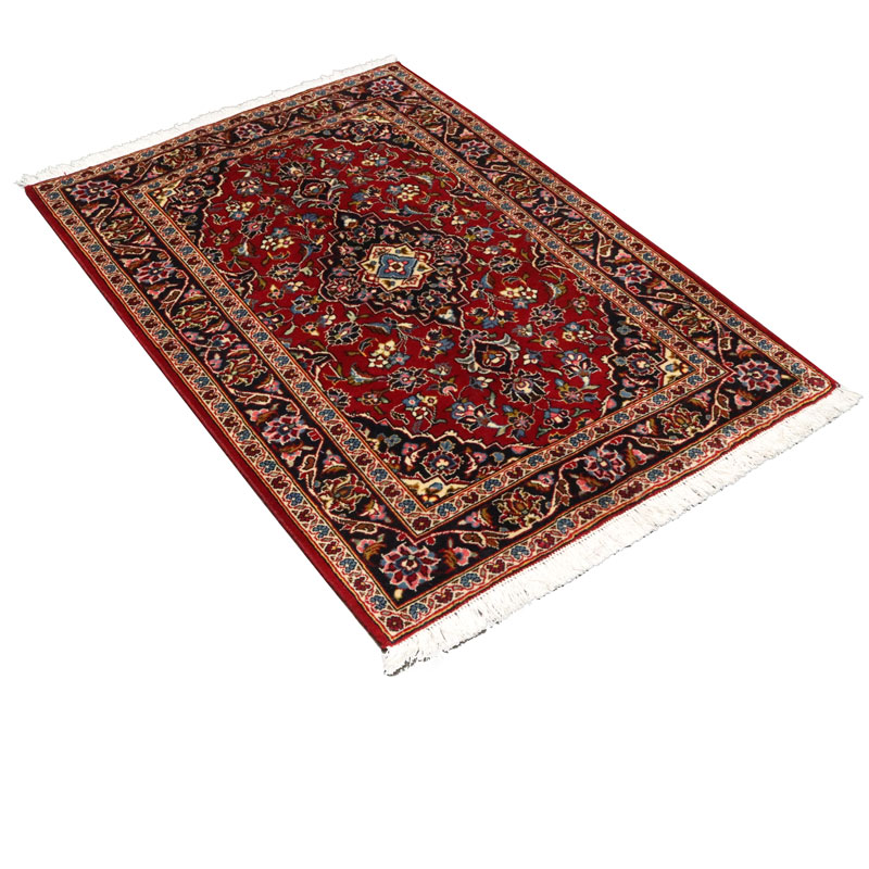 قالیچه دست بافت کاشان با متراژ 1.52 متر مربع و وزن 5.33 کیلوگرم و رنگ متن لاکی و حاشیه سورمه ای با کیفیت بالا میباشد.