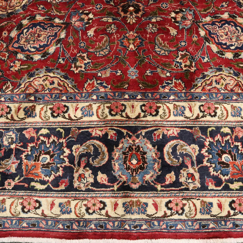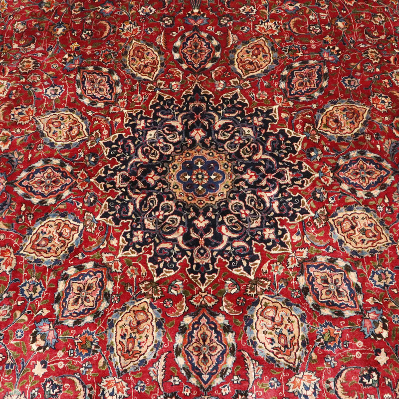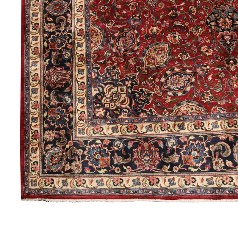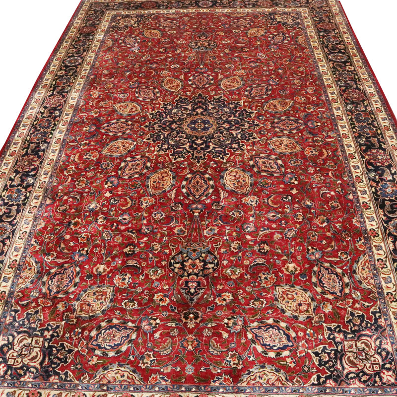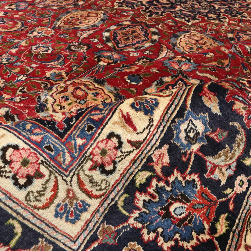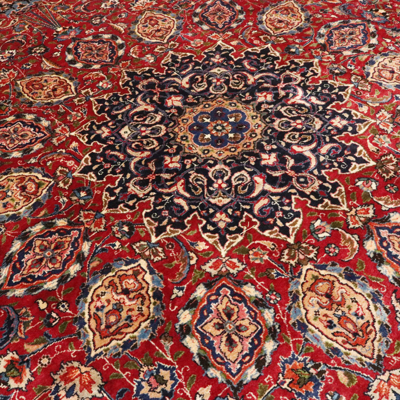 قالی دست بافت مشهد با مساحت 15.9 متر مربع و وزن 55.9 کیلوگرم و نقشه لچک ترنج اسلیمی میباشد.